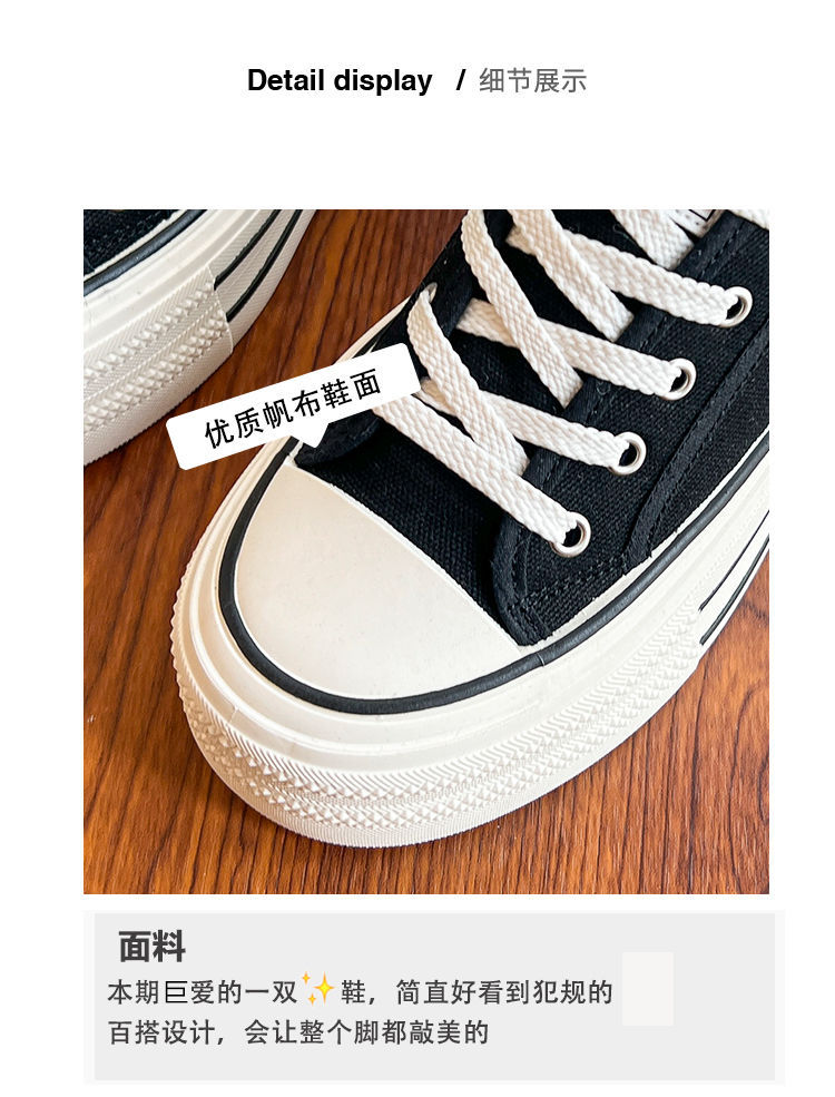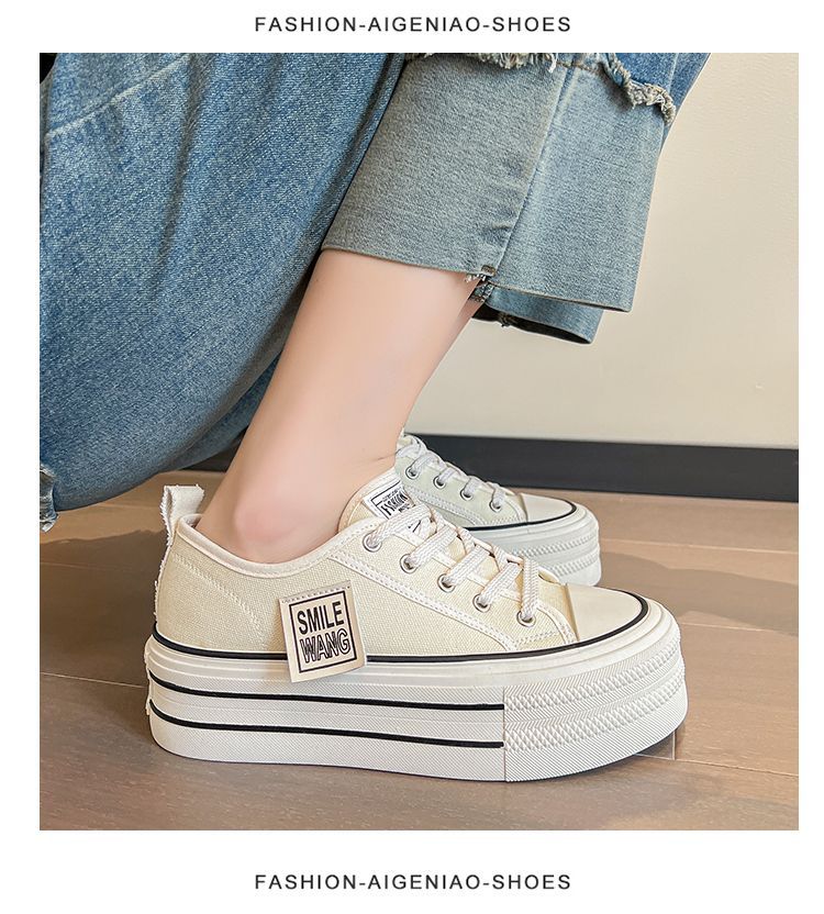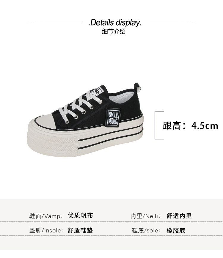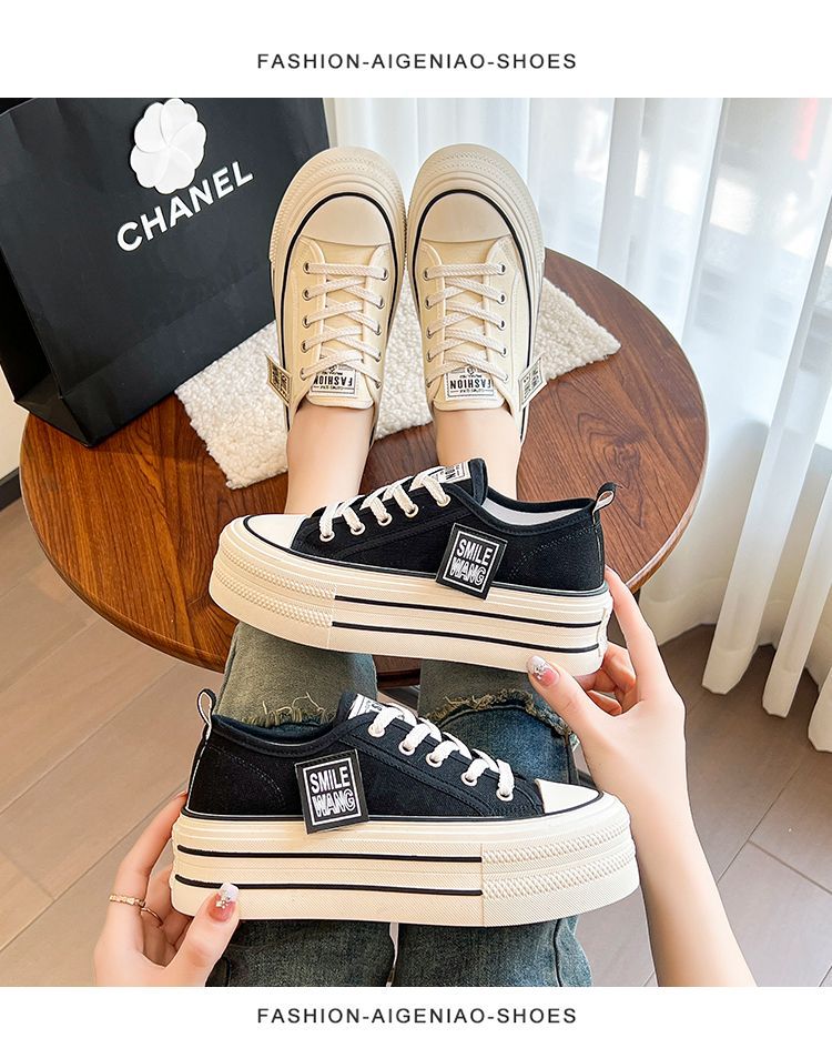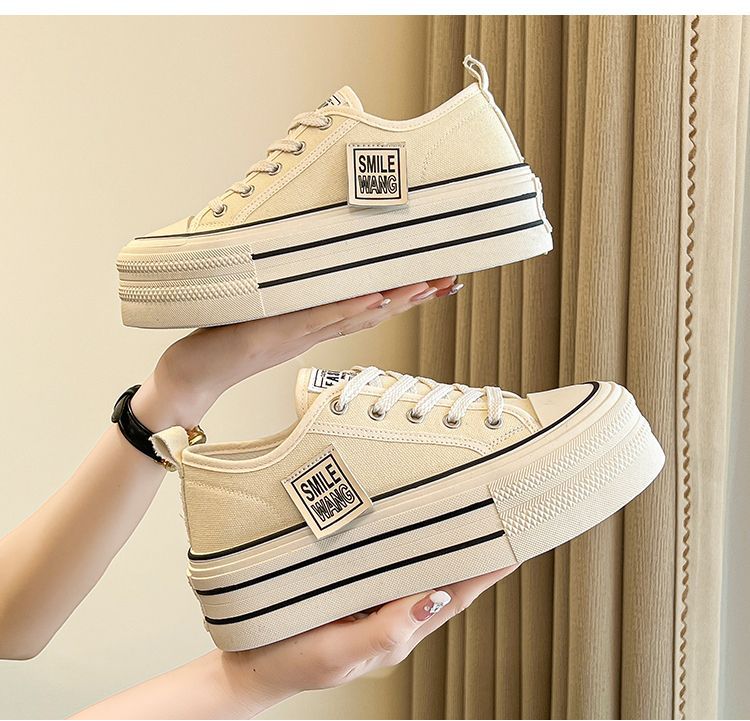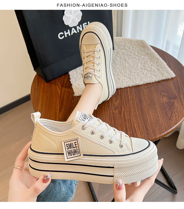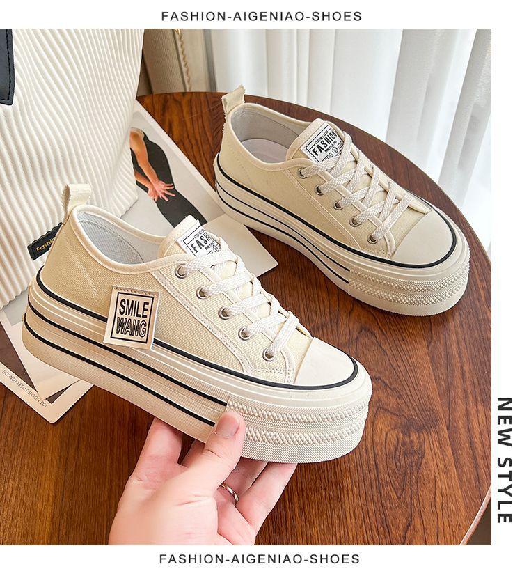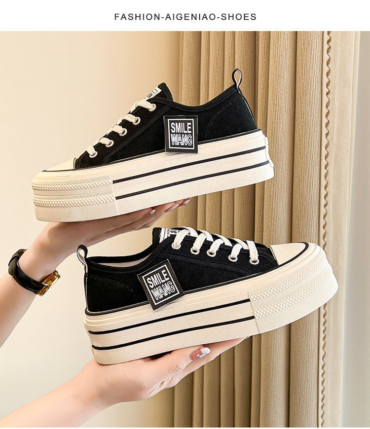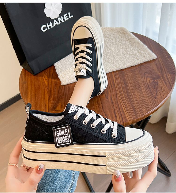 두꺼운 밑창 캔버스 신발 2024 봄과 여름 새로운 한국 스타일의 작은 서양식 레이스 업 로우 탑 보드 신발 여성을위한 인기있는 플랫폼 신발스토어 가기