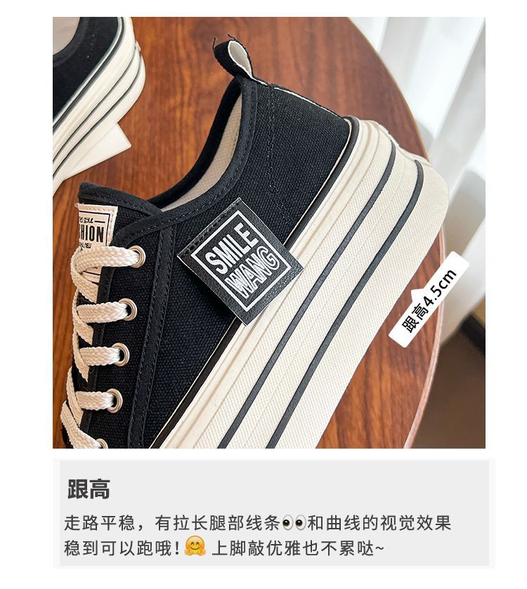 두꺼운 밑창 캔버스 신발 2024 봄과 여름 새로운 한국 스타일의 작은 서양식 레이스 업 로우 탑 보드 신발 여성을위한 인기있는 플랫폼 신발