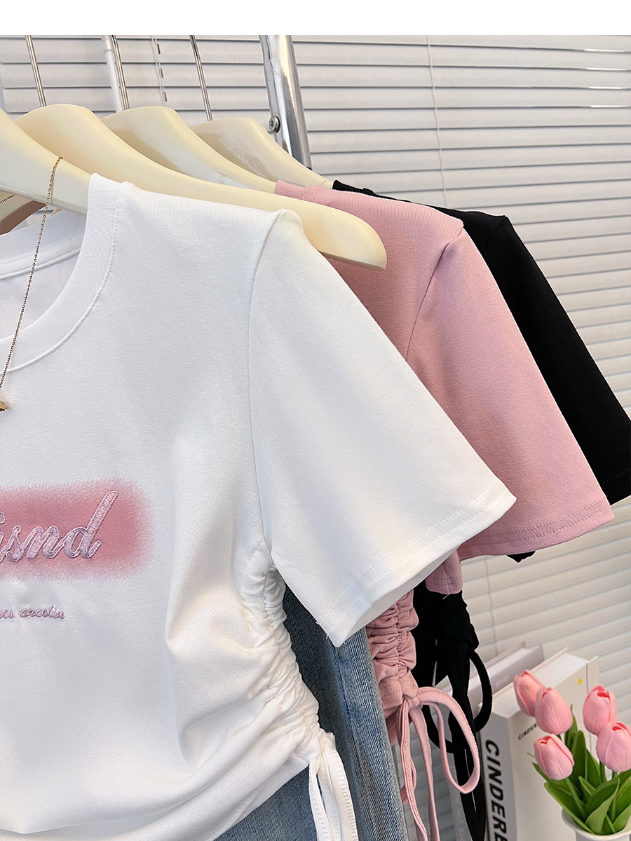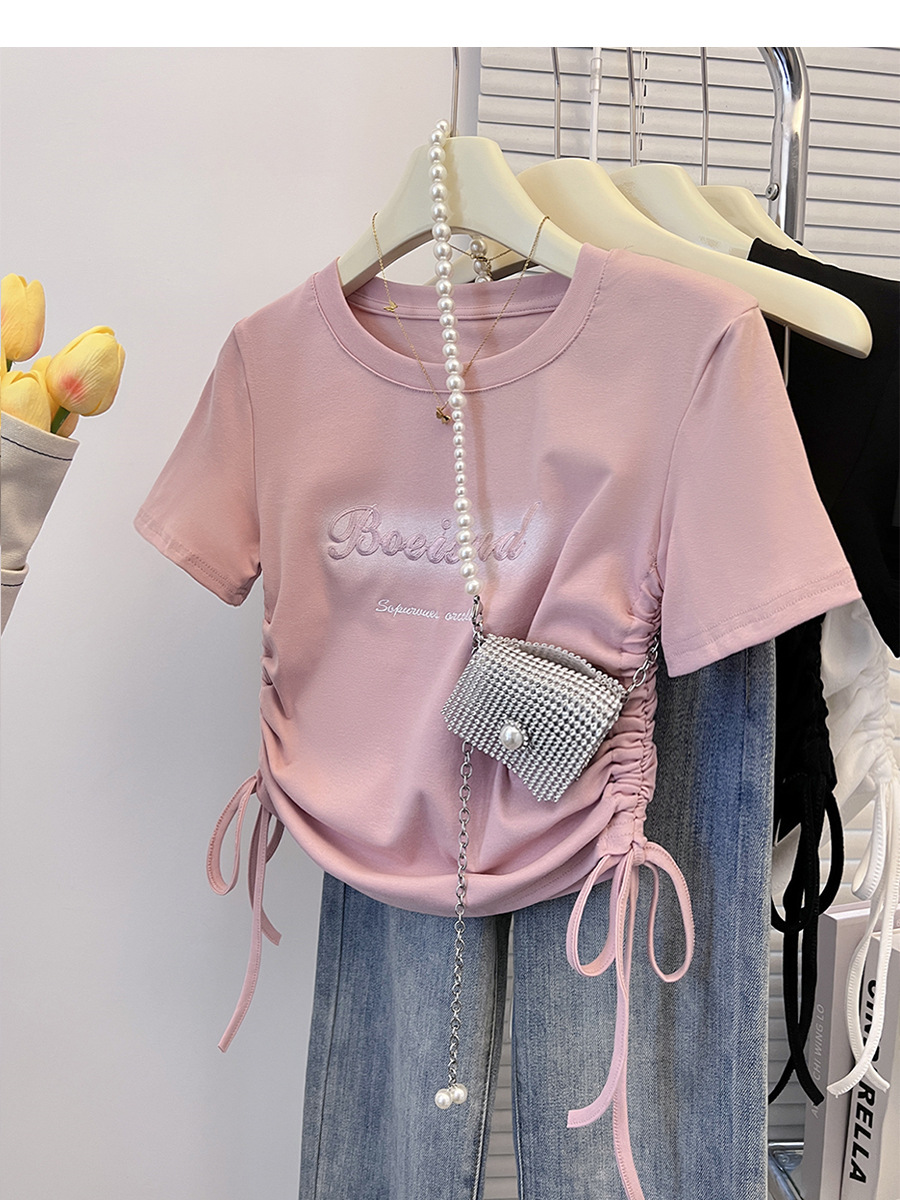 여성을위한 미국 오른쪽 어깨 반팔 티셔츠 여름 새로운 얼음 실크 슬림 짧은 티셔츠 drawstring girls top