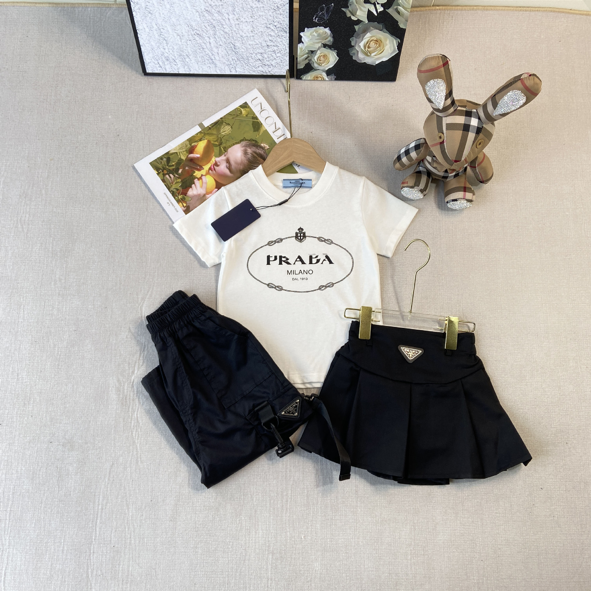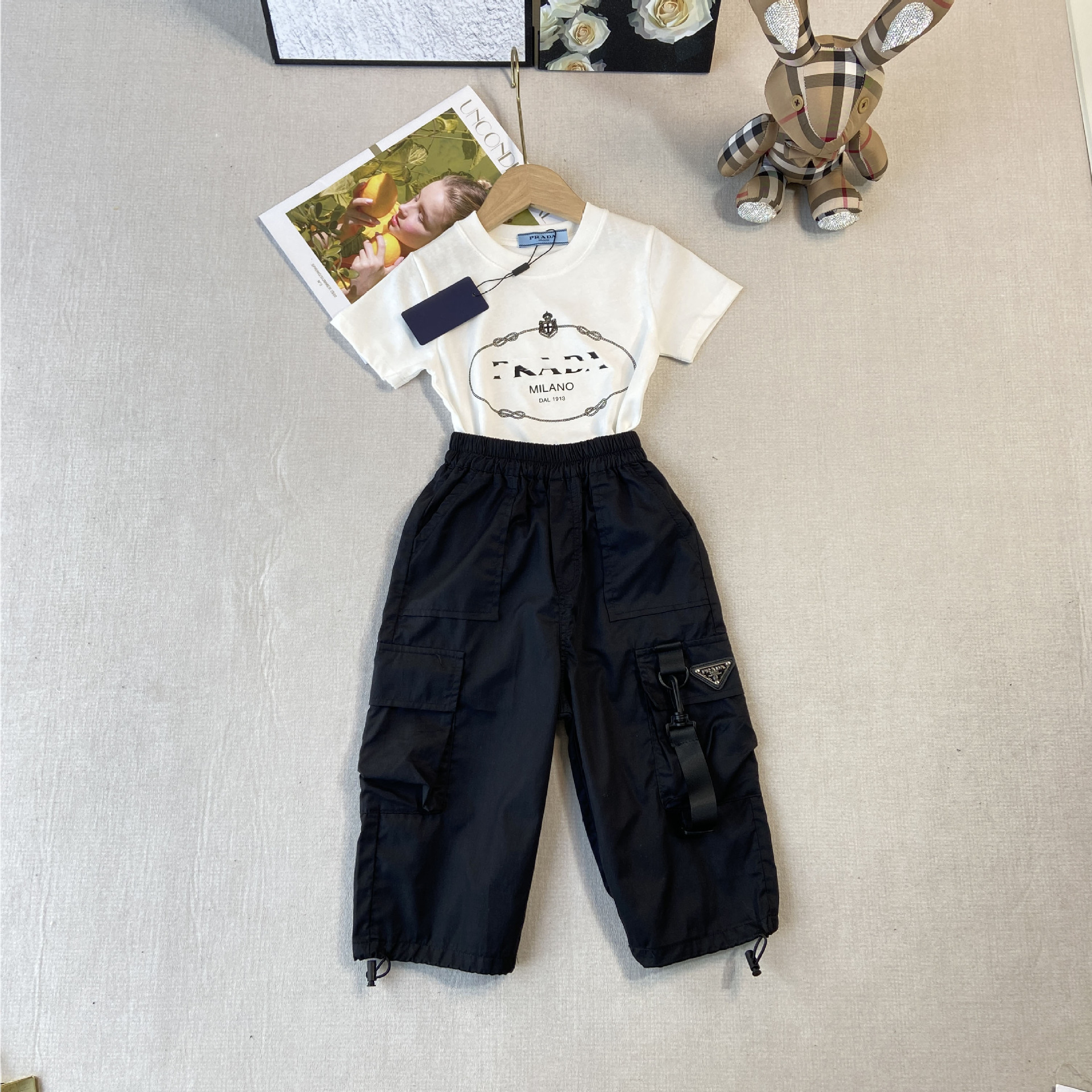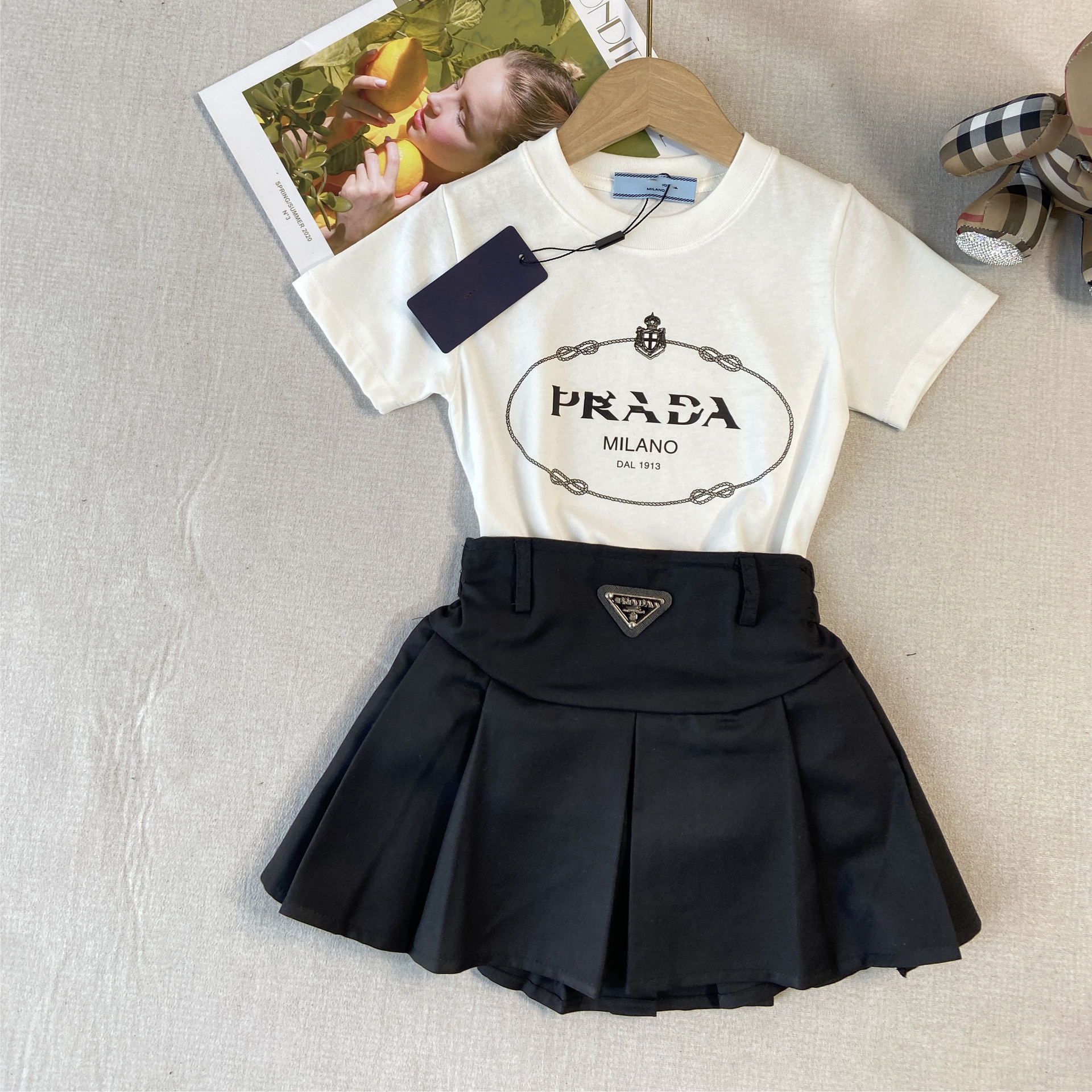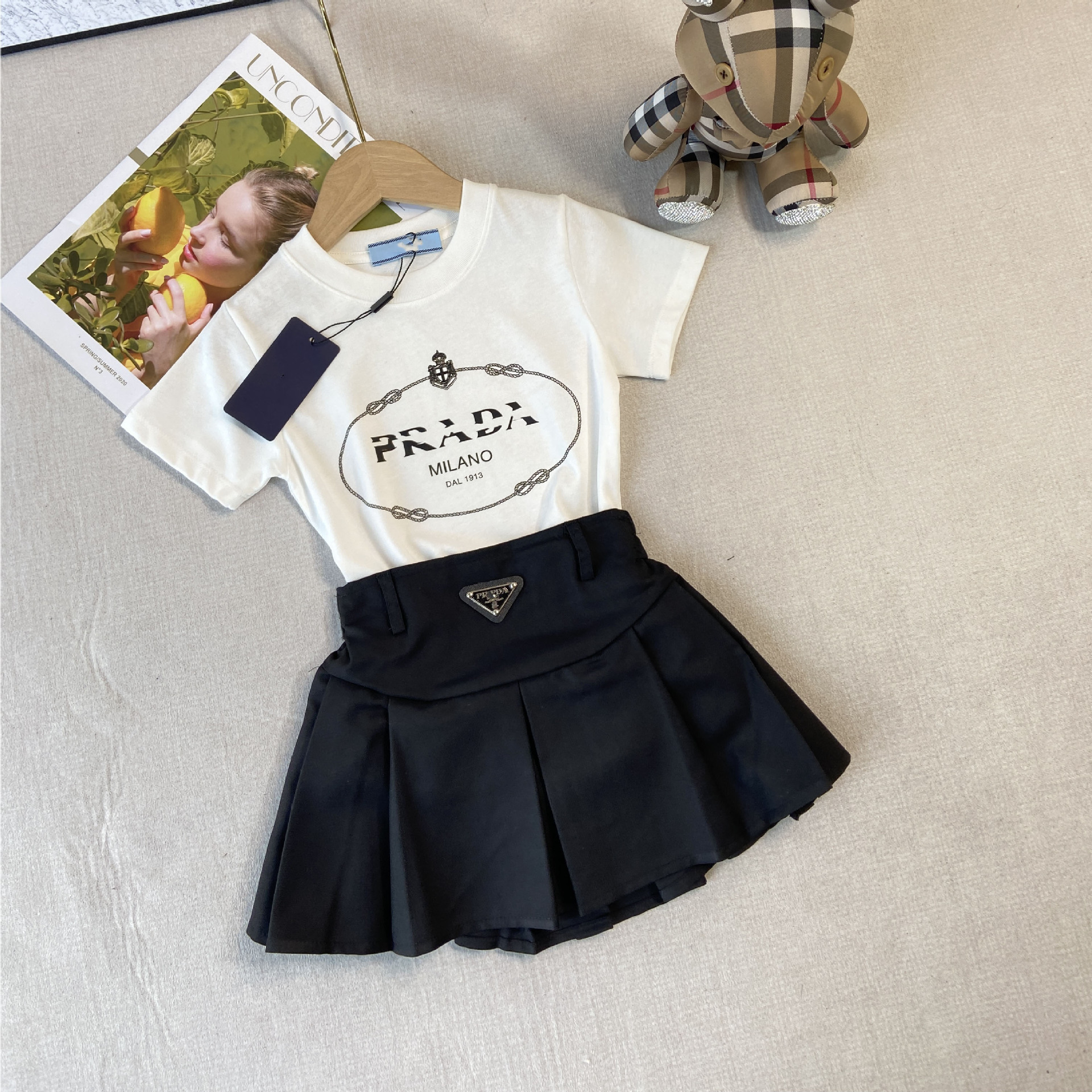 한국판 아동복 형제 자매 소녀 프린트 티셔츠 탑 주름 치마 소년 둥근 목 바지 7 점 바지