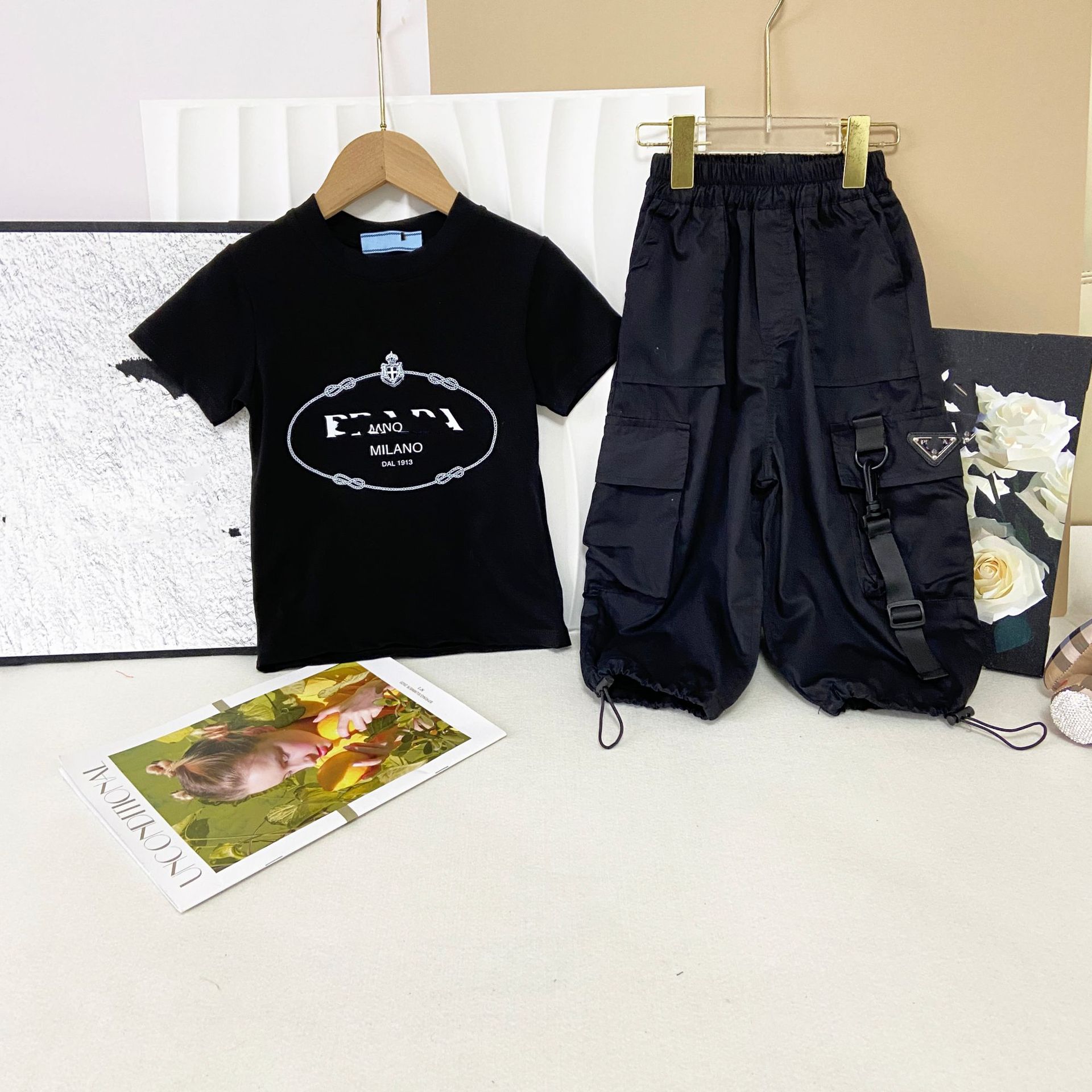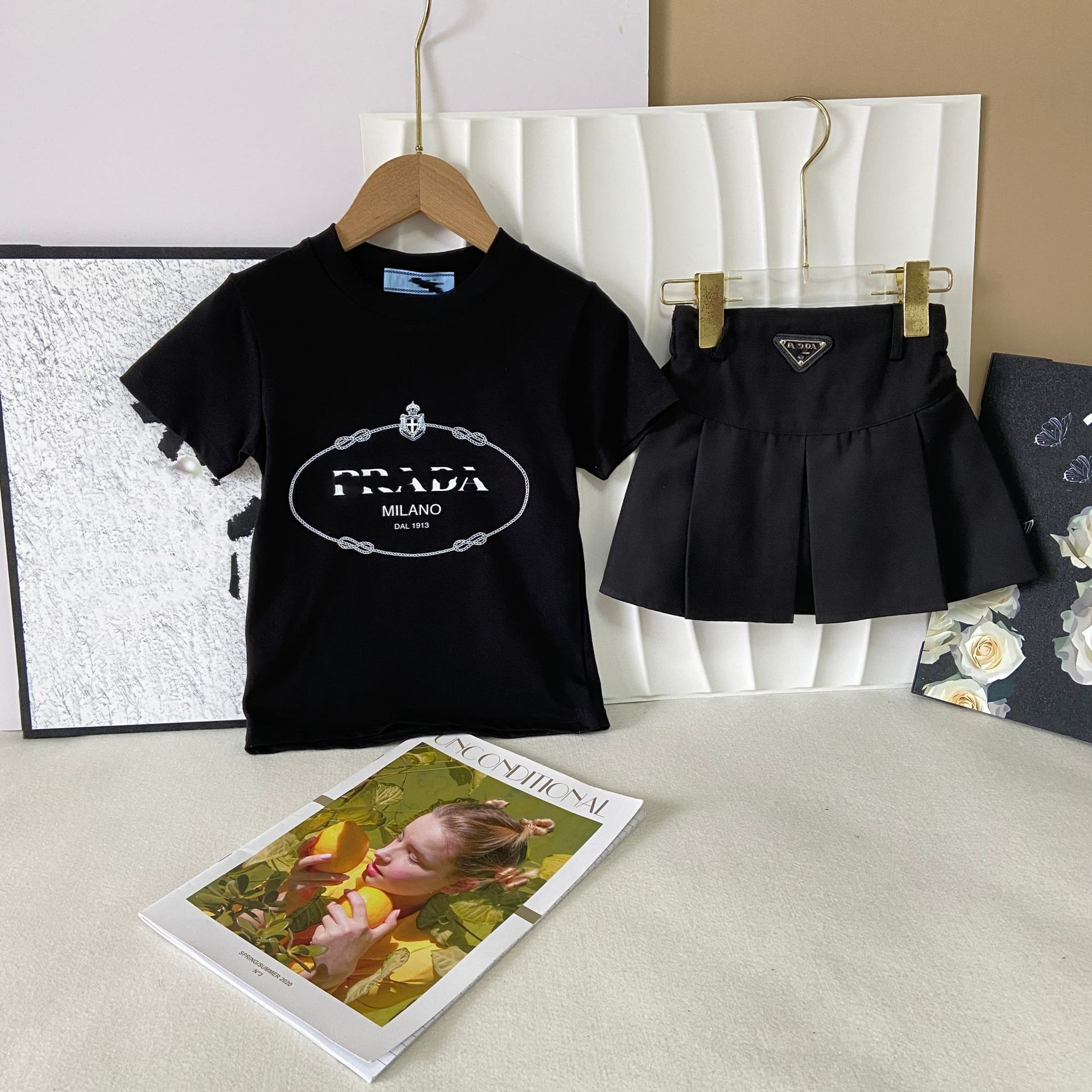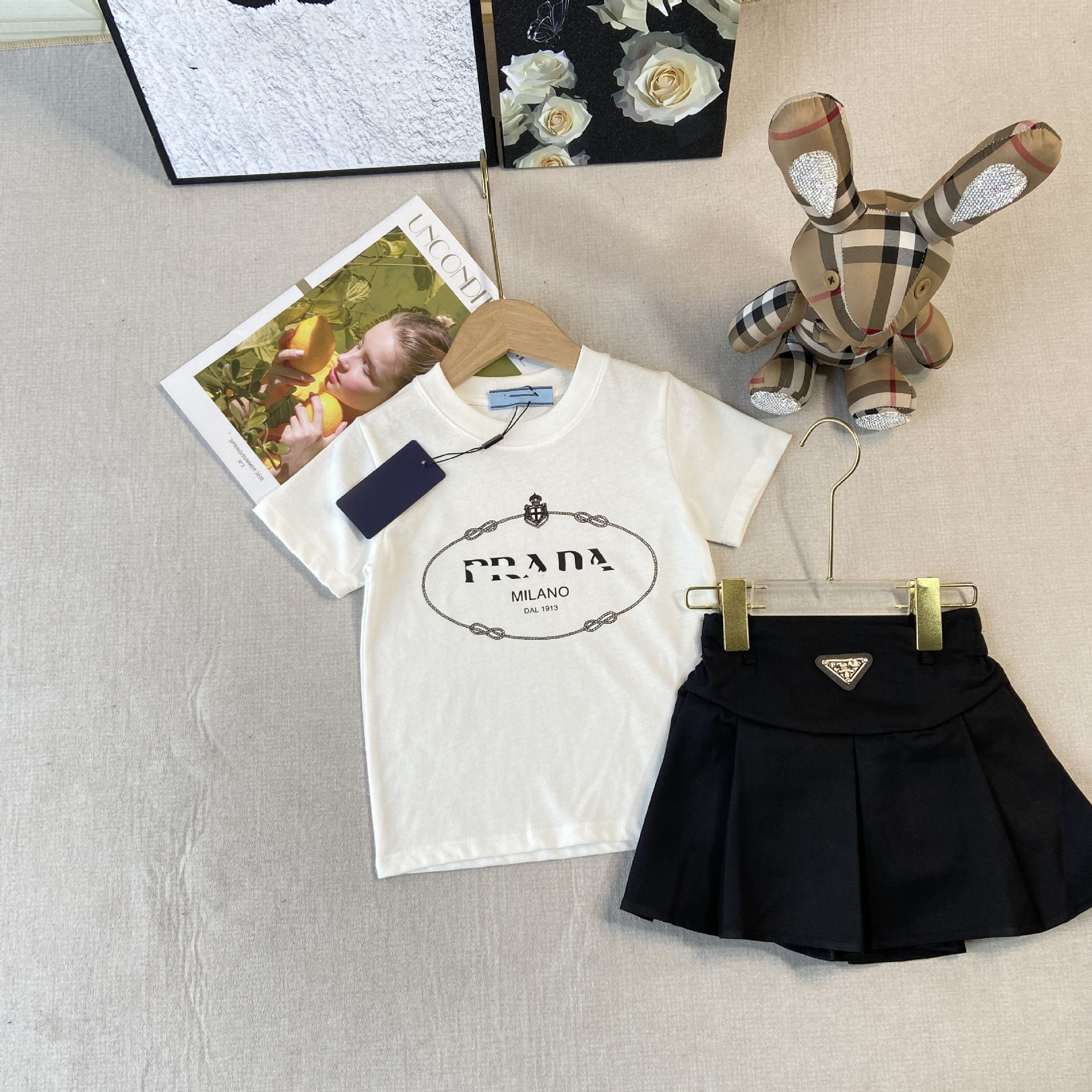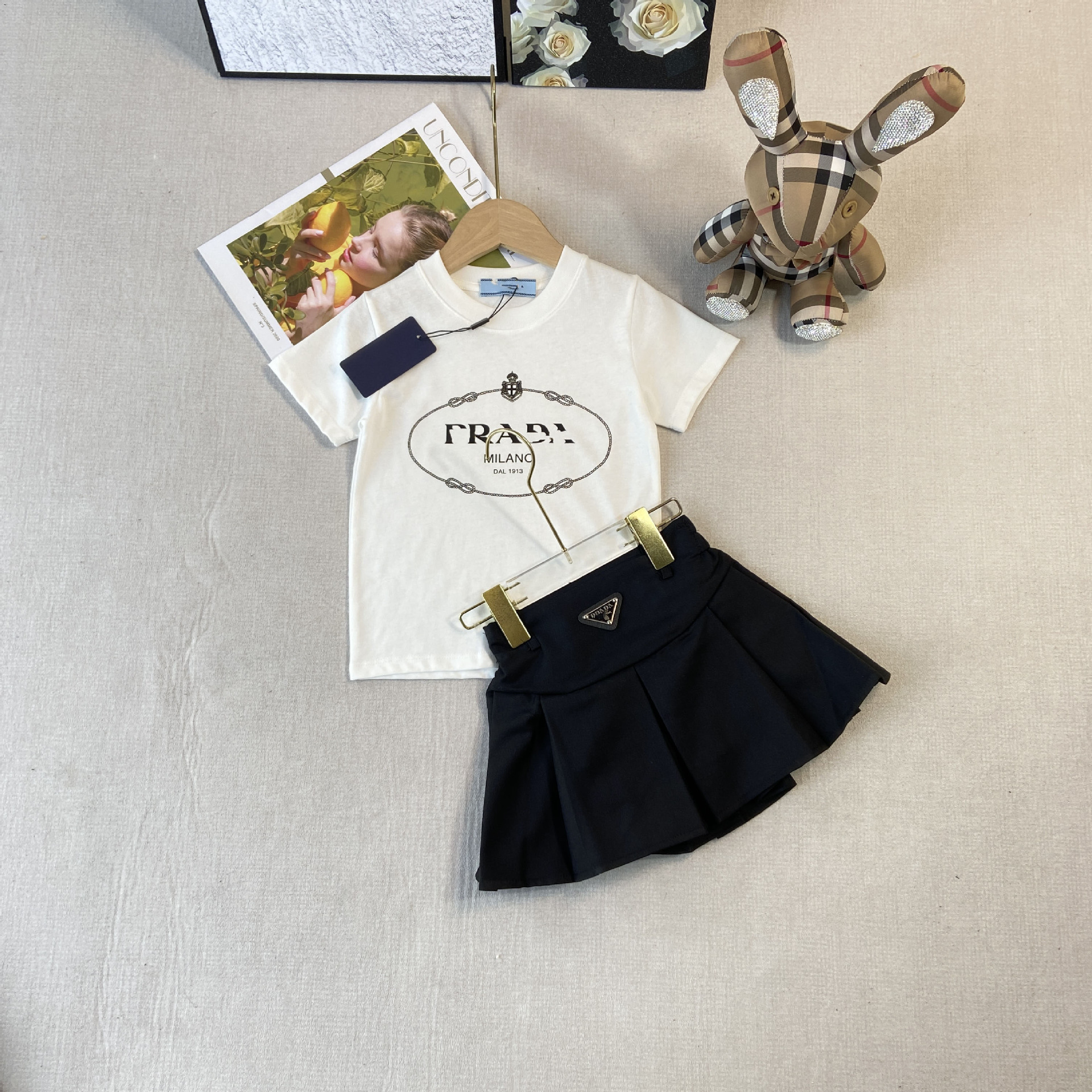 한국판 아동복 형제 자매 소녀 프린트 티셔츠 탑 주름 치마 소년 둥근 목 바지 7 점 바지