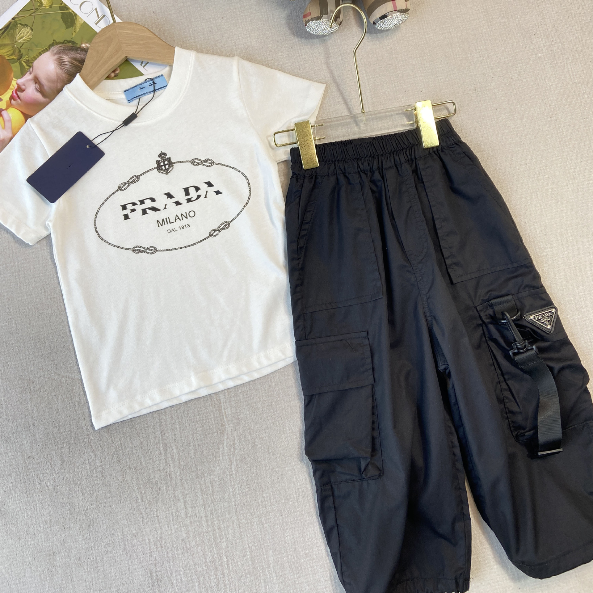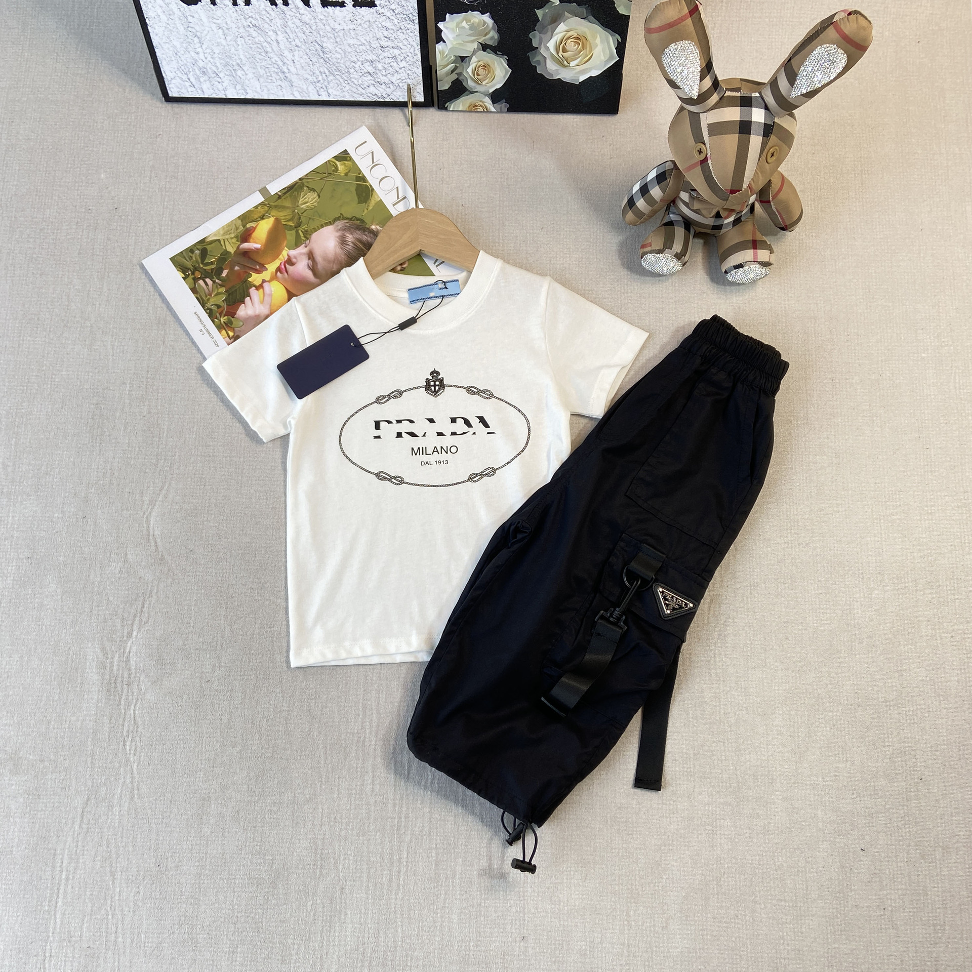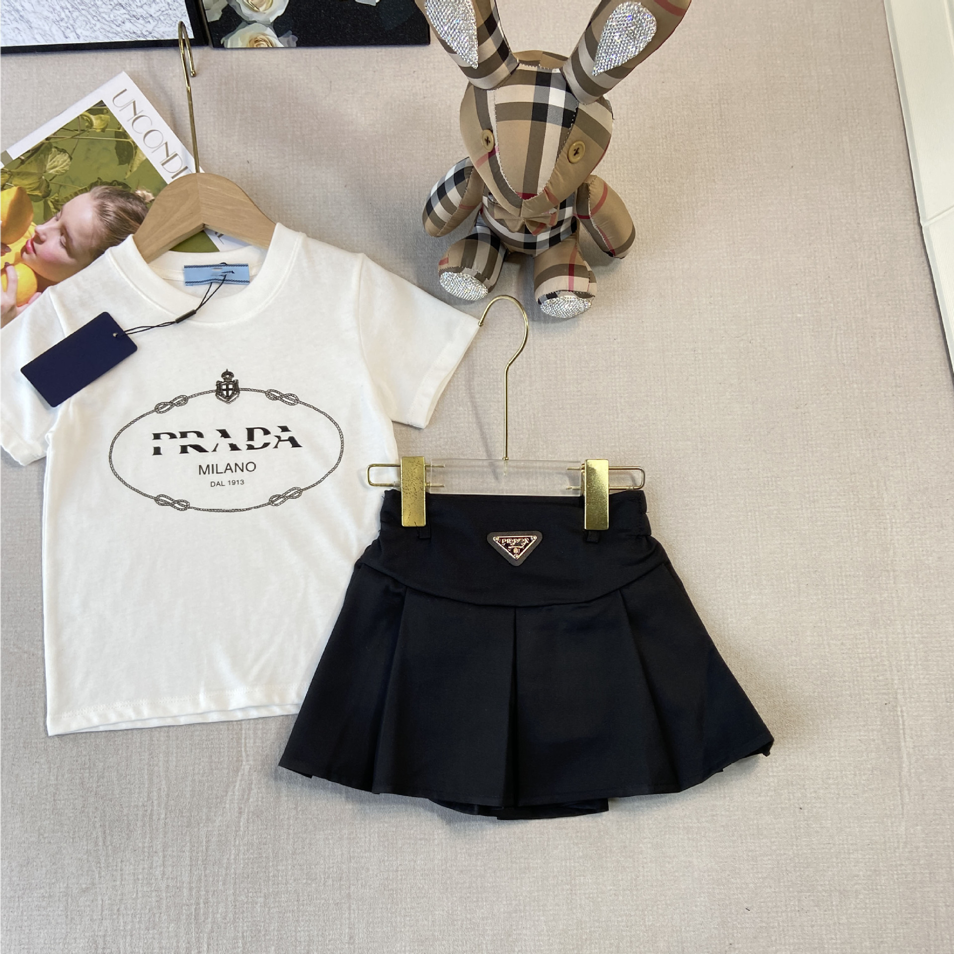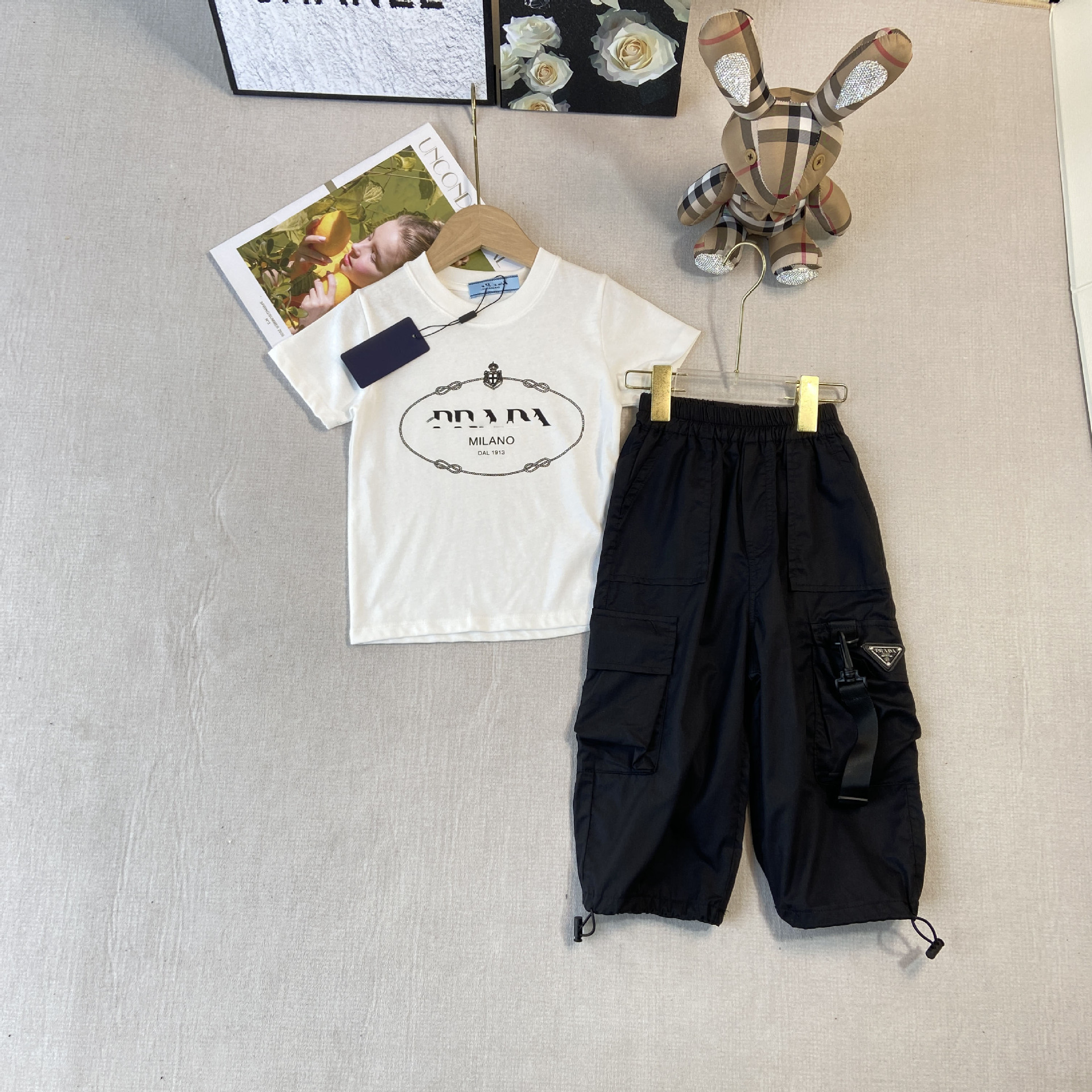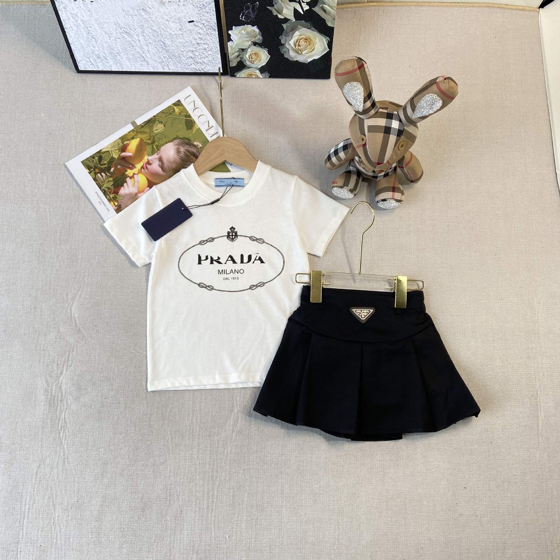 한국판 아동복 형제 자매 소녀 프린트 티셔츠 탑 주름 치마 소년 둥근 목 바지 7 점 바지