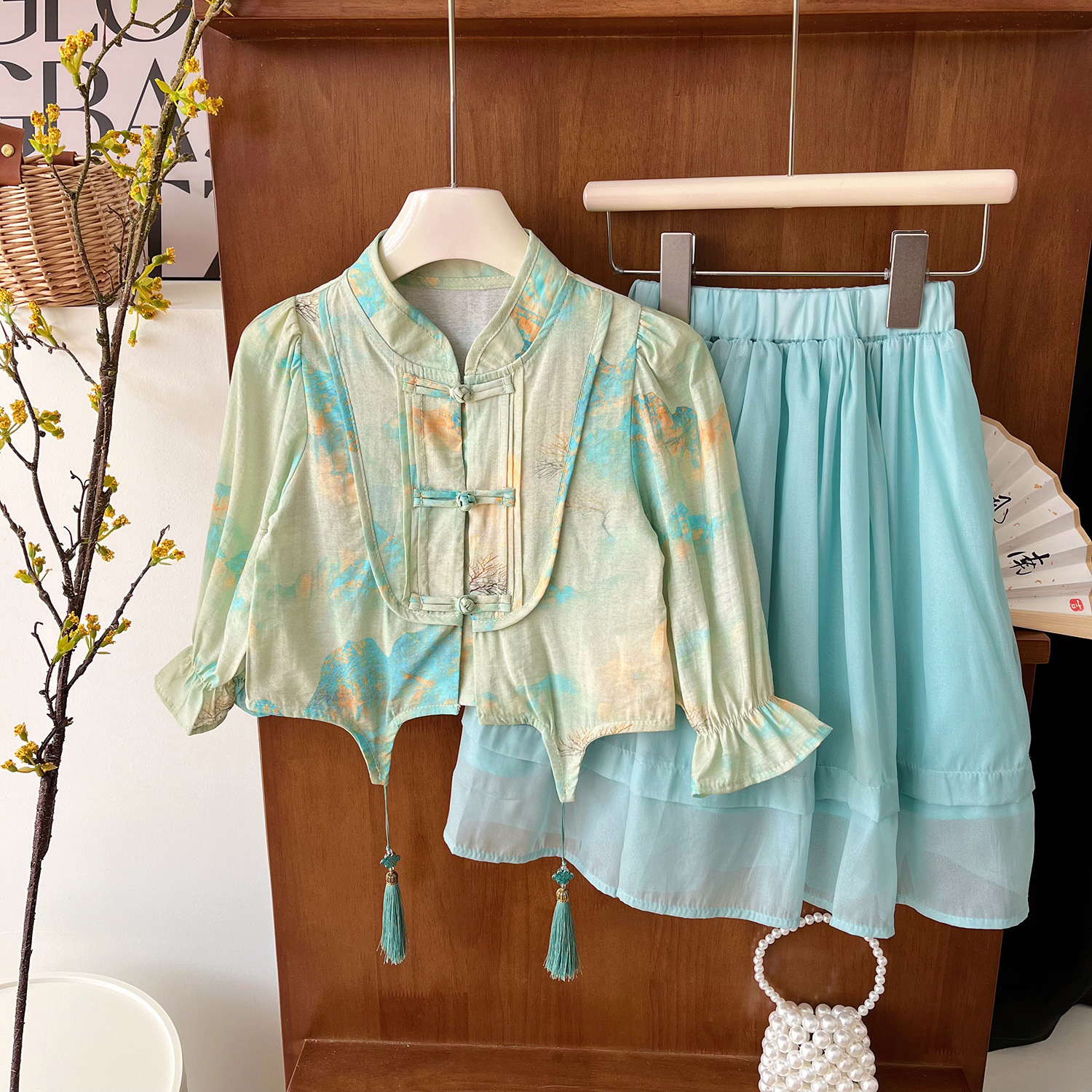 여자 한푸 세트 2024 여름 새로운 국가 스타일 긴팔 셔츠 스커트 투피스 세트