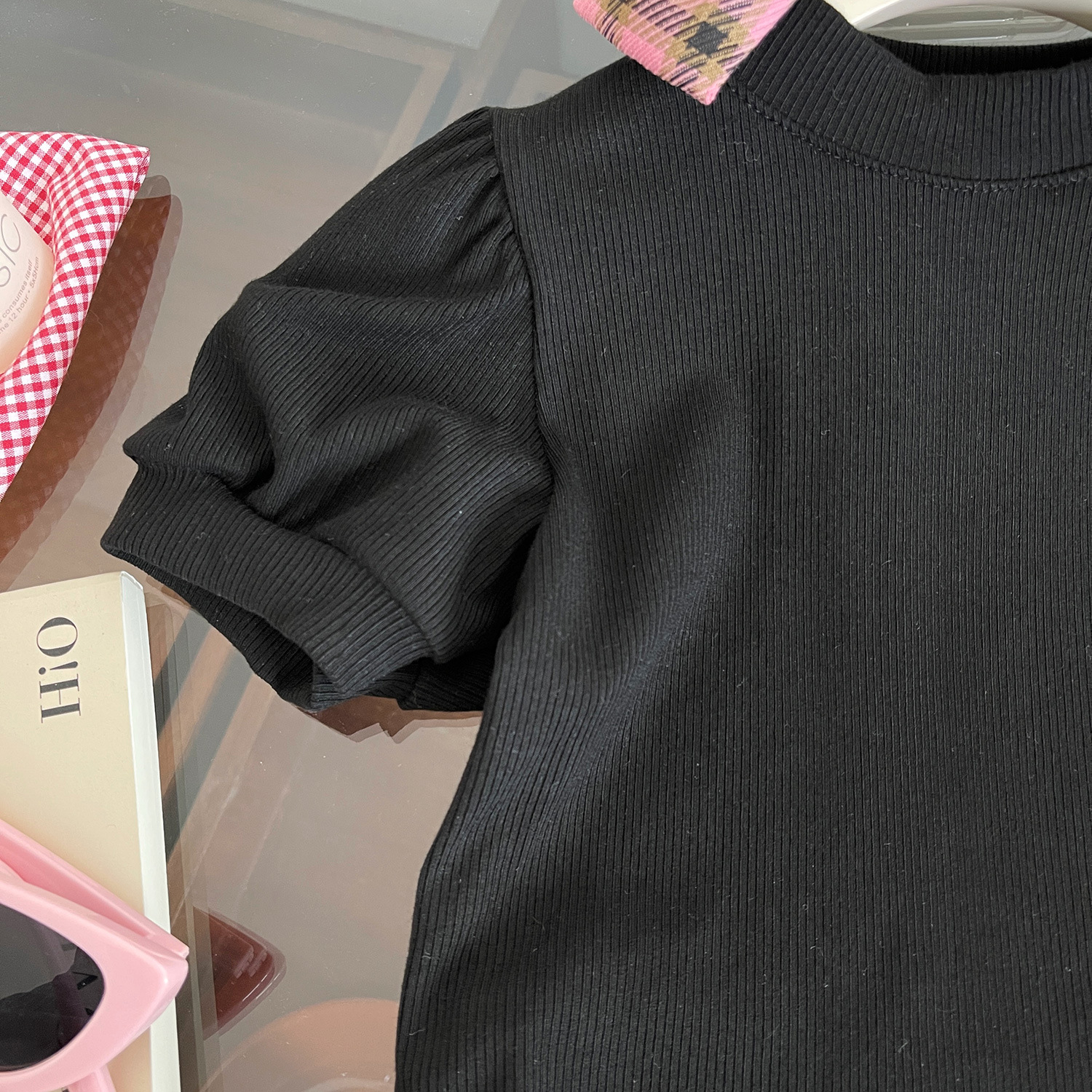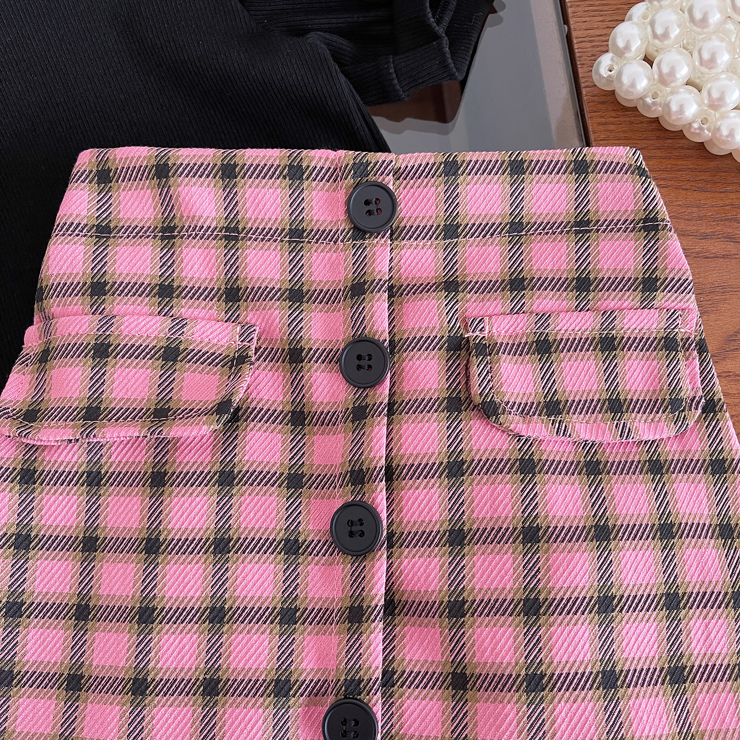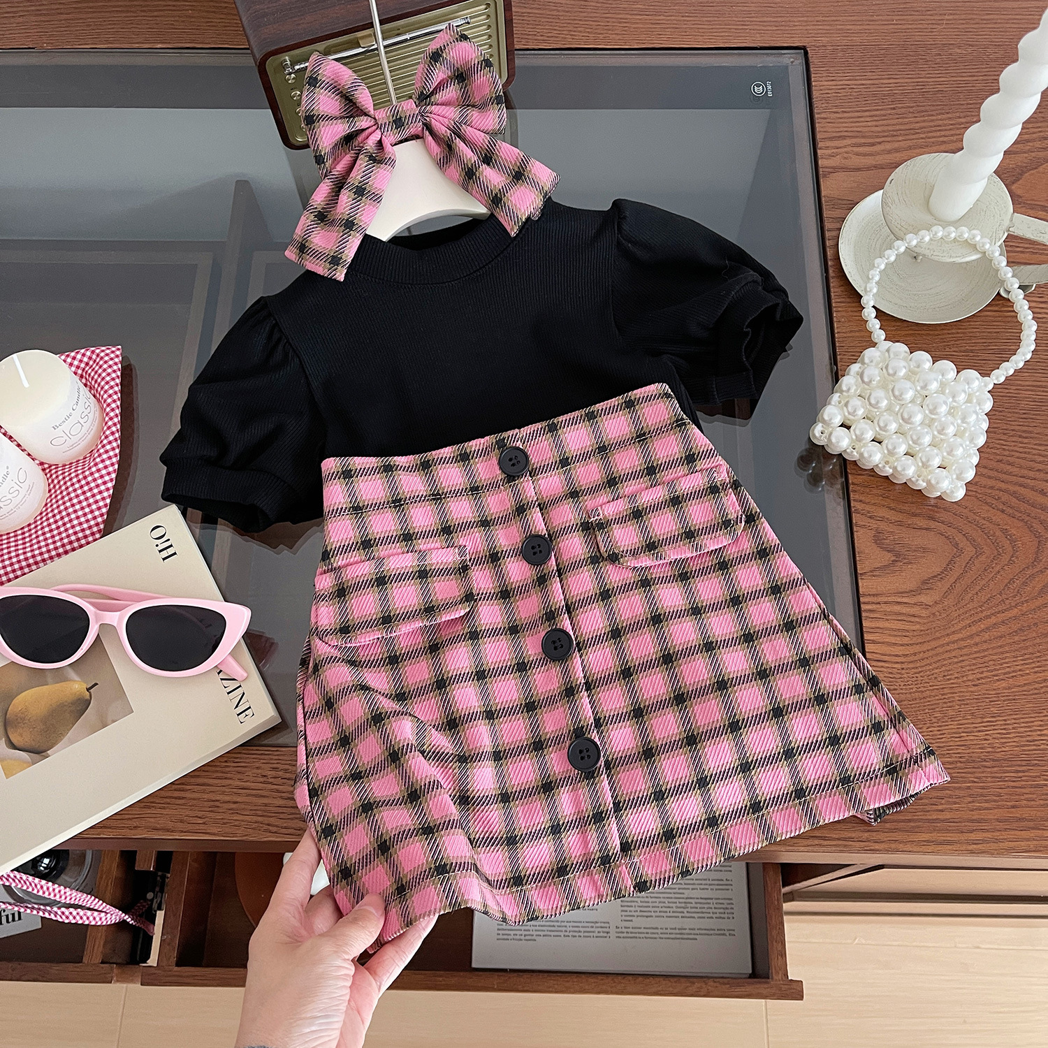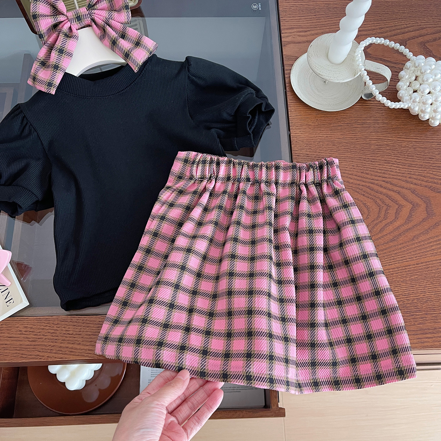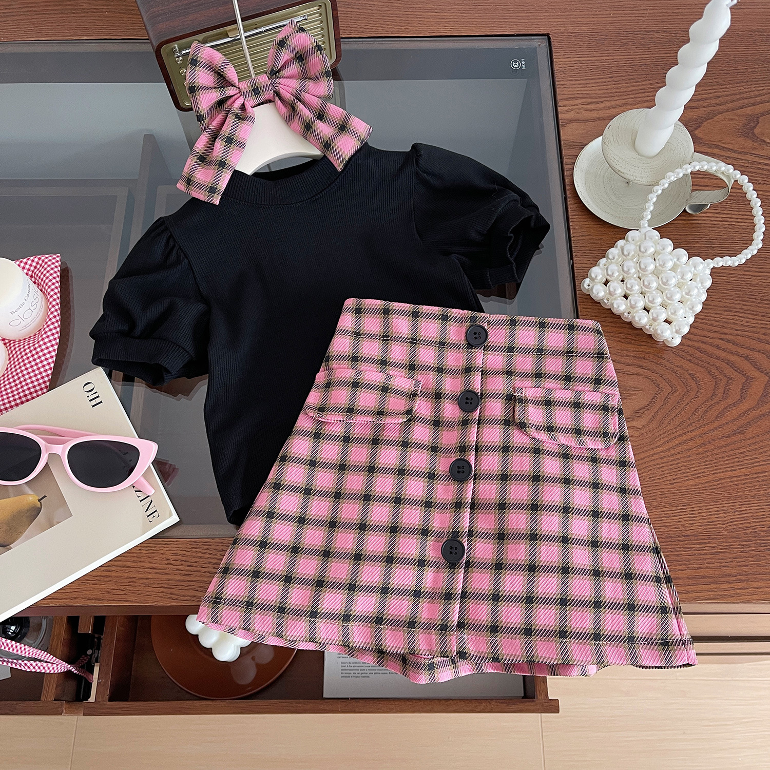 소녀 세트 2024 여름 새로운 한국 스타일 소녀 퍼프 슬리브 티셔츠 핑크 격자 무늬 스커트 투피스 세트스토어 가기