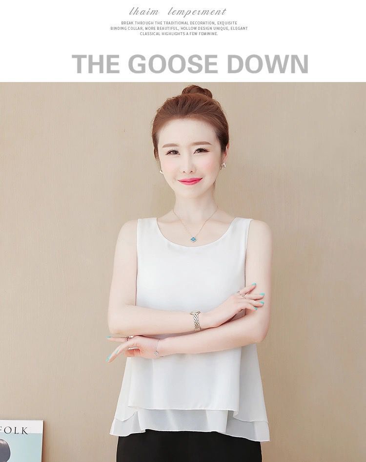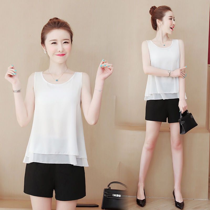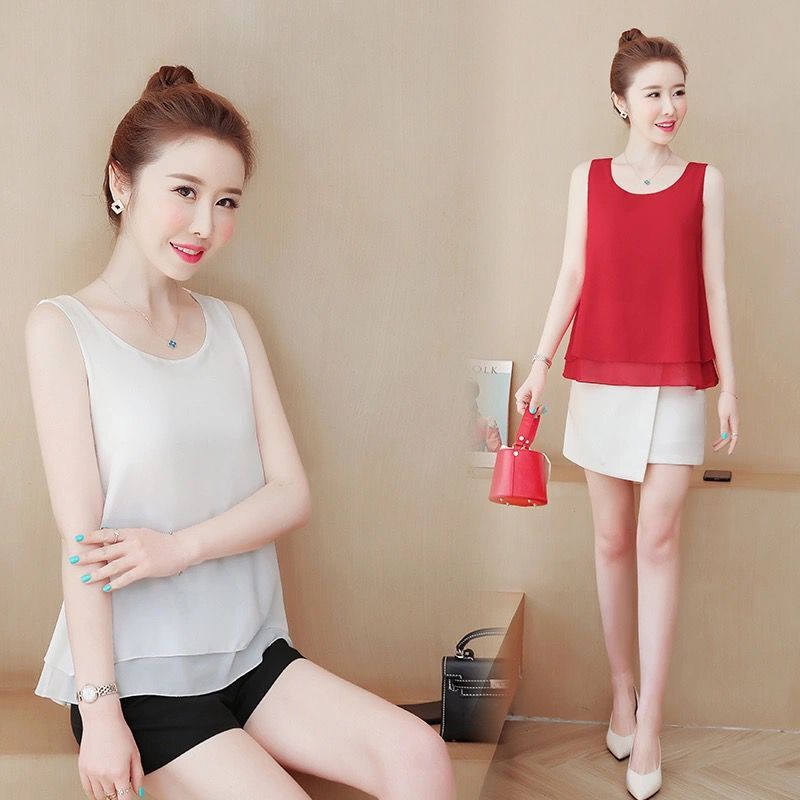 여름 2024 더블 레이어 쉬폰 카미 솔 여성용 내부 느슨한 쉬폰 셔츠 여성용 민소매 탑베이스 쇼트 아우터웨어스토어 가기