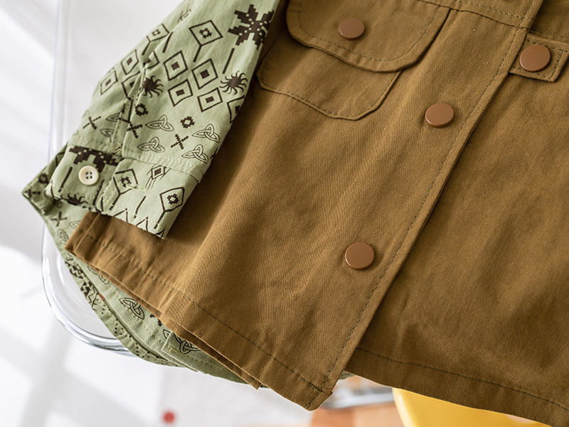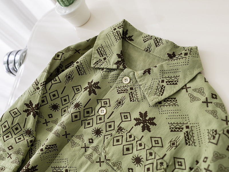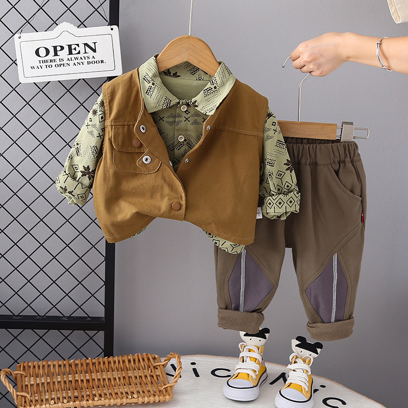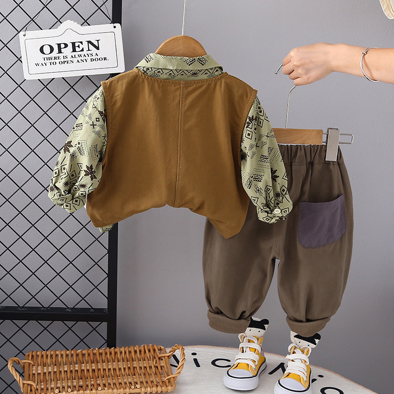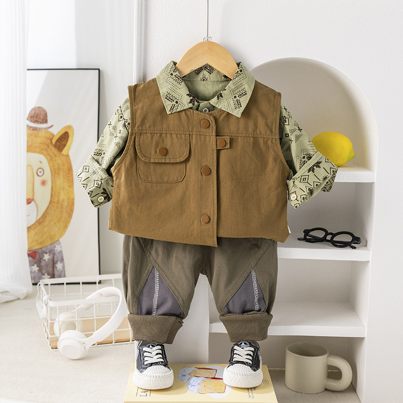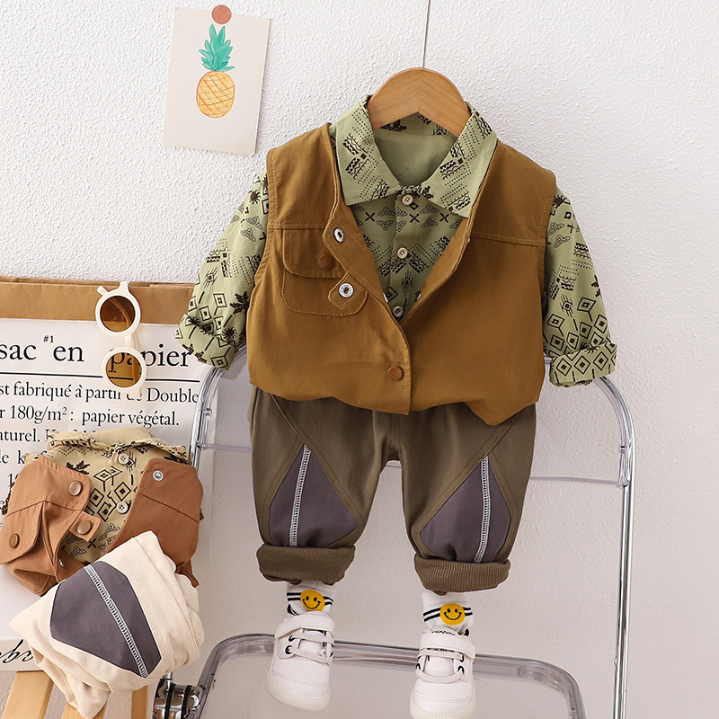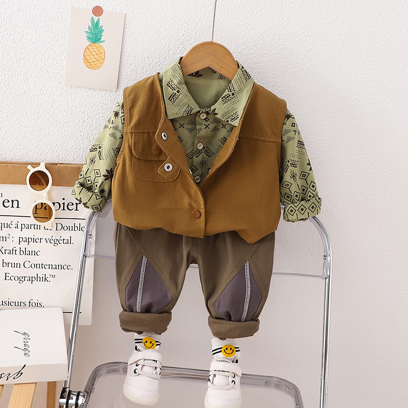 5 개의 작은 7 개의 아동복 2024 봄과 가을 새로운 0-5 세 소년 소녀 풀 프린트 셔츠 캐주얼 조끼 3 피스 세트