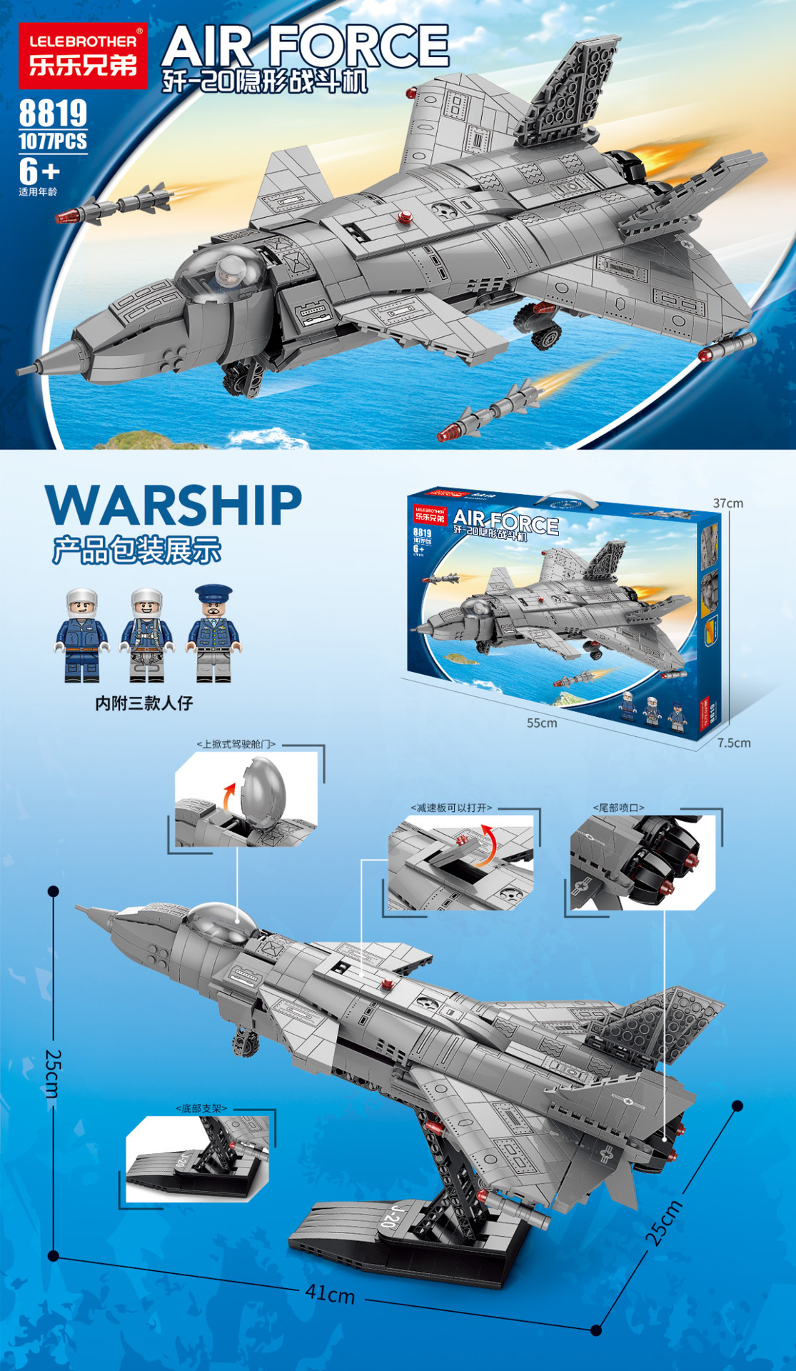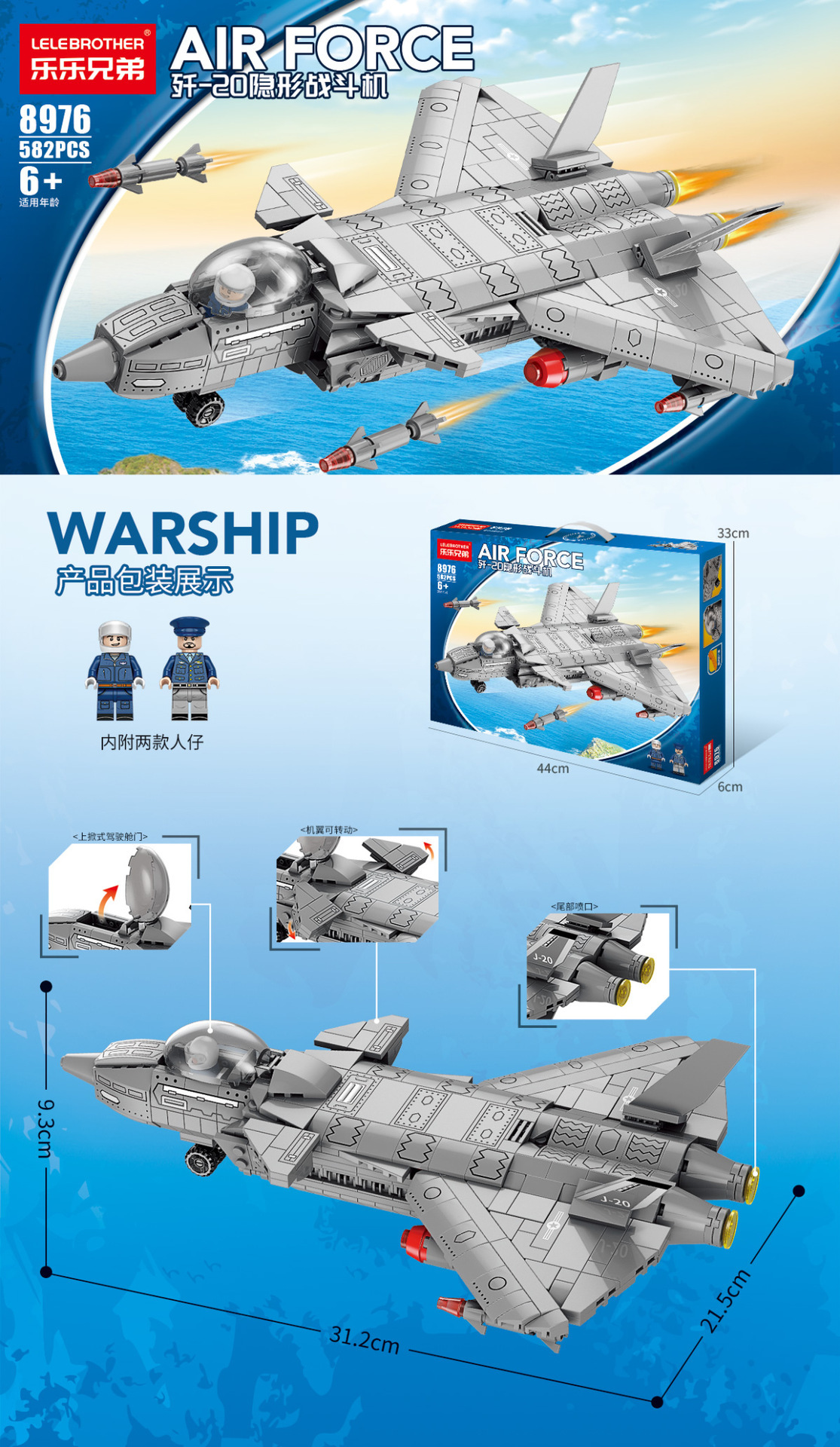 • 8837 J-20 스텔스 전투기 1924 입자 [초대형 휴대용 컬러 박스] + 무료 미니피규어 3개