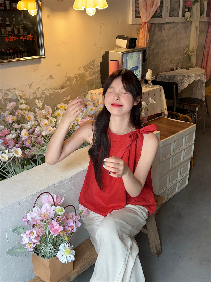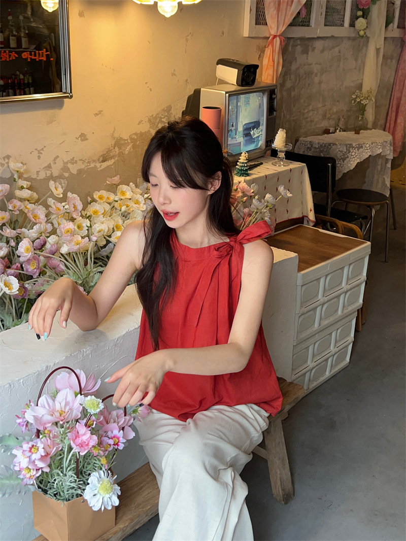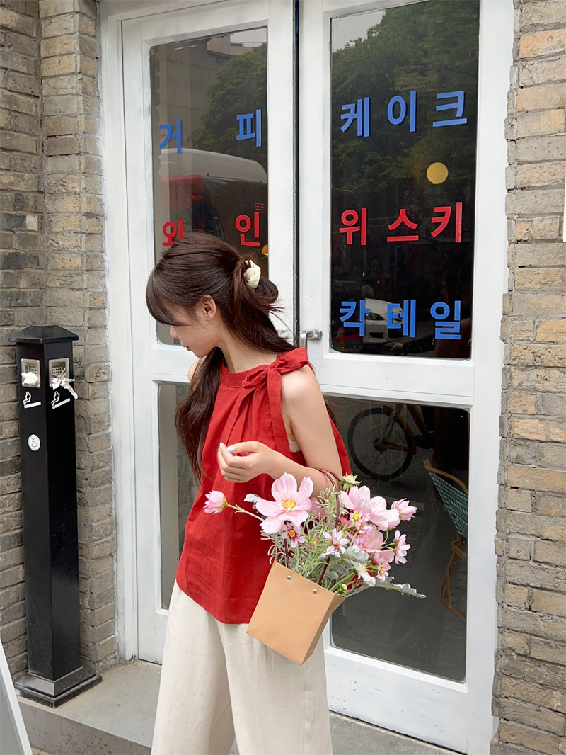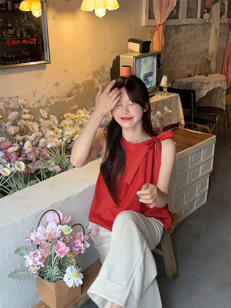 리얼 샷 ~ 여름 새로운 달콤한 교수형 넥 레이스 업 민소매 조끼 스트레이트 튜브 수직 걸레 팬츠 2 피스 63354스토어 가기
