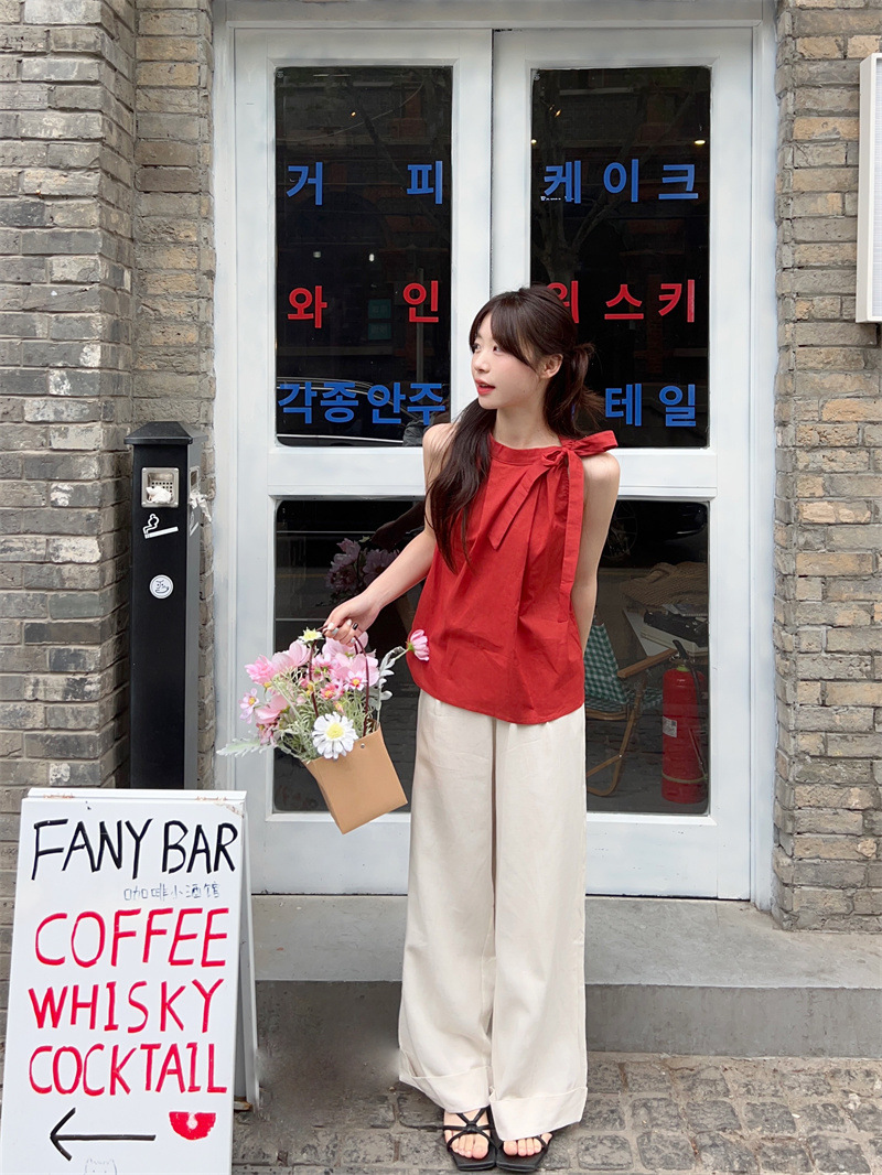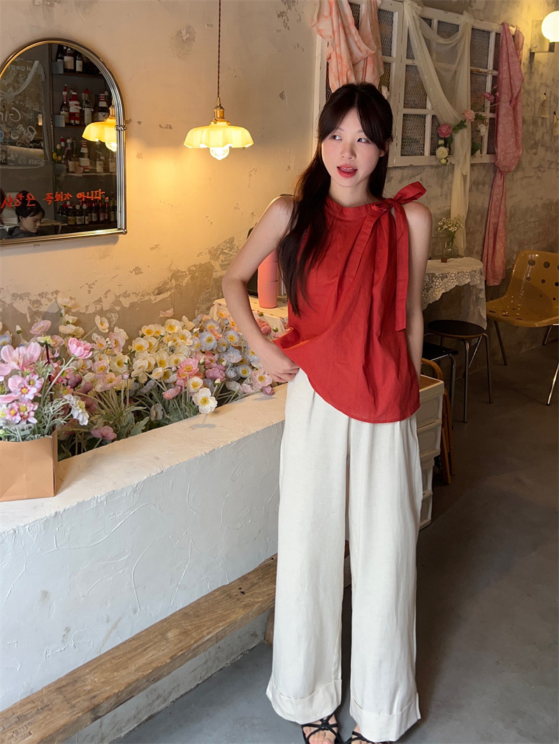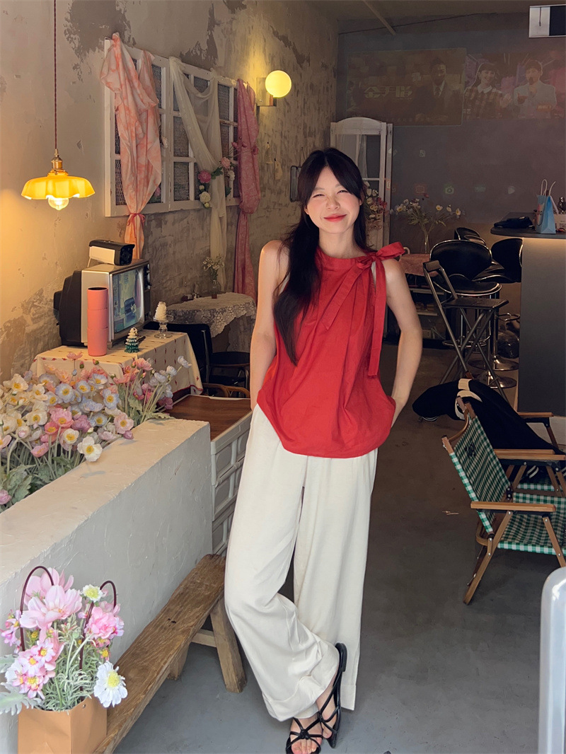 리얼 샷 ~ 여름 새로운 달콤한 교수형 넥 레이스 업 민소매 조끼 스트레이트 튜브 수직 걸레 팬츠 2 피스 63354