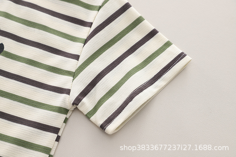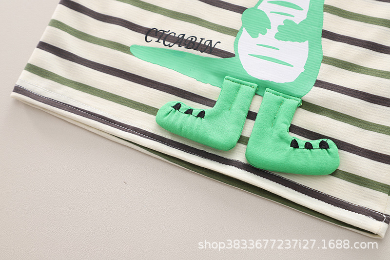 소년 줄무늬 만화 공룡 크루 넥 짧은 소매 세트 여름 새 소년 캐주얼 반바지 2 피스 세트 도매스토어 가기