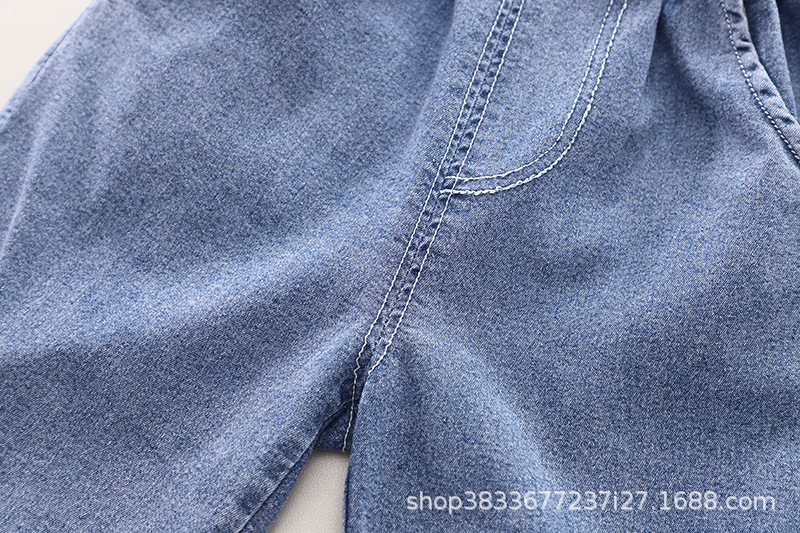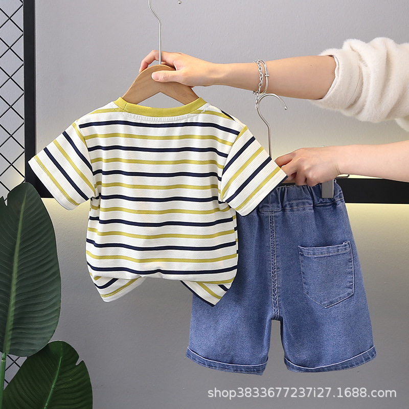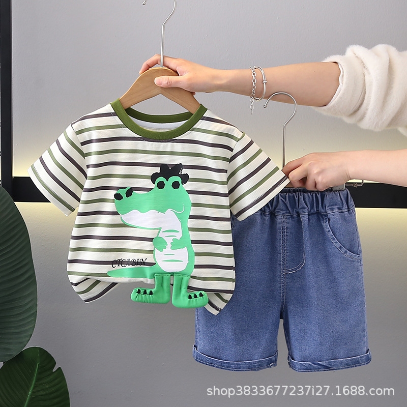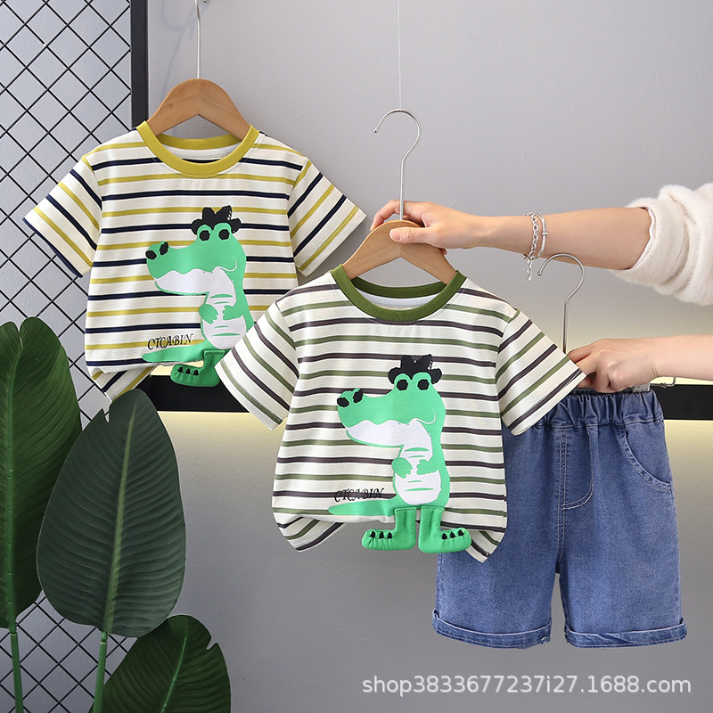 소년 줄무늬 만화 공룡 크루 넥 짧은 소매 세트 여름 새 소년 캐주얼 반바지 2 피스 세트 도매