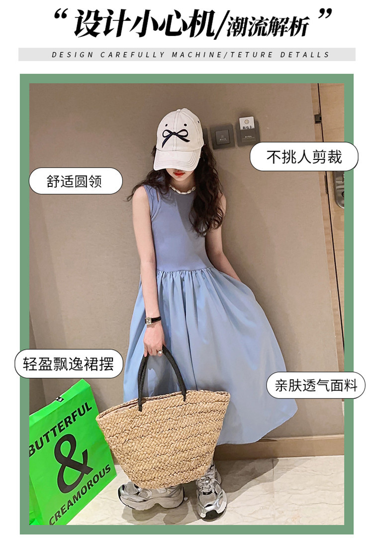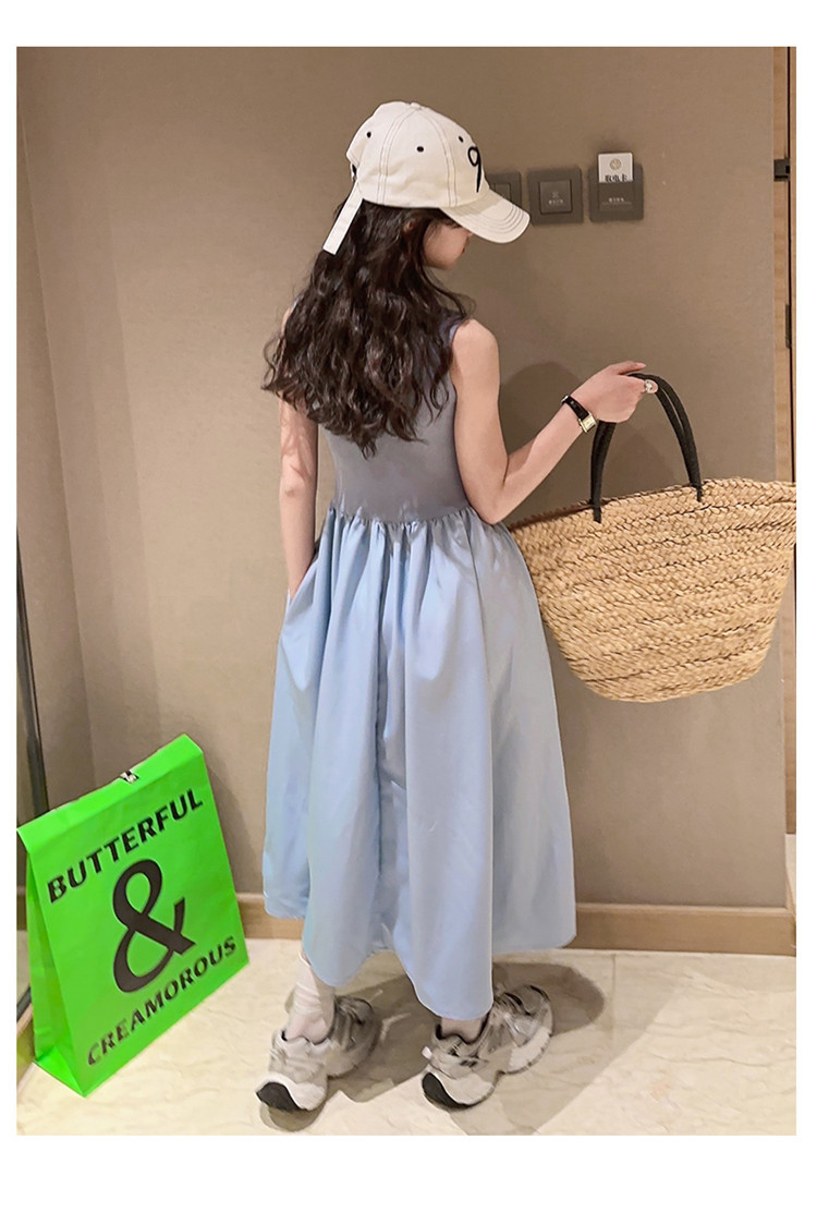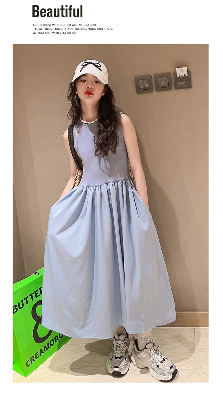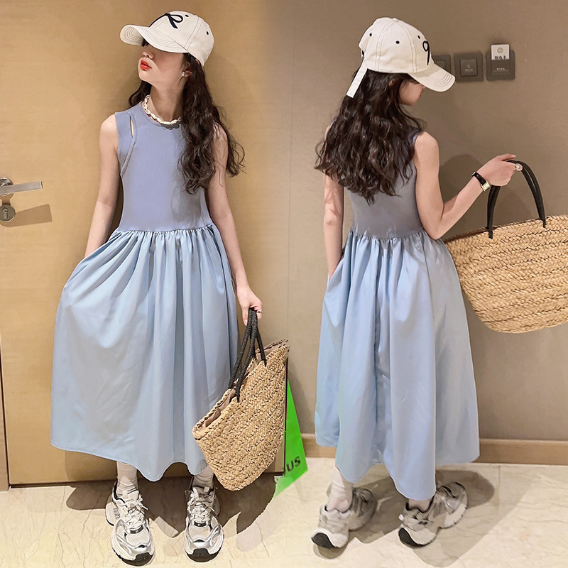 소녀 여름 원피스 어린이 여름 푸른 한국 스타일 원피스 큰 어린이 2024 새로운 스타일 서양식 헵번 스타일 긴 원피스
