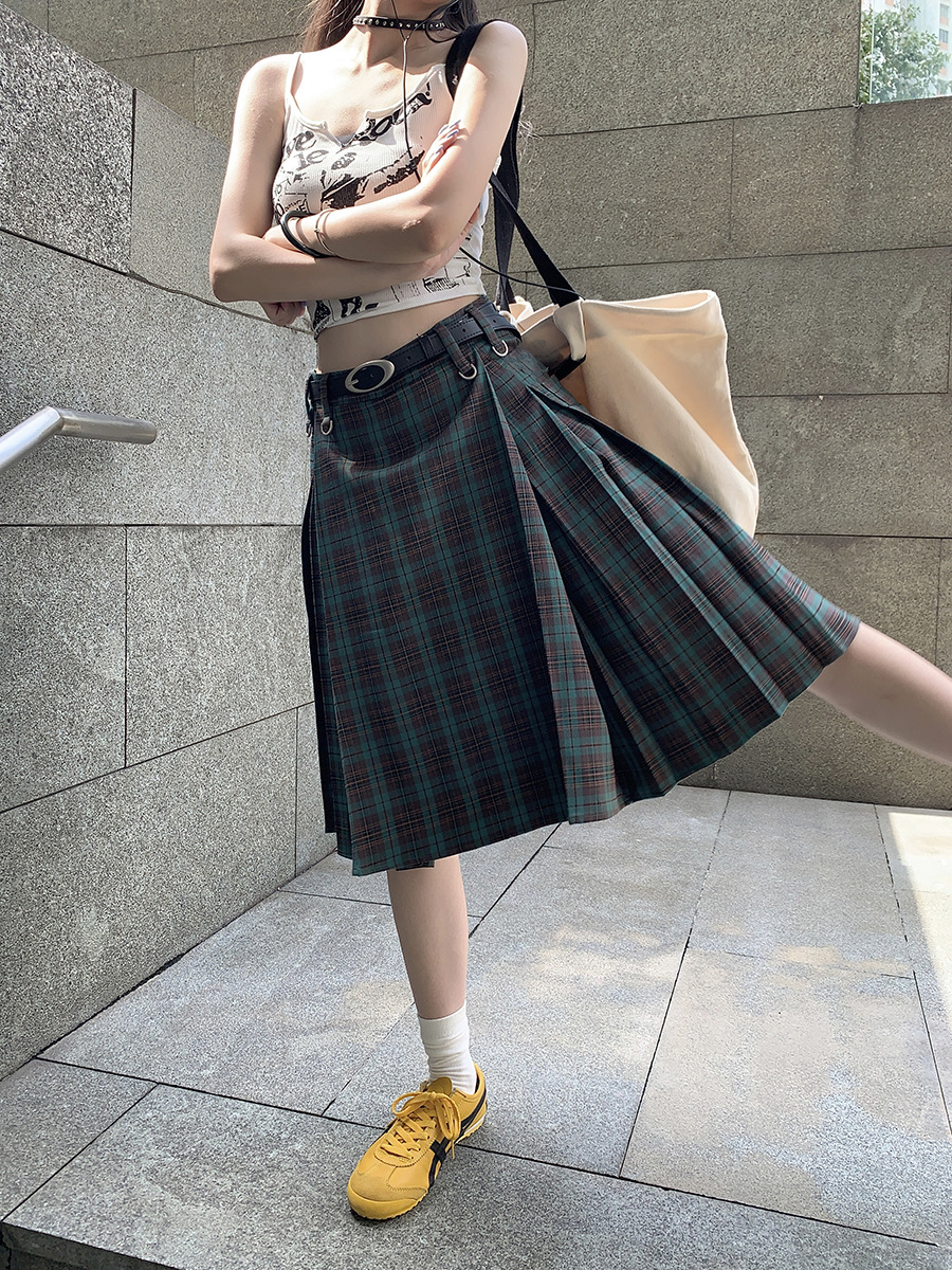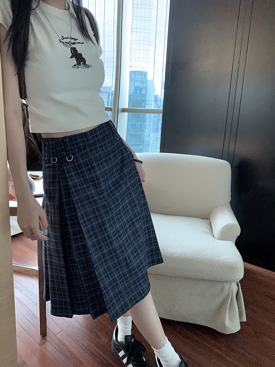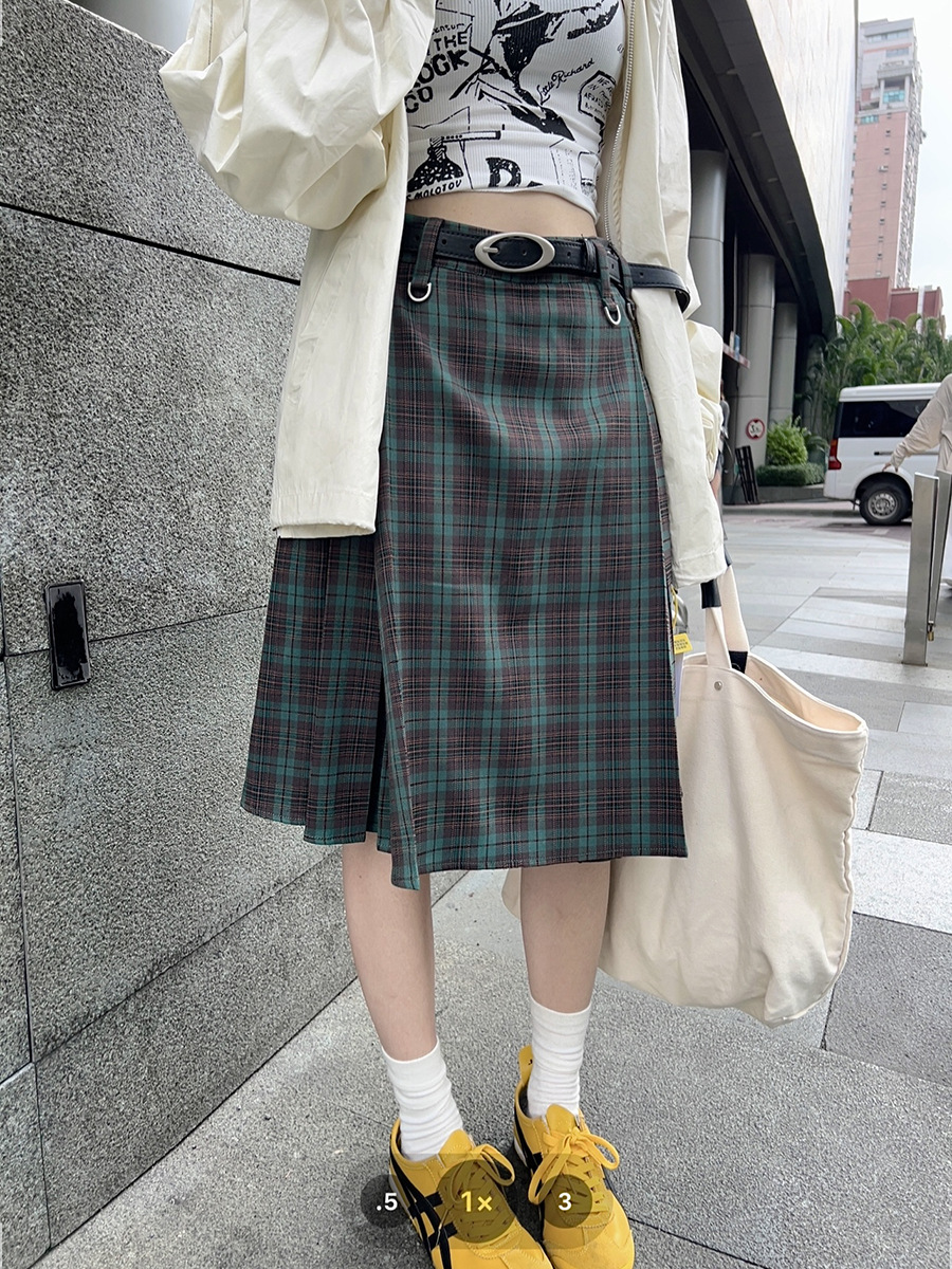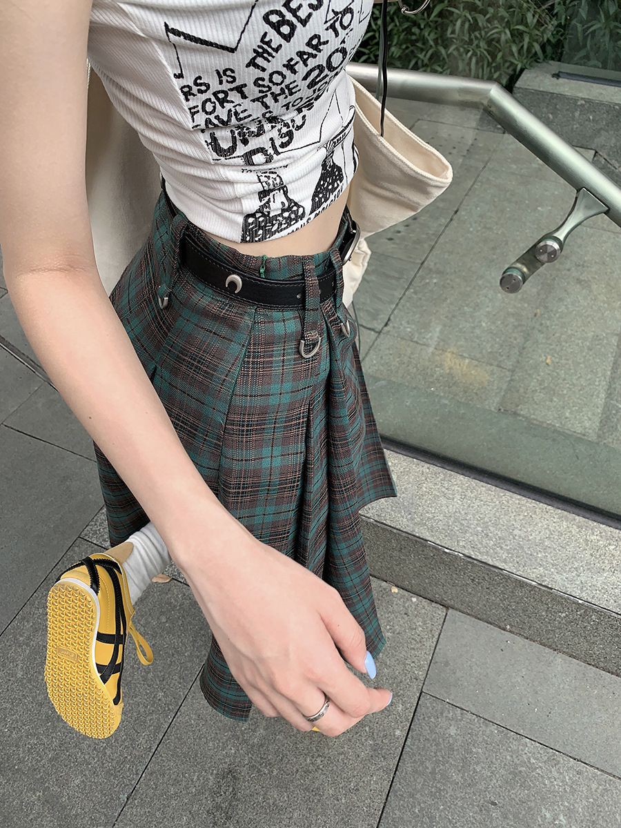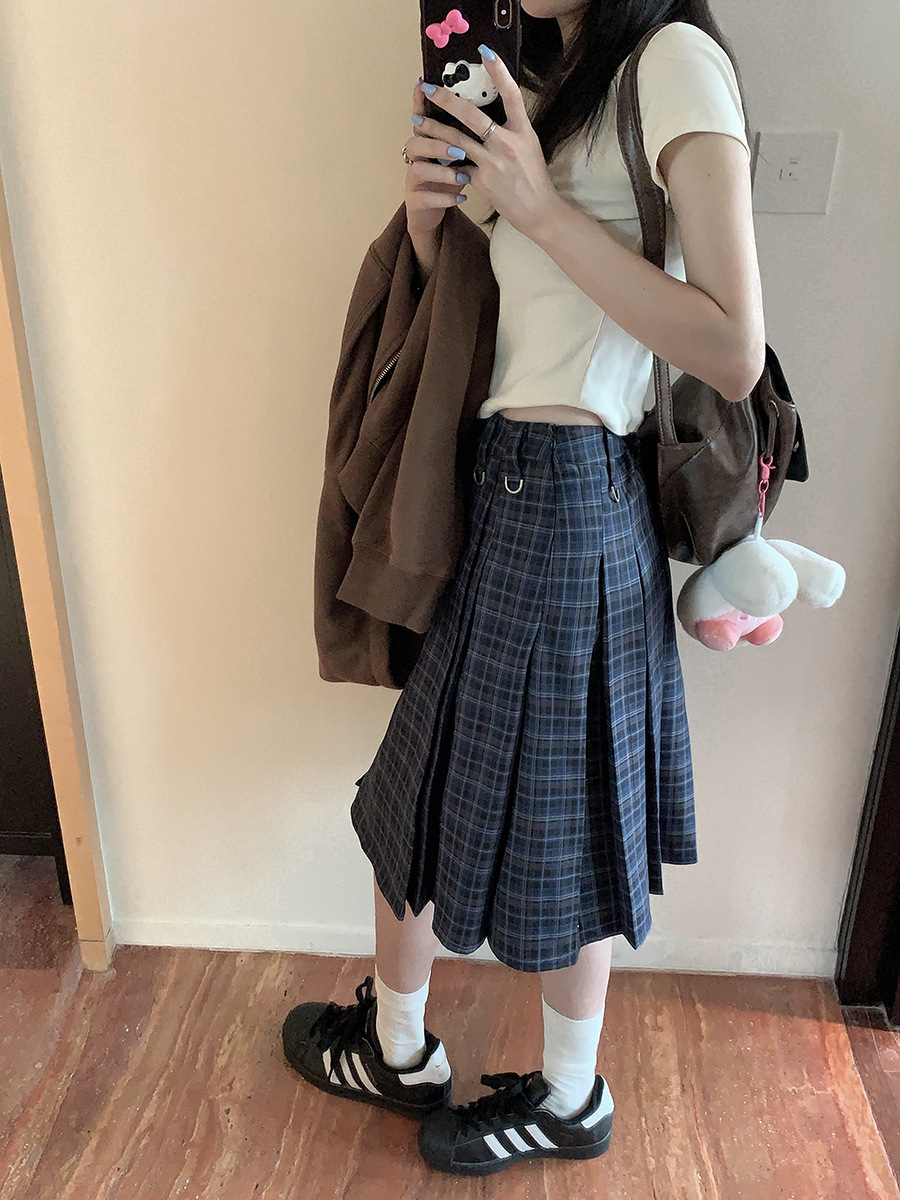 리얼 샷 아메리칸 아카데미 스타일 빈티지 격자 무늬 스커트 여성의 봄 높은 허리 슬리밍 주름 치마 미드 스커트 A-라인 스커트