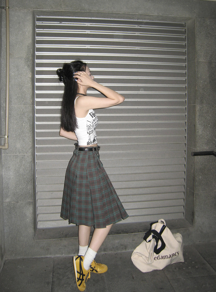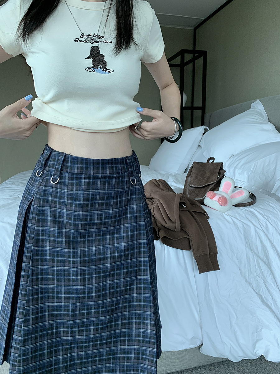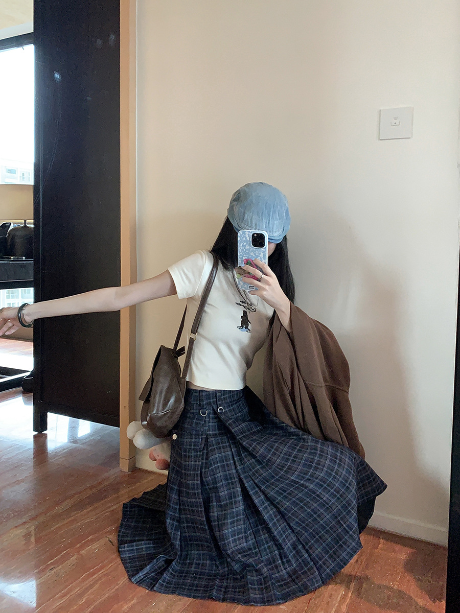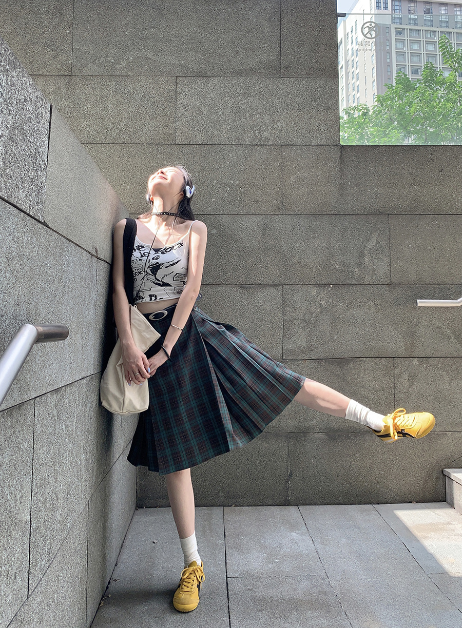 리얼 샷 아메리칸 아카데미 스타일 빈티지 격자 무늬 스커트 여성의 봄 높은 허리 슬리밍 주름 치마 미드 스커트 A-라인 스커트