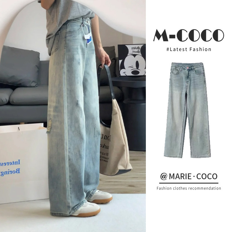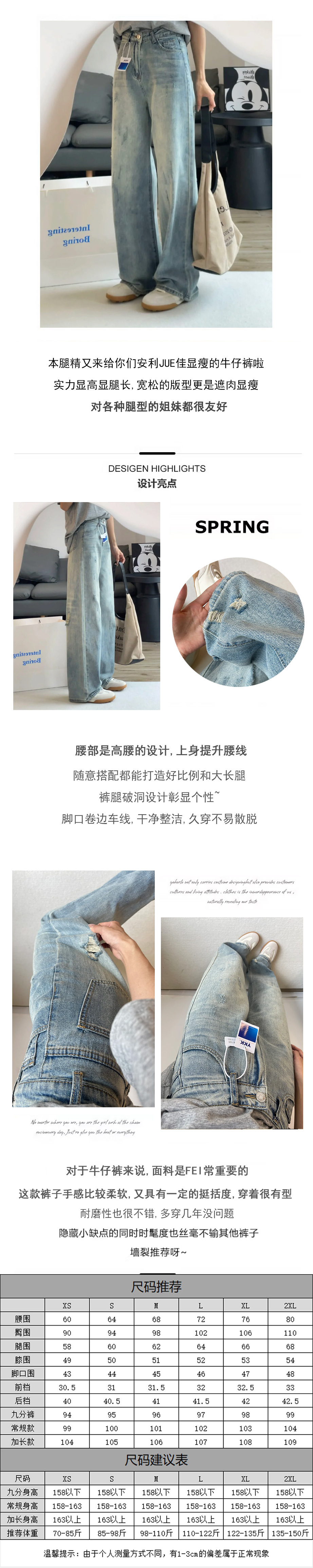 미국 하이 스트리트 찢어진 청바지 여성 2024 새로운 여름 작은 높은 허리 좁은 버전 스트레이트 와이드 다리 바지스토어 가기