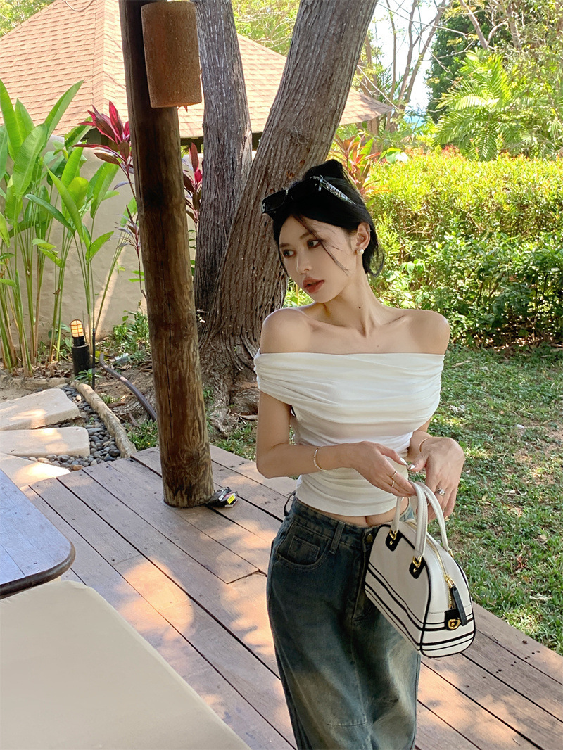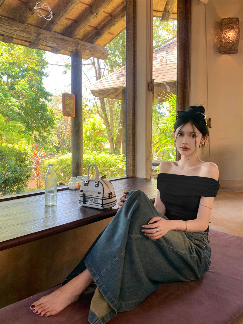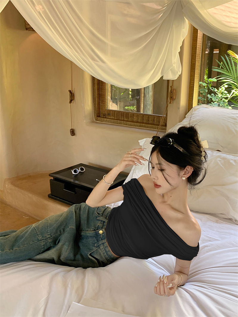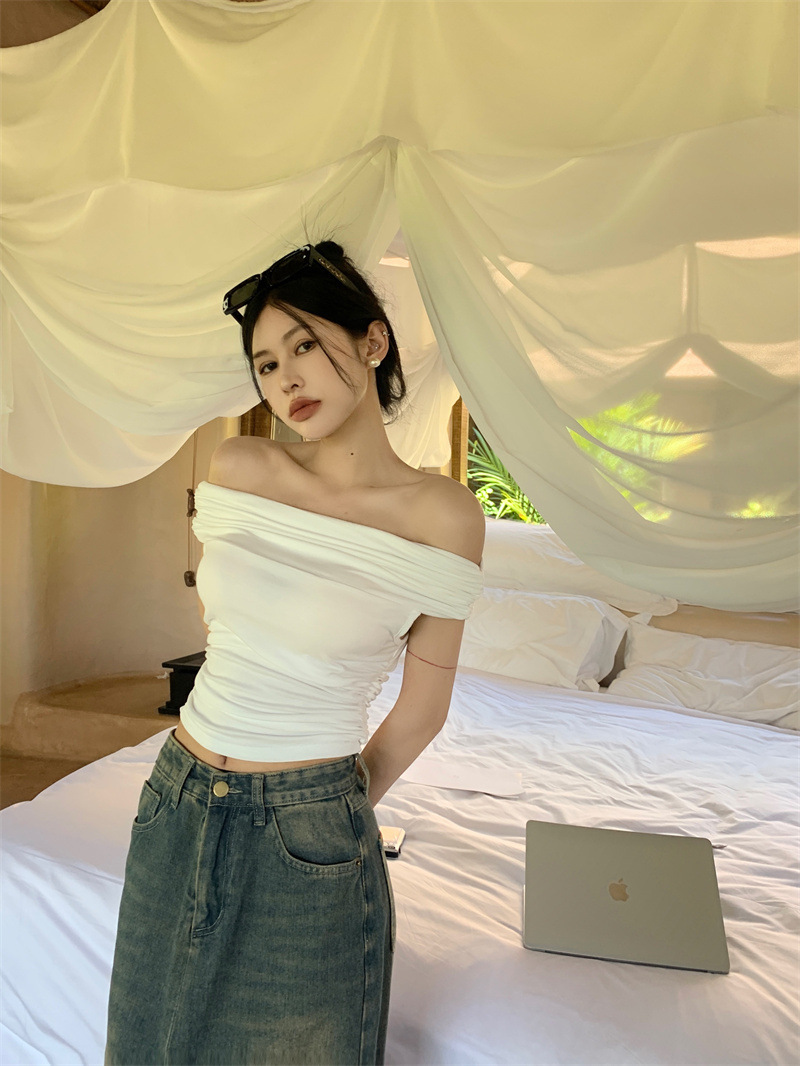 Ins 오프 숄더 섹시한 뜨거운 여자 순수한 욕망 원 라인 칼라 반팔 티셔츠 여성 여름 슬림 슬리밍 Bottoming 탑 여성 도매스토어 가기