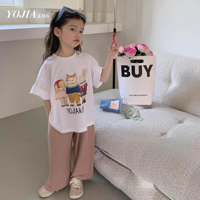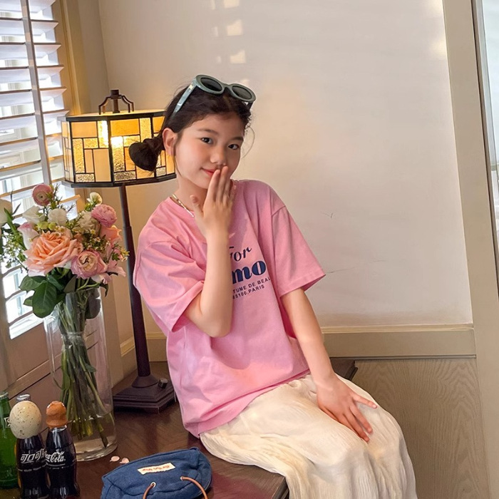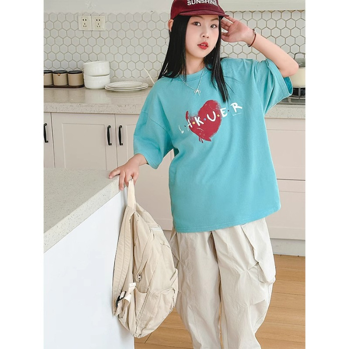 남학생과 여학생 한국식 만화 편지 2024 여름 새 반팔 티셔츠 큰 어린이 캐주얼 얇은면 티셔츠