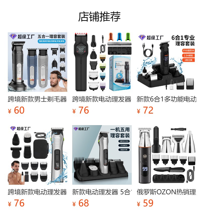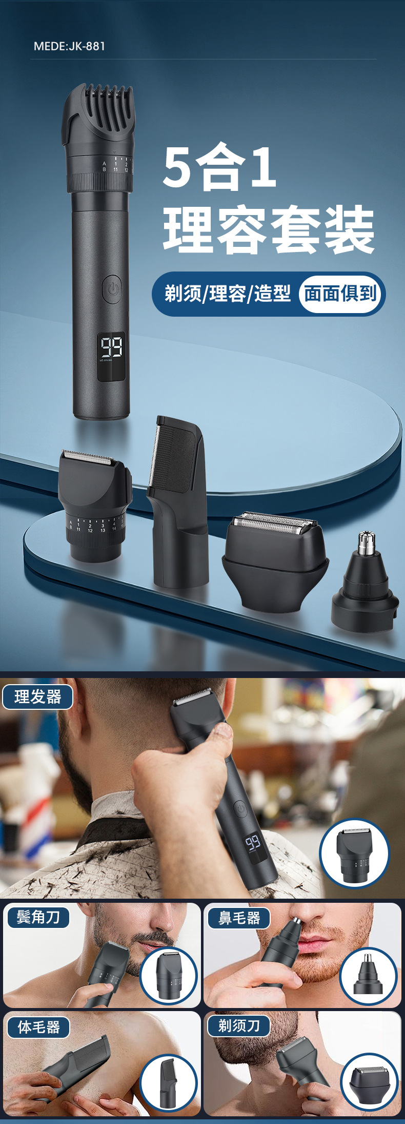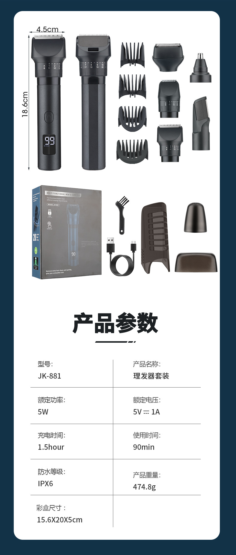 产品包括:主机*1 理发头*1 剃须刀头*1 体毛修剪刀头*1 鼻毛头*1 清洁刷*1 USB充电线*1