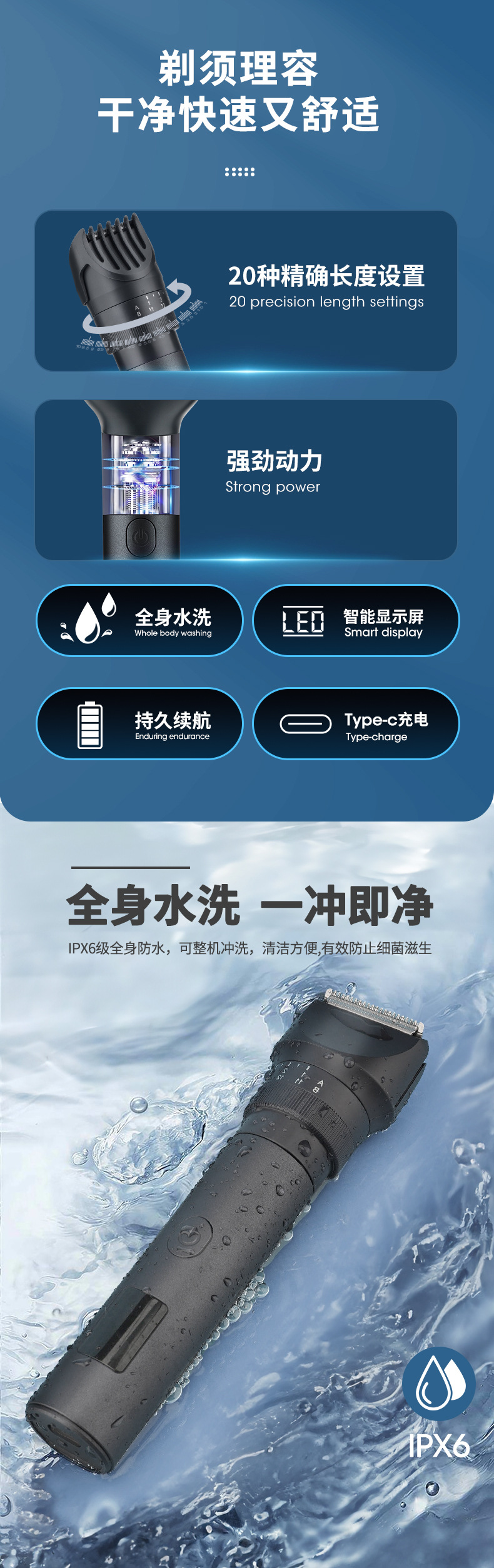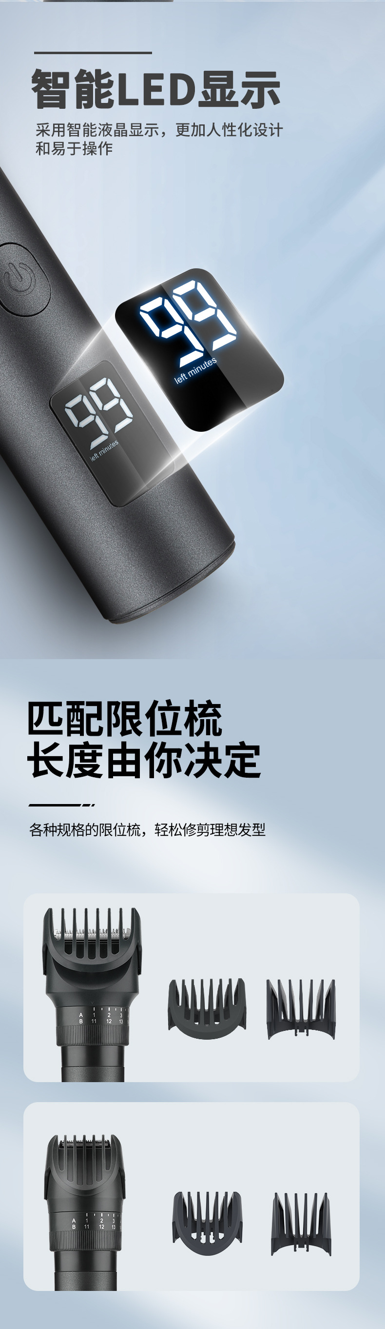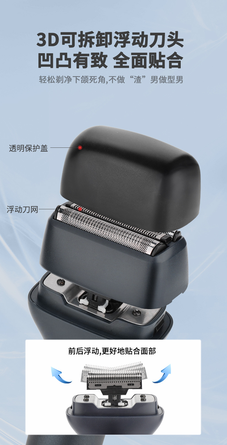 产品包括:主机*1 理发头*1 剃须刀头*1 体毛修剪刀头*1 鼻毛头*1 清洁刷*1 USB充电线*1