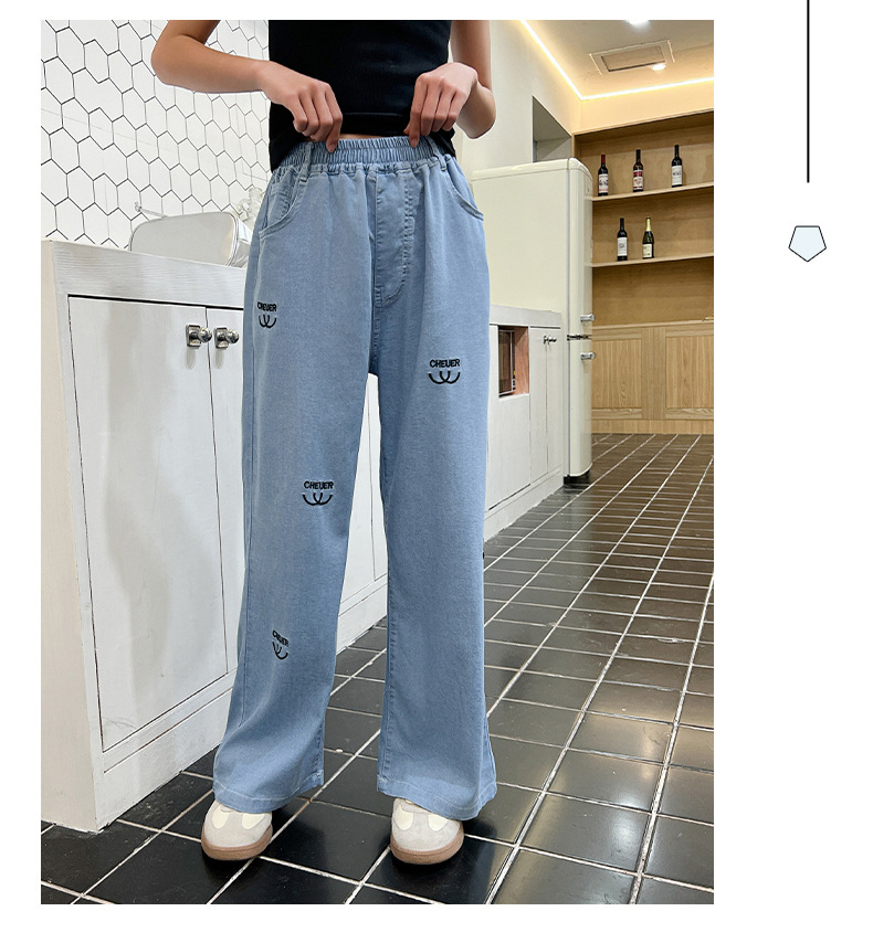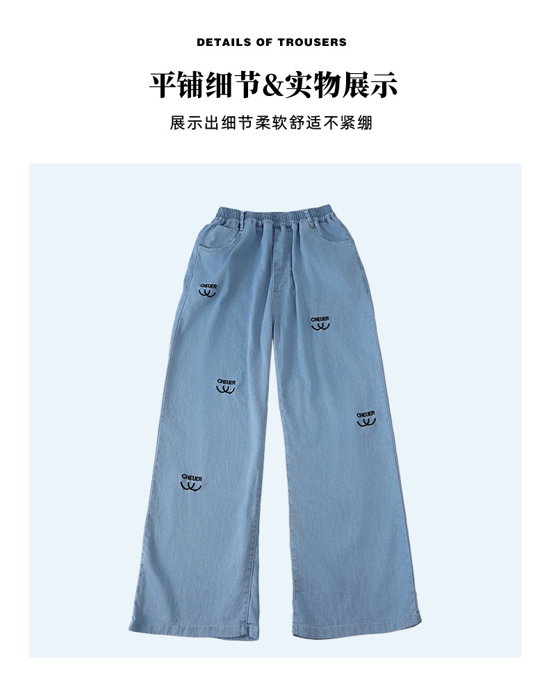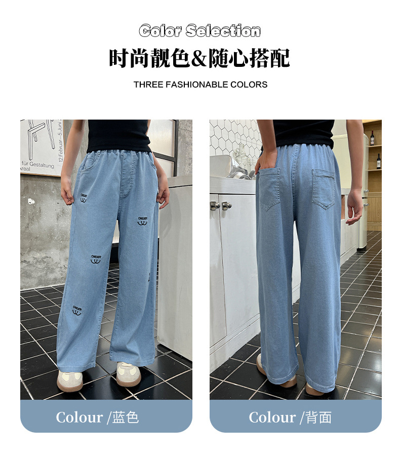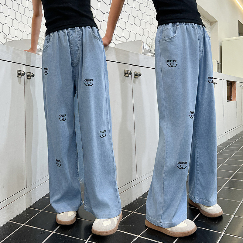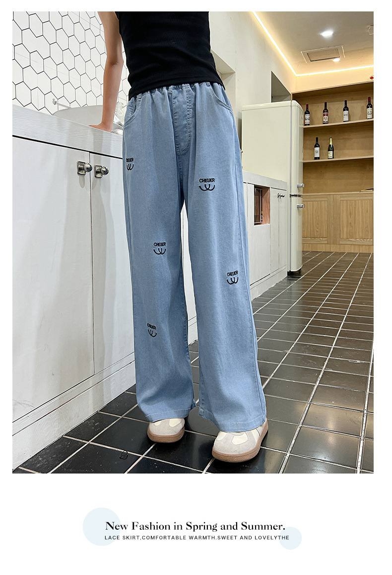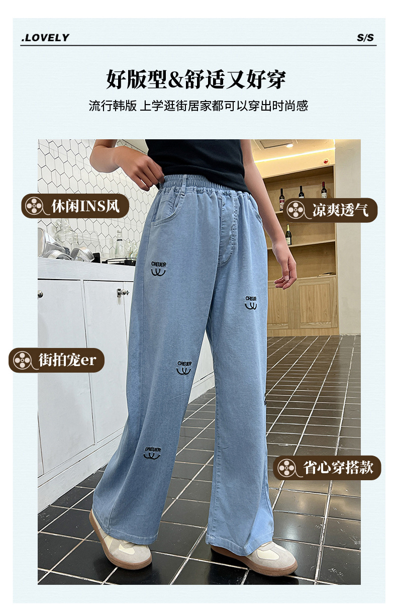 소녀 바지 여름 얇은 2024 새로운 어린이 여름 스트레이트 와이드 다리 안티 모기 바지 어린이 텐셀 청바지스토어 가기