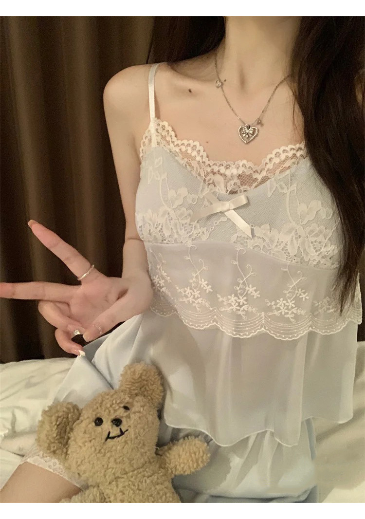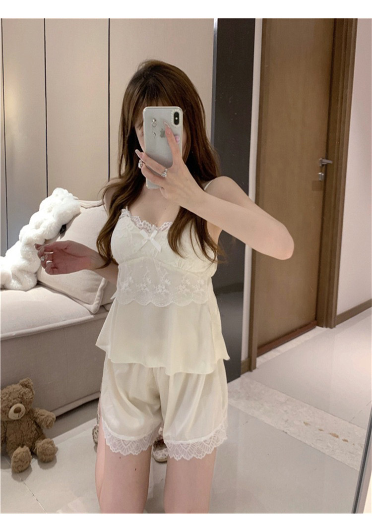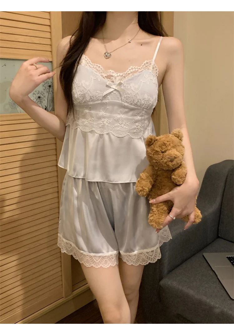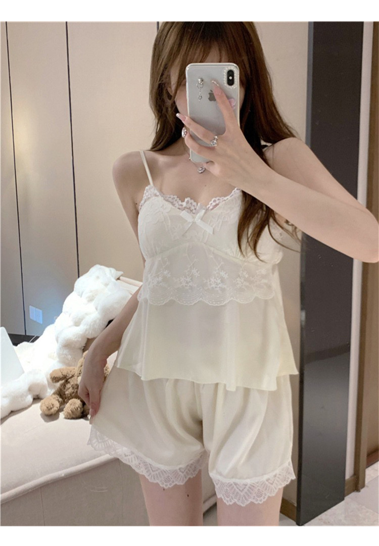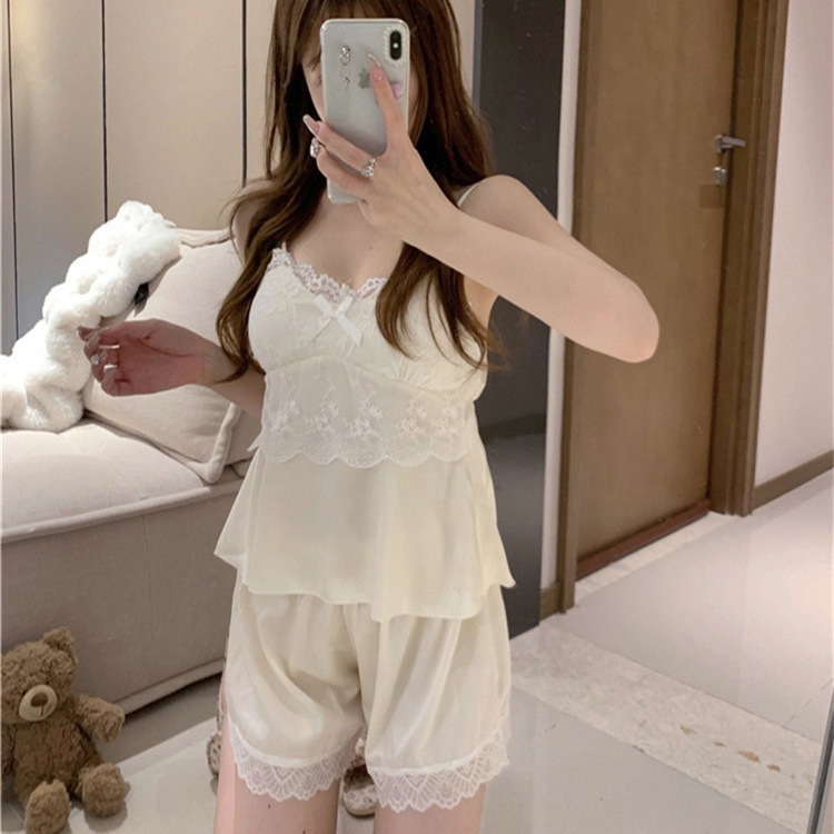 2025년 여름 신상 아이스 실크 잠옷, 여성스러운 레이스, 순수한 섹시함, 가슴 패드가 있는 서스펜더 반바지 세트, 달콤한 홈웨어스토어 가기