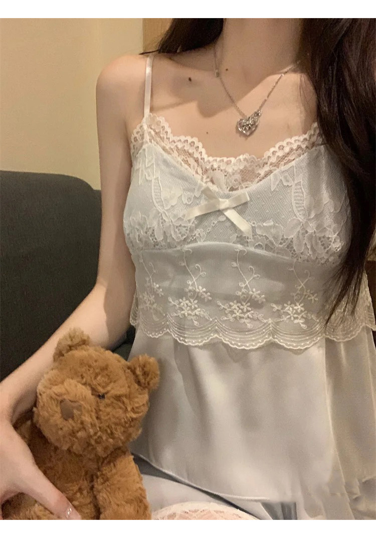 2025년 여름 신상 아이스 실크 잠옷, 여성스러운 레이스, 순수한 섹시함, 가슴 패드가 있는 서스펜더 반바지 세트, 달콤한 홈웨어