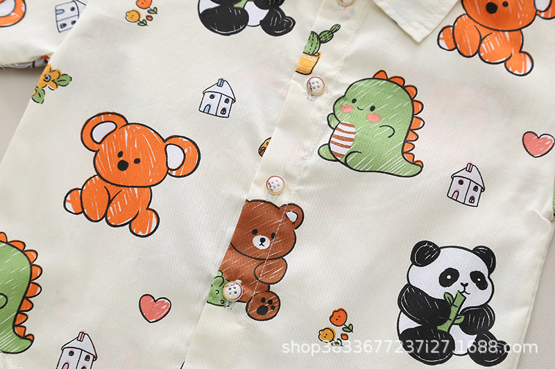 여름 새로운 어린이 만화 팬더 공룡 인쇄 반팔 셔츠 투피스 작은 소년의 여름 옷 어린이 옷