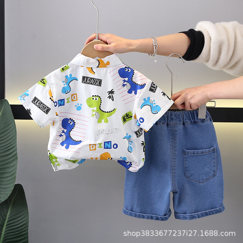 여름 새로운 어린이 만화 팬더 공룡 인쇄 반팔 셔츠 투피스 작은 소년의 여름 옷 어린이 옷스토어 가기