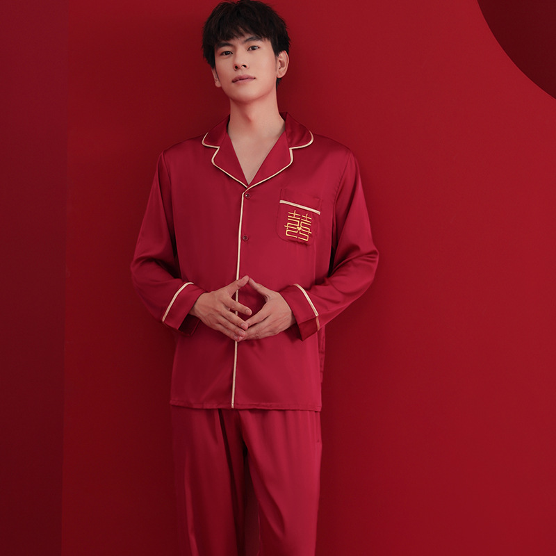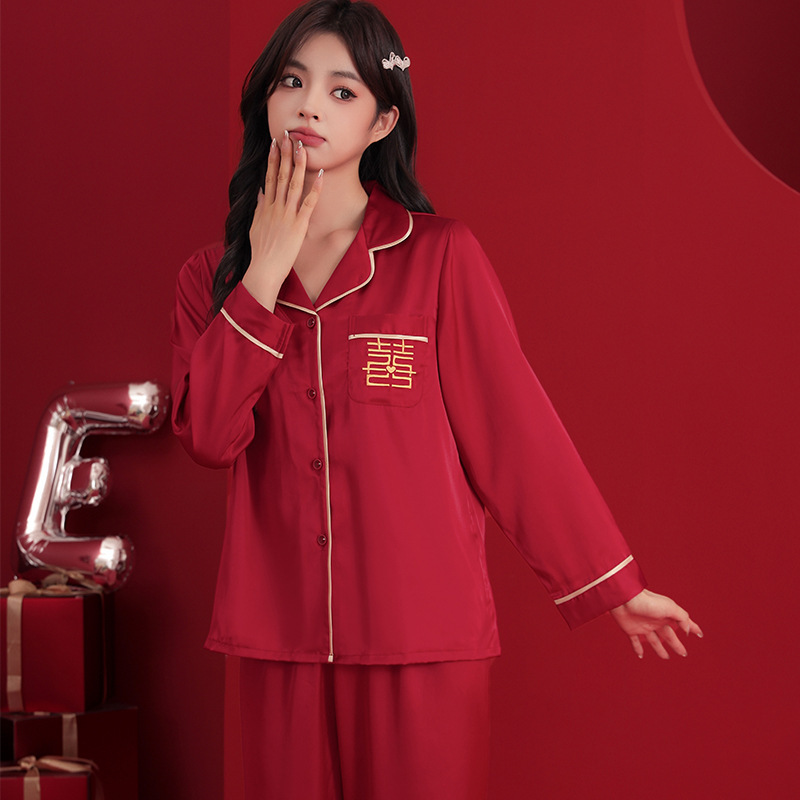 커플의 잠옷 봄과 여름 새틴 긴 반팔 웨딩 축제 년 레드 얇은 더블 행복 홈 옷스토어 가기
