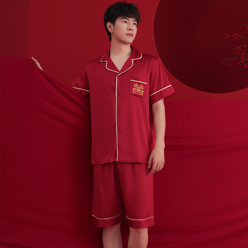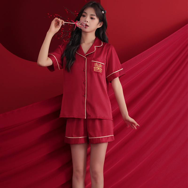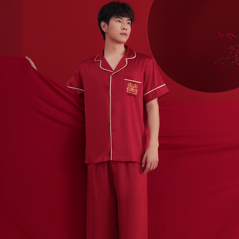 커플의 잠옷 봄과 여름 새틴 긴 반팔 웨딩 축제 년 레드 얇은 더블 행복 홈 옷