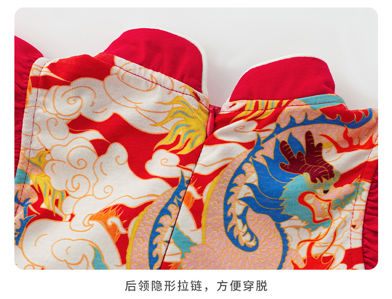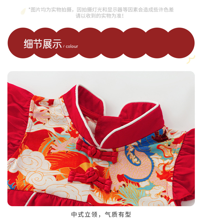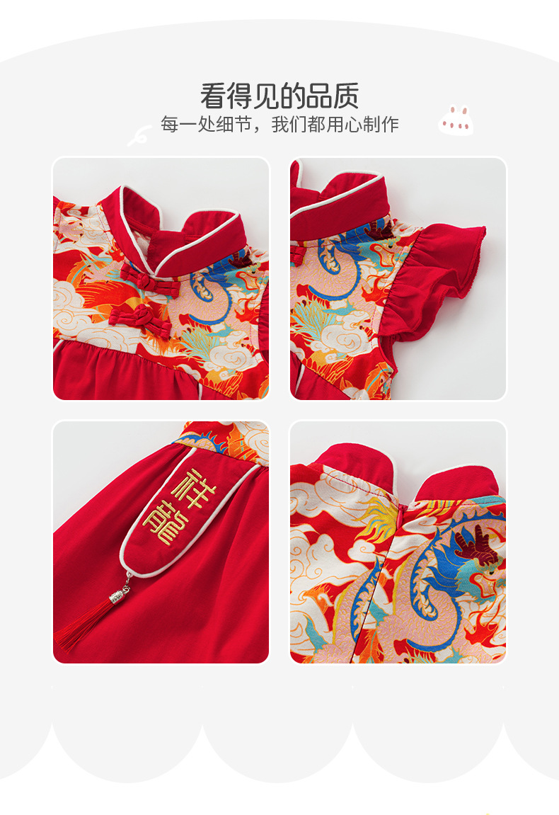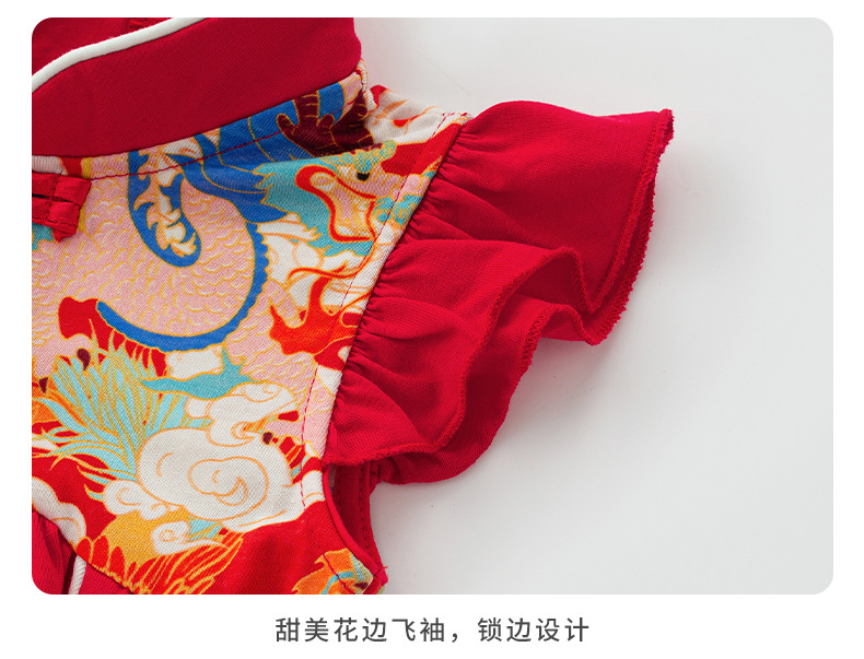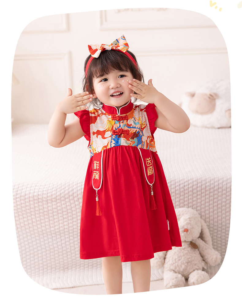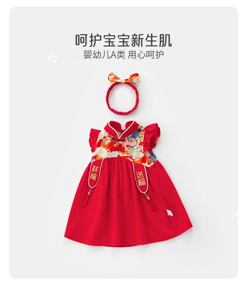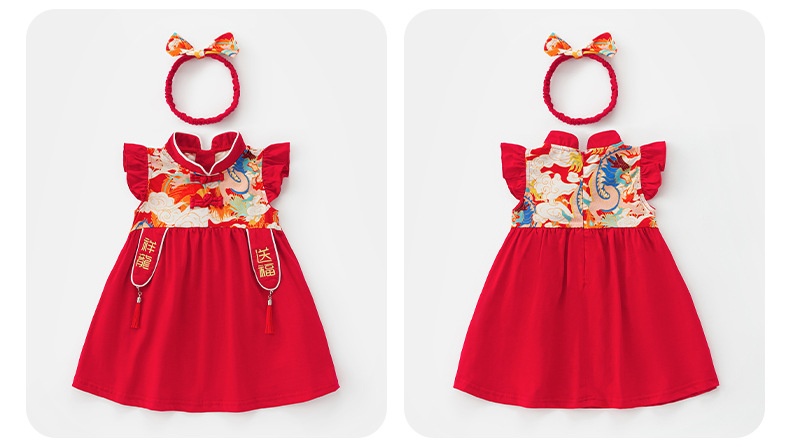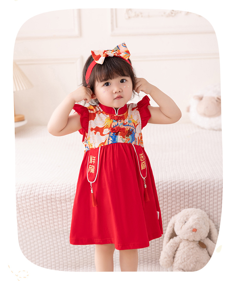 아기 소녀 축제 드레스 2025 여름 중국 스타일 플라이 슬리브 스커트 아기 한 달 된 보름달 드레스 머리띠 3632스토어 가기