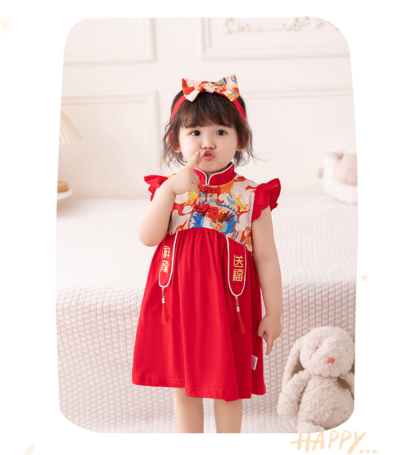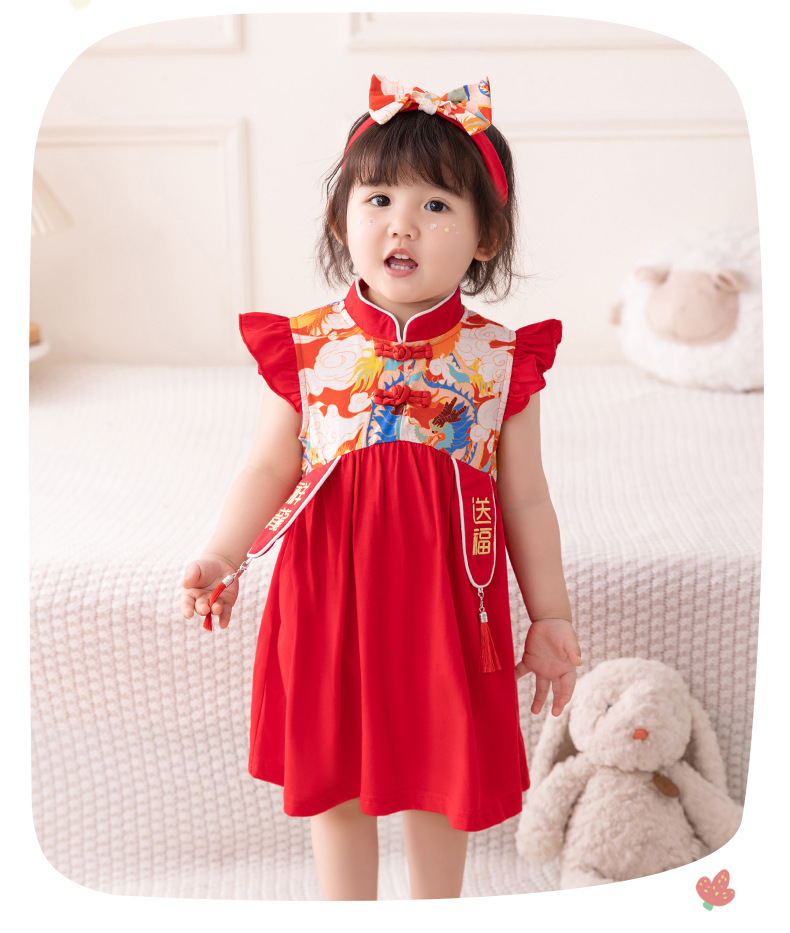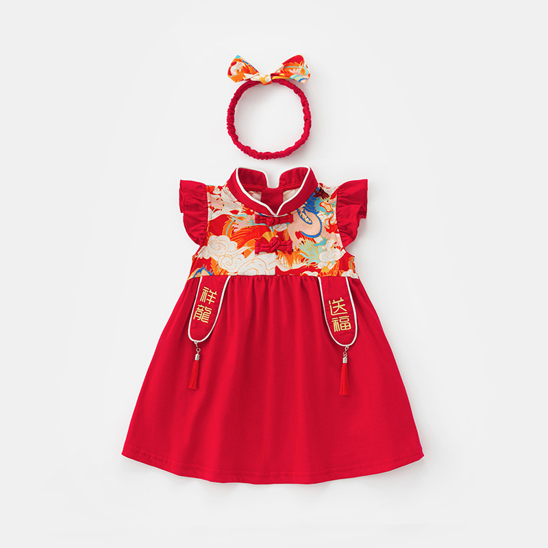 아기 소녀 축제 드레스 2025 여름 중국 스타일 플라이 슬리브 스커트 아기 한 달 된 보름달 드레스 머리띠 3632