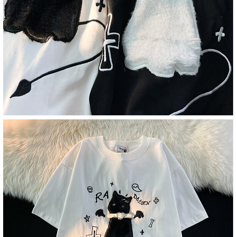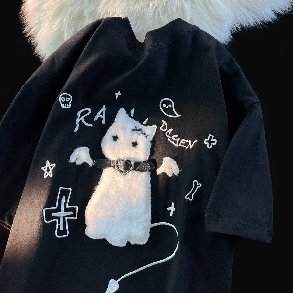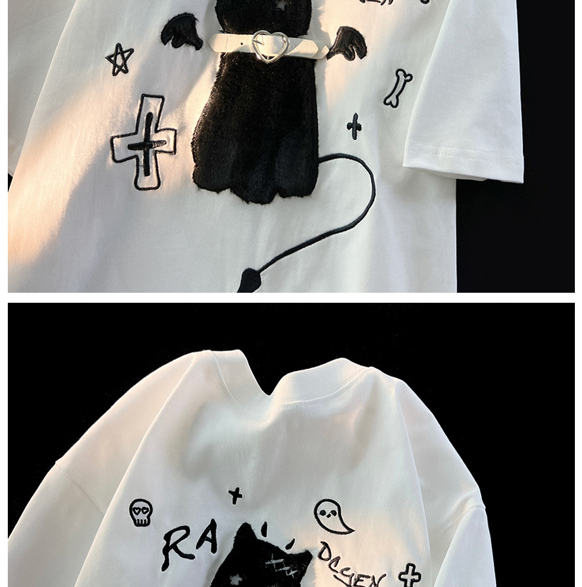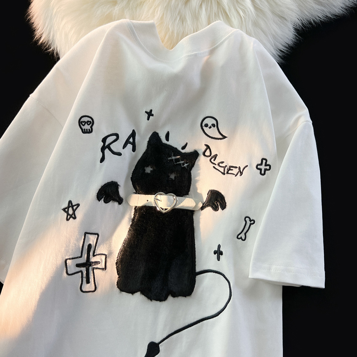 아메리칸 스타일 레트로 자수 고양이 반팔 티셔츠 여성용 달콤한 쿨 인 루즈 디자인 센스 니쉬 트렌디 브랜드 팻 걸의 탑스토어 가기