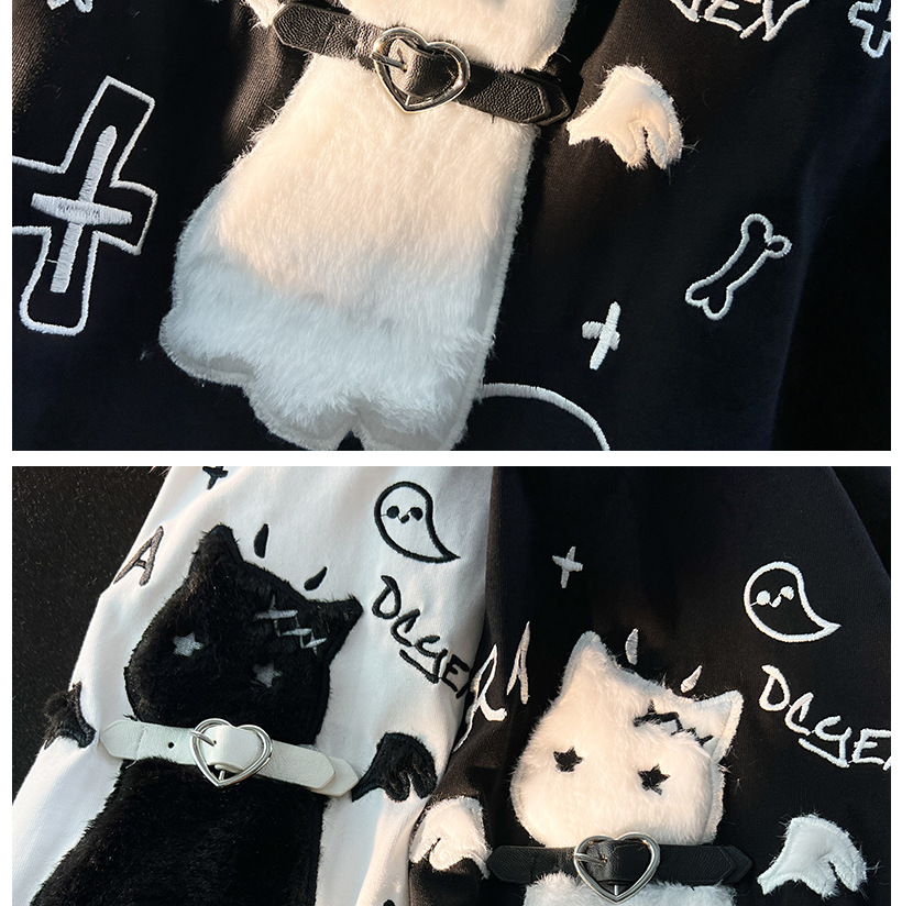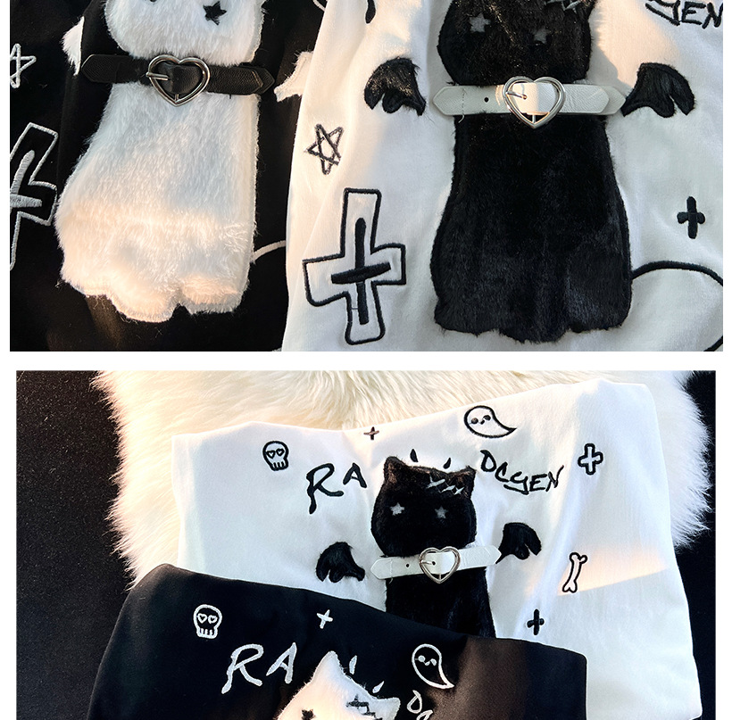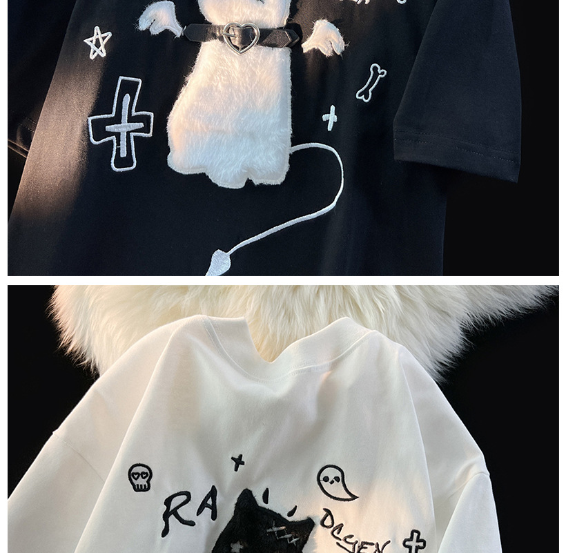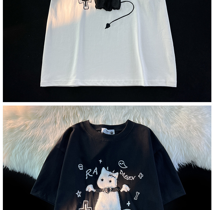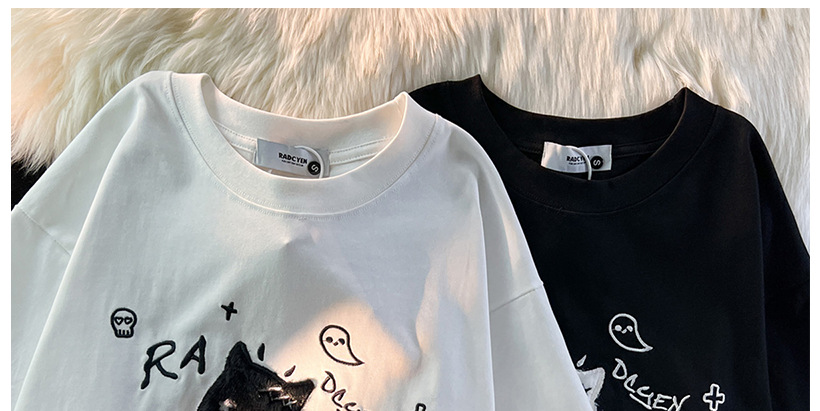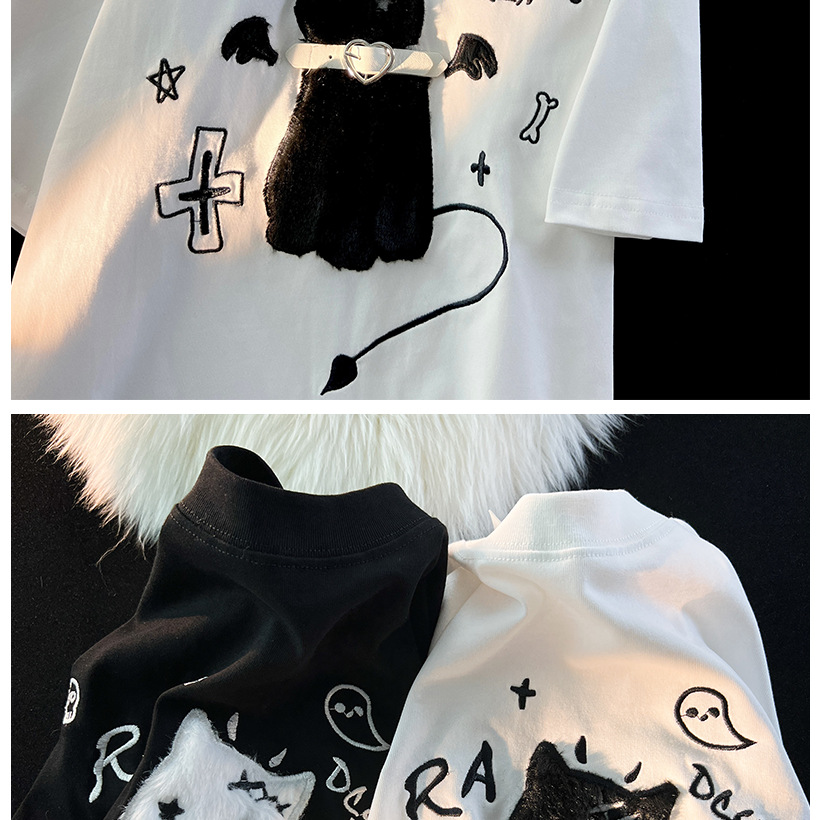 아메리칸 스타일 레트로 자수 고양이 반팔 티셔츠 여성용 달콤한 쿨 인 루즈 디자인 센스 니쉬 트렌디 브랜드 팻 걸의 탑스토어 가기