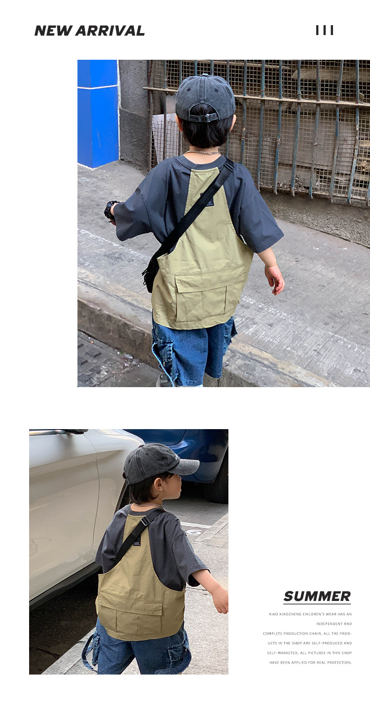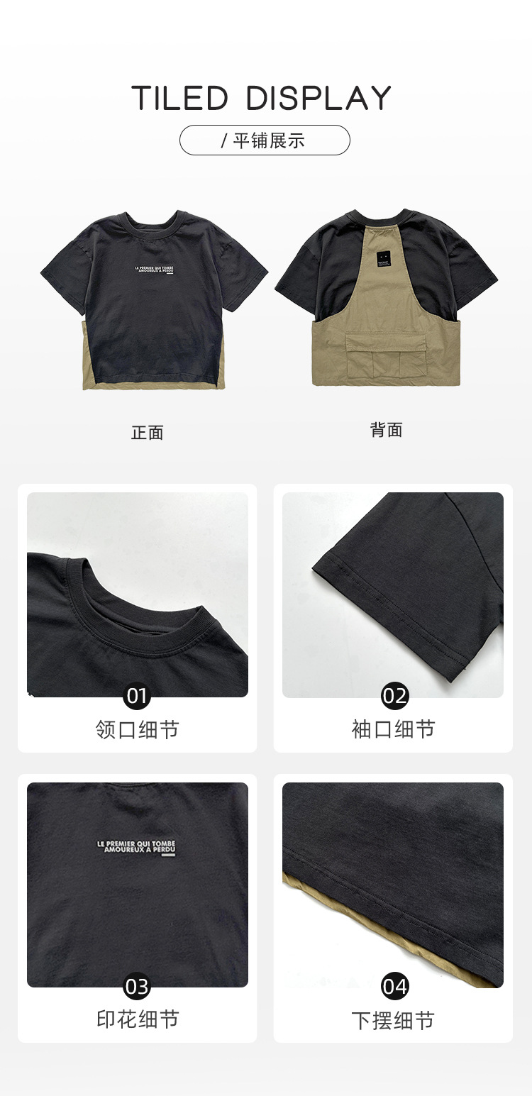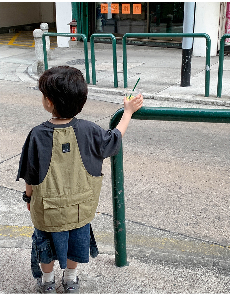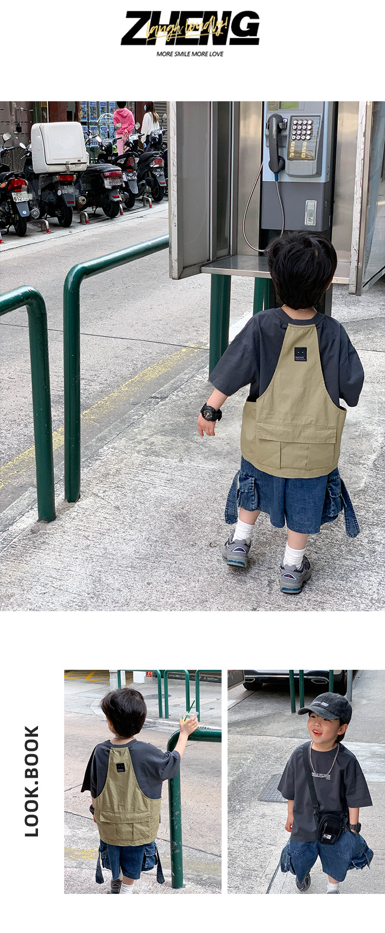 소년 반팔 가짜 투피스 2024 여름 새로운 어린이 한국 스타일 느슨한 캐주얼 티셔츠 중소 어린이를위한 잘 생긴 셔츠스토어 가기