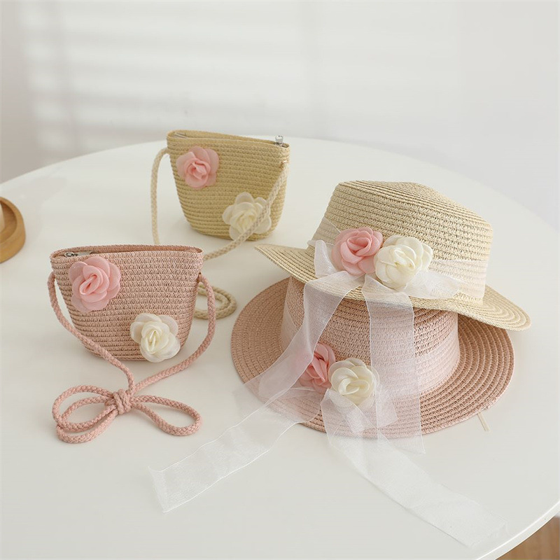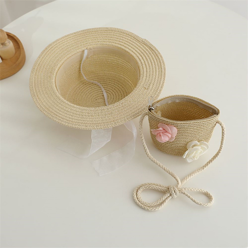 여름 어린이 자외선 차단제 모자 가방 밀짚 모자 가방 세트 어린 소녀 꽃 평평한 차양 태양 모자 조수