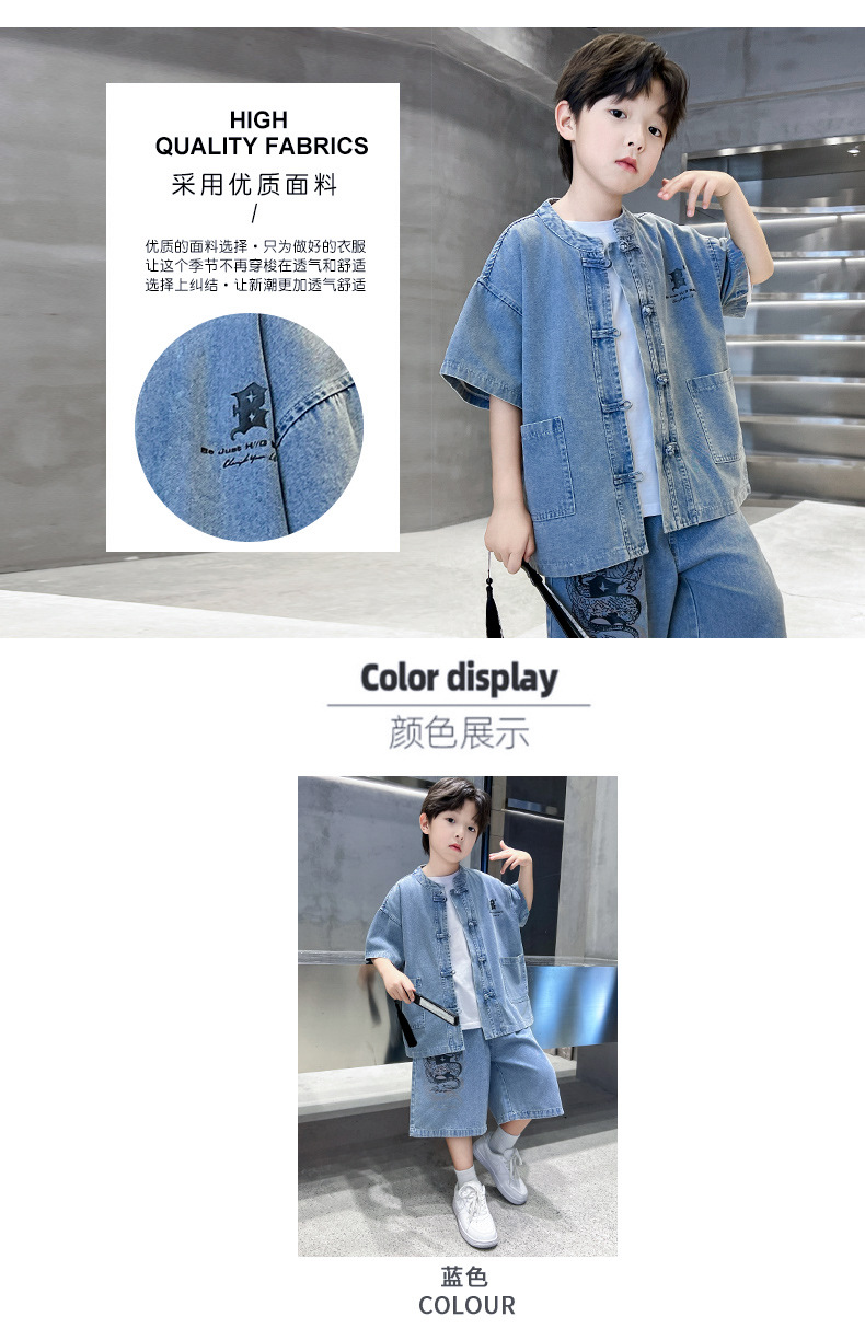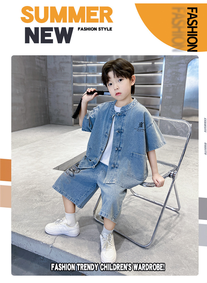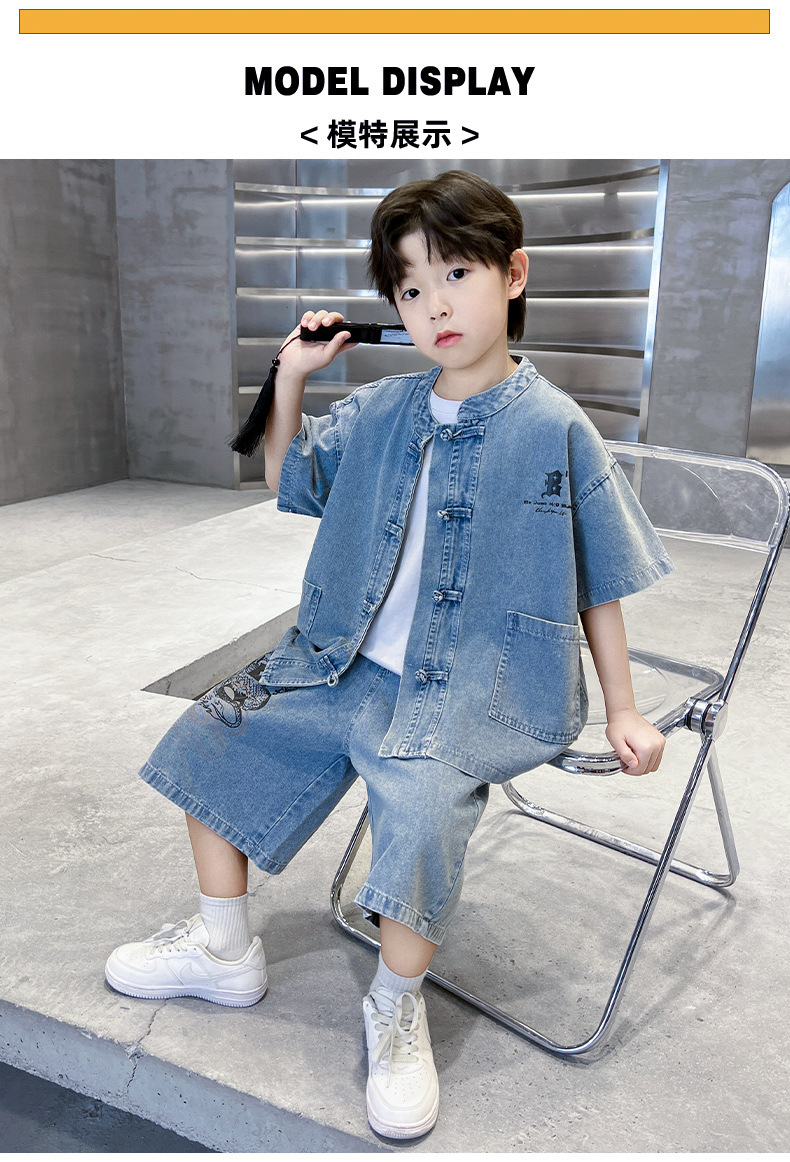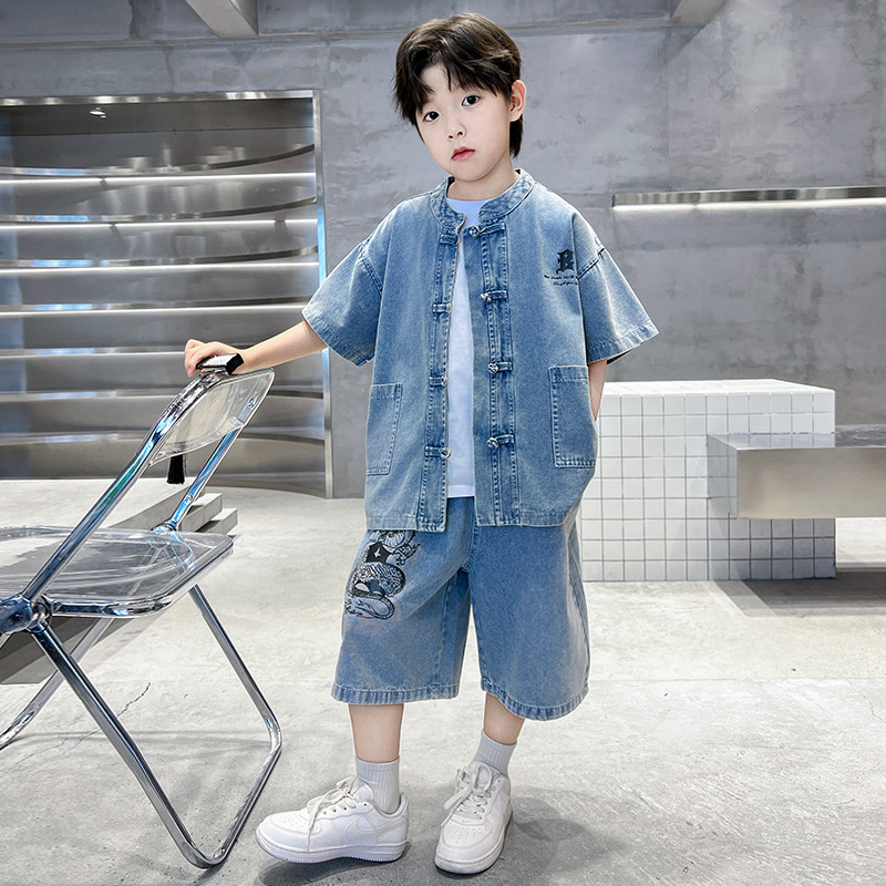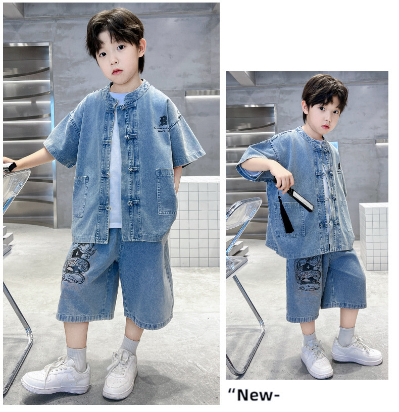 남아 여름복 신상 중국풍 반팔 데님 셔츠 세트 2025 신상 멋스럽고 패셔너블한 얇은 스타일의 투피스 세트스토어 가기