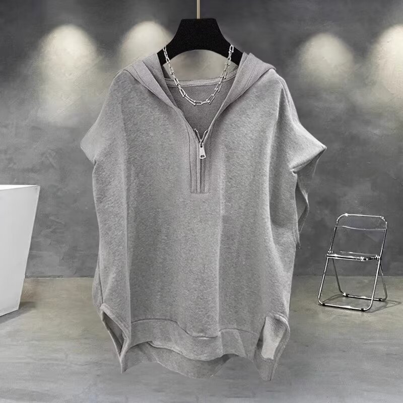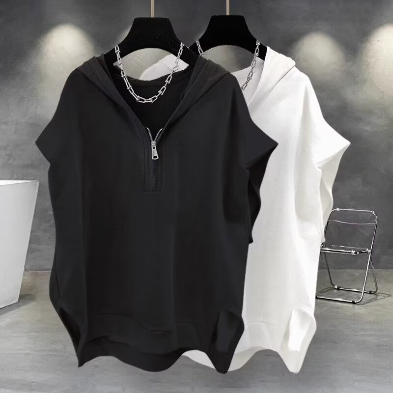솔리드 컬러 지퍼 후드 민소매 티셔츠 남자 여름 Ins 한국 스타일 패셔너블 올 매치 핸섬 캐주얼 루즈 코트 조끼스토어 가기