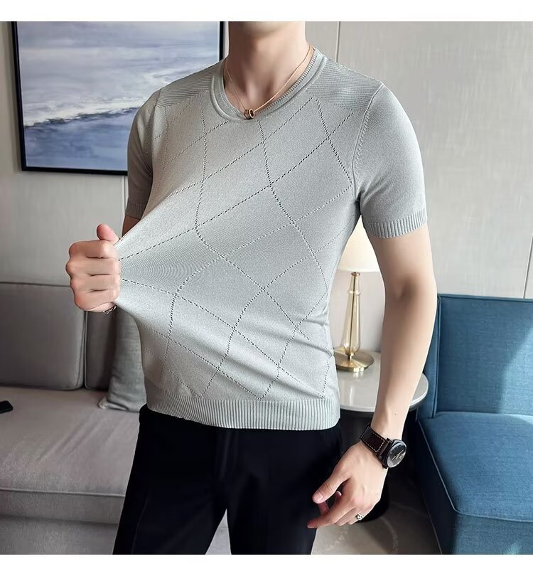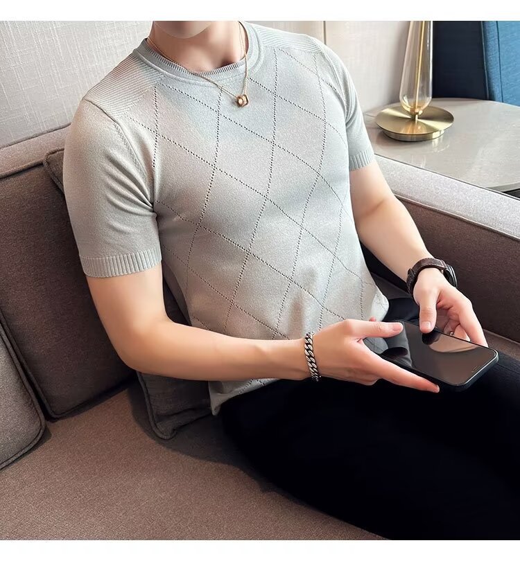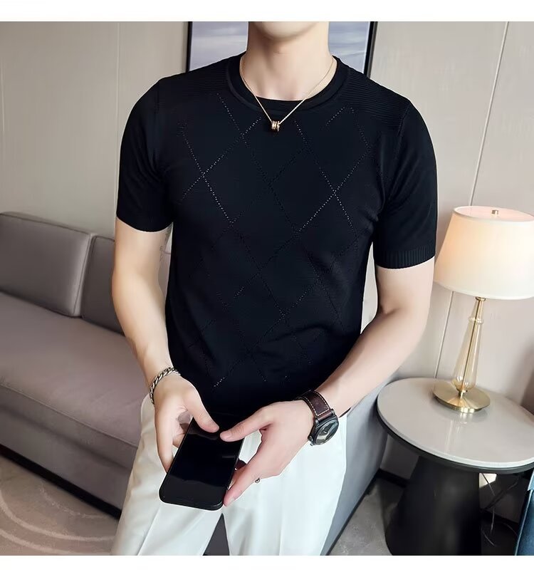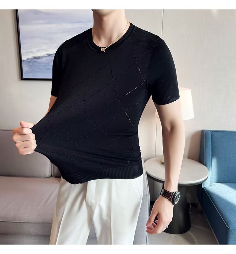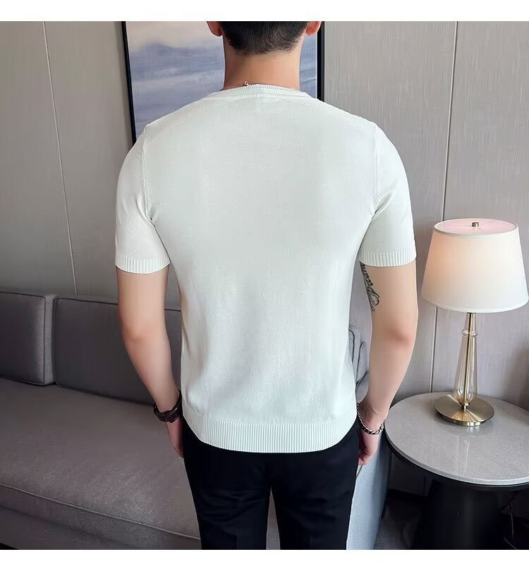 2024 년 여름 새로운 아이스 실크 자카드 크루 넥 반팔 남성 니트 반팔 티셔츠 봄과 여름 슬림 핏 스트레치베이스 셔츠