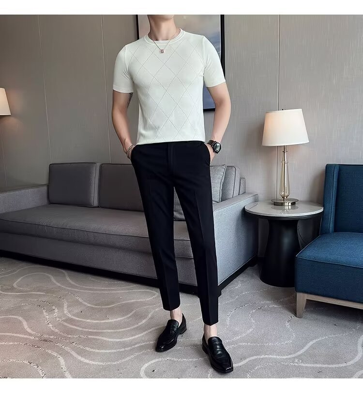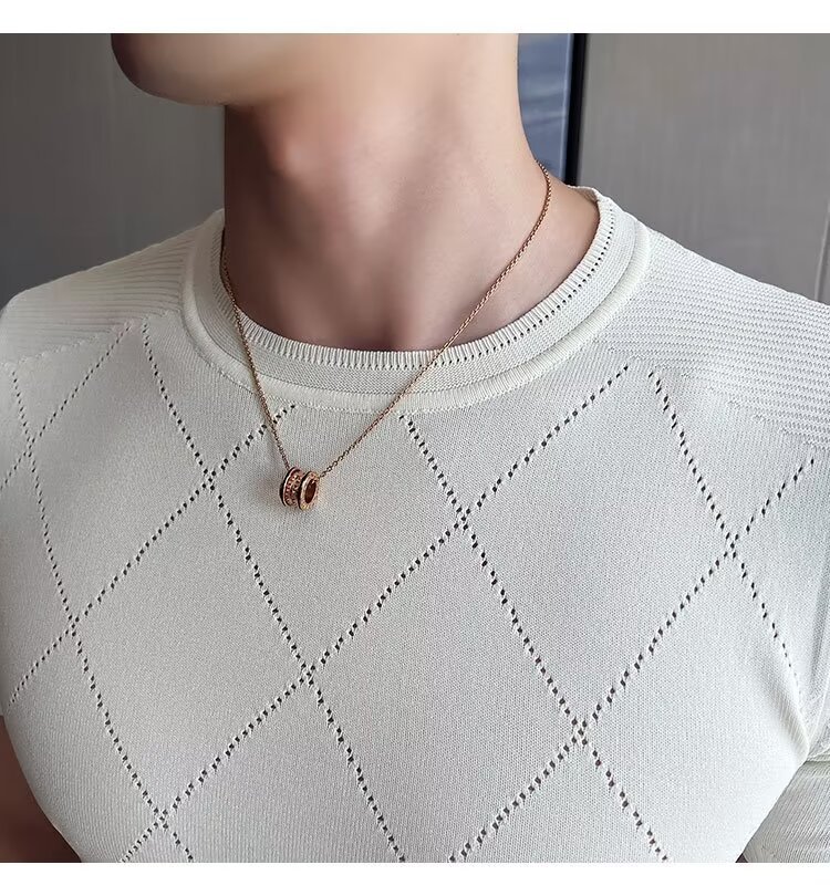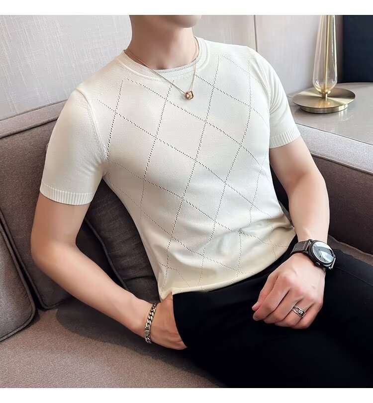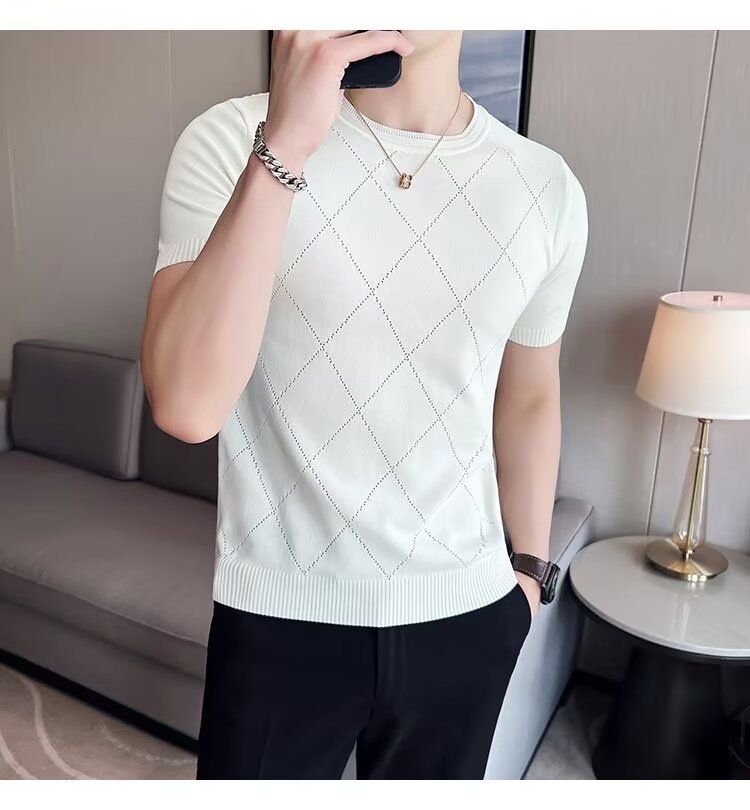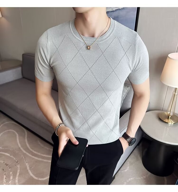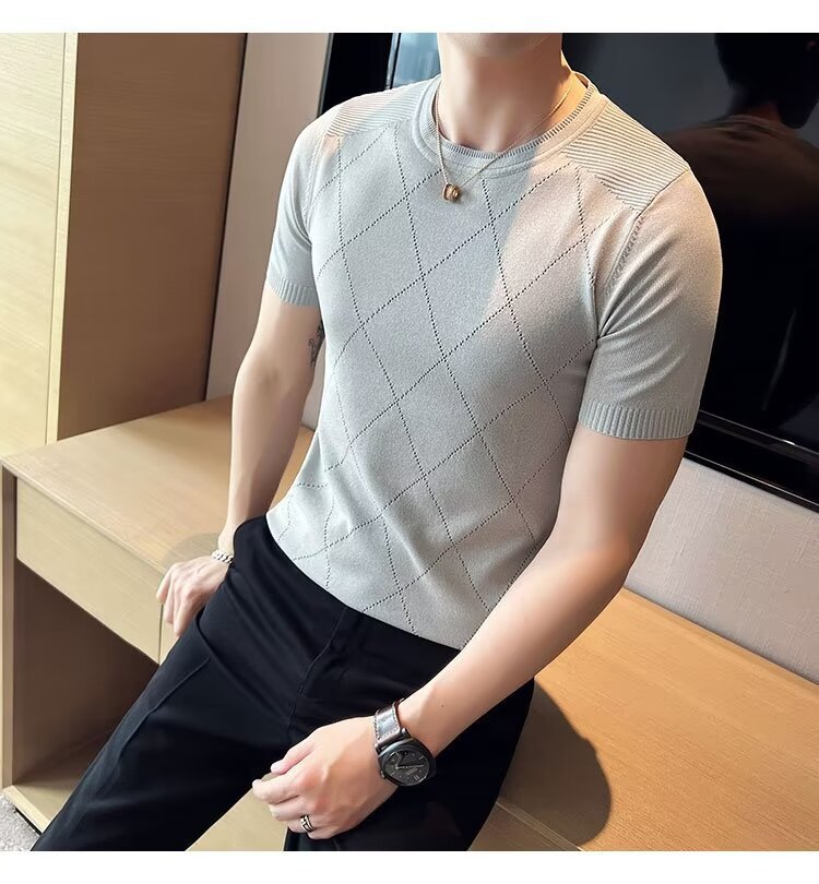 2024 년 여름 새로운 아이스 실크 자카드 크루 넥 반팔 남성 니트 반팔 티셔츠 봄과 여름 슬림 핏 스트레치베이스 셔츠