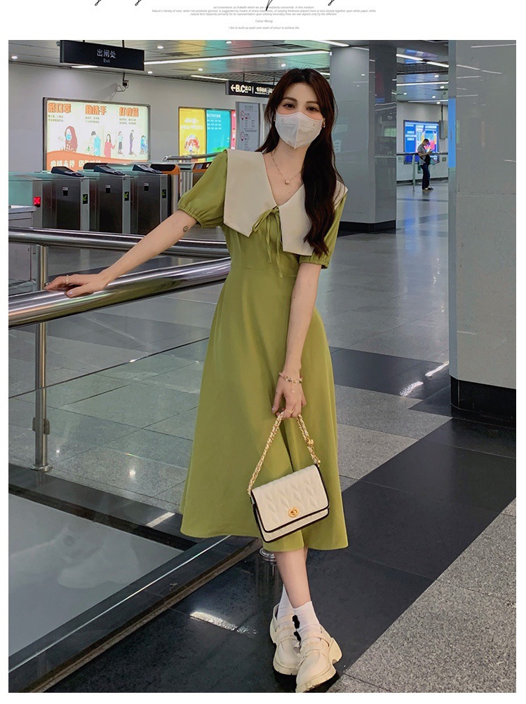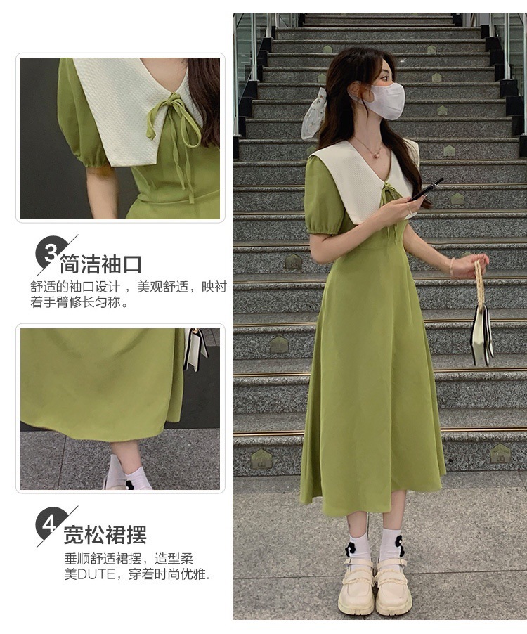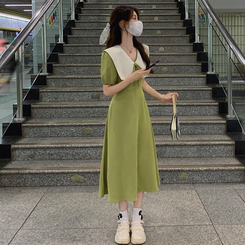 티 브레이크 프랑스 인형 칼라 원피스 여성 여름 버블 슬리브 허리 레이스 업 기질 부드러운 첫 사랑 오버 더 무릎 긴 원피스스토어 가기