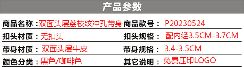 本产品双面为头层牛皮,面部是黑色荔枝纹底部是咖啡色,本产品链接是皮带身的价格不含扣头,如果需要扣头可以联系客服另我议价。