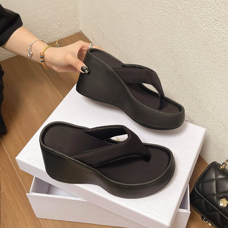 키 작은 여성용 여름 2024 신상 두꺼운 밑창 슬리퍼, 외출용 샌들, 실크 새틴 플랫폼 슬리퍼, 웨지힐 샌들스토어 가기