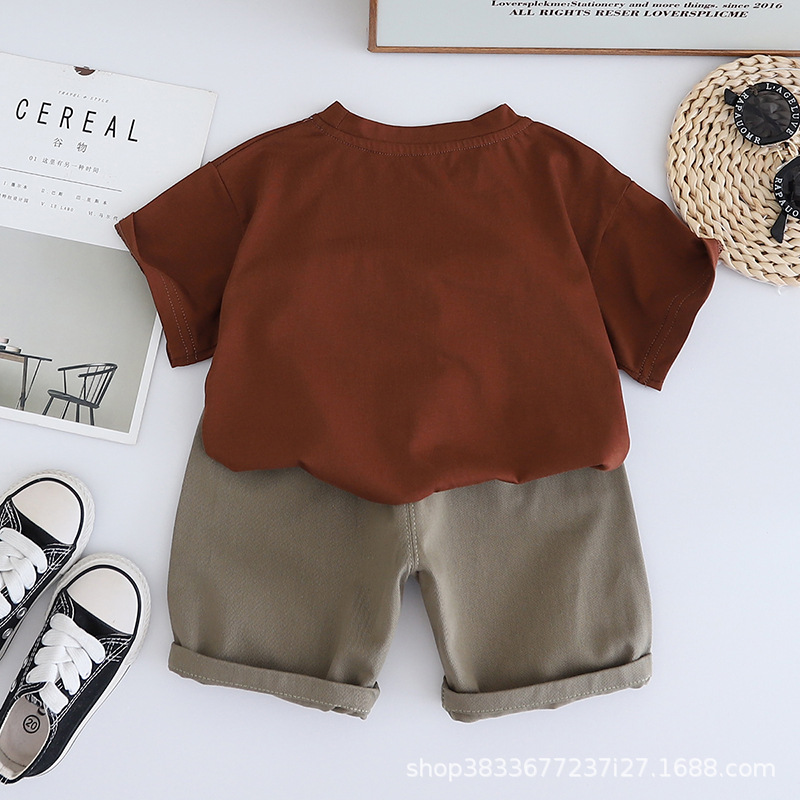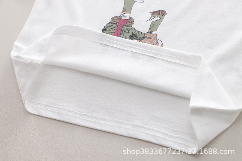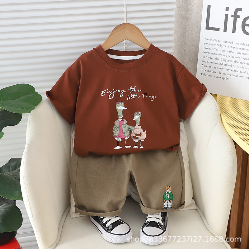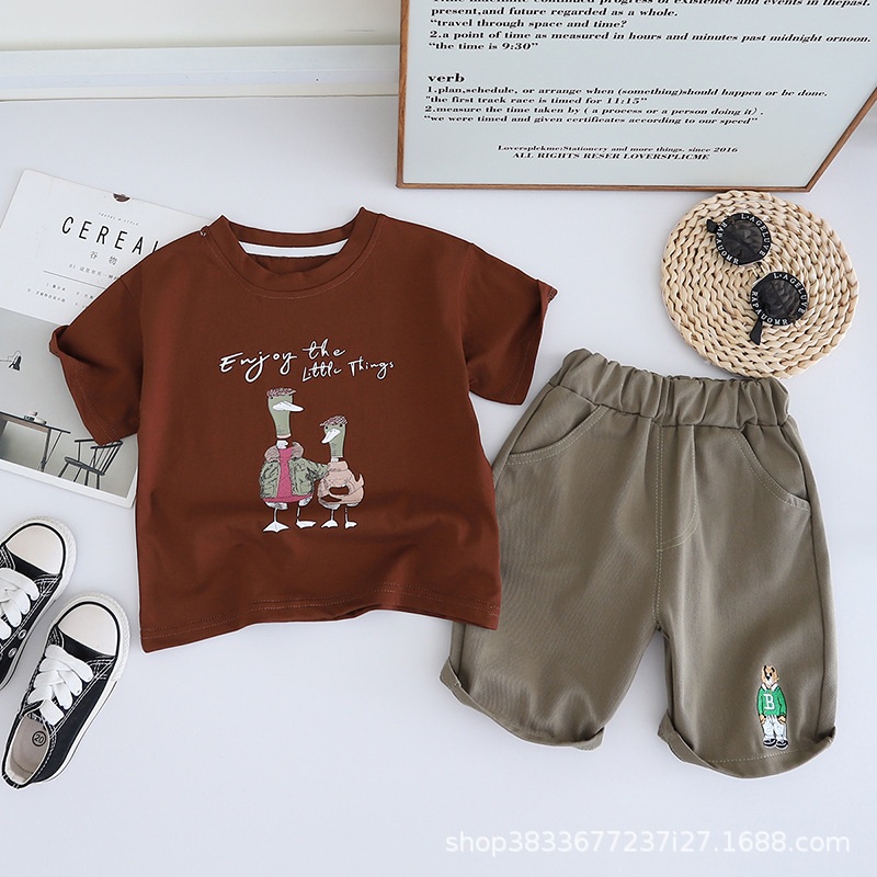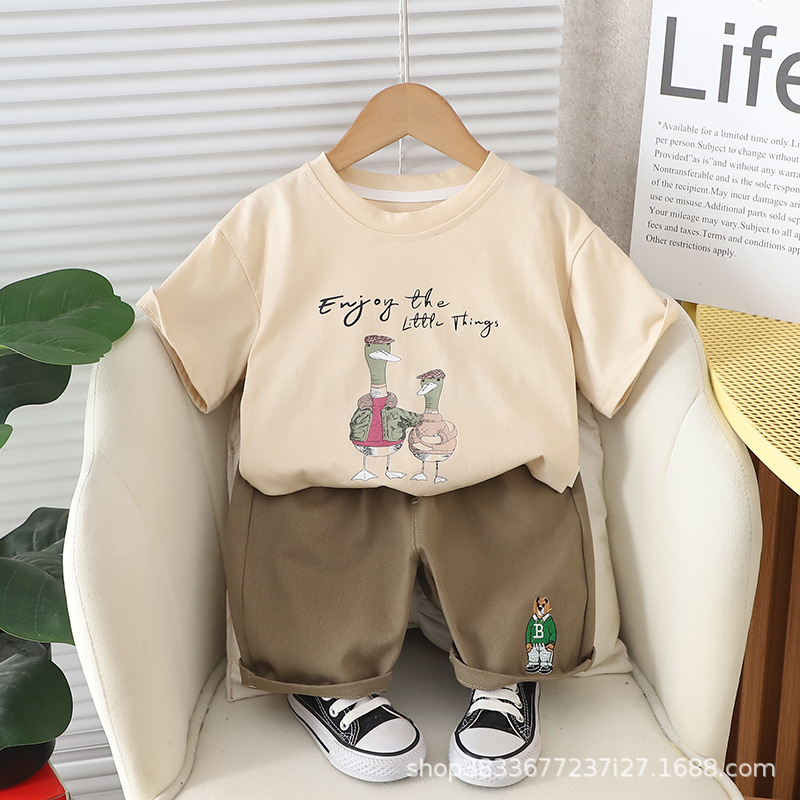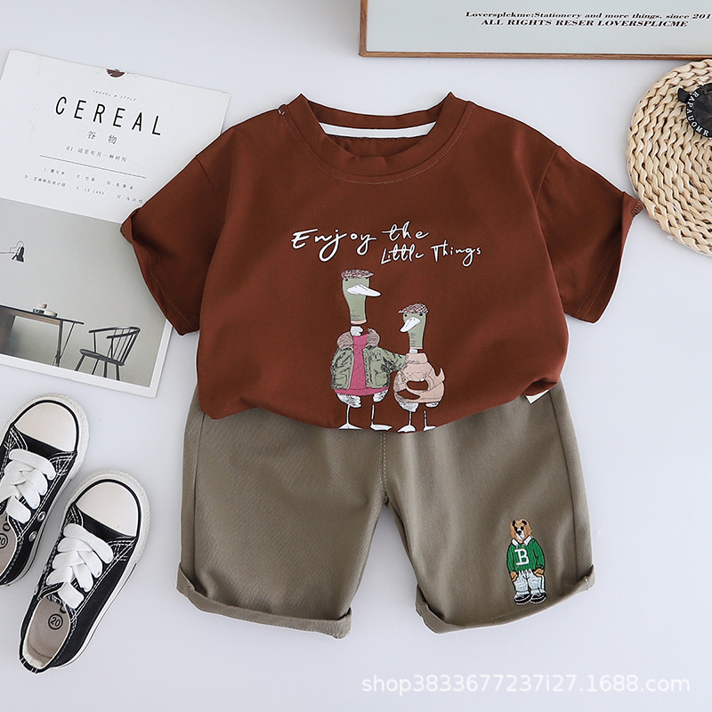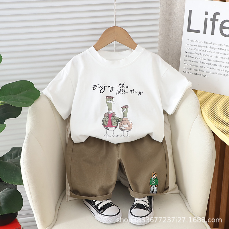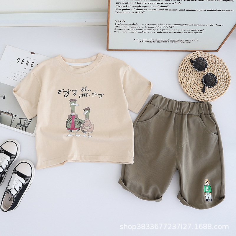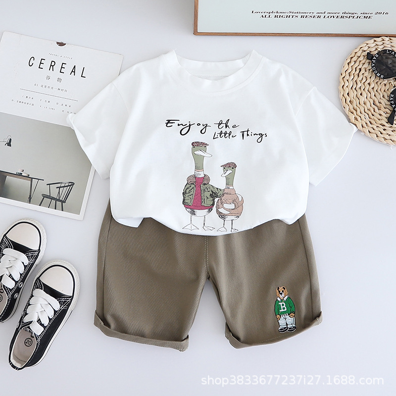 어린이 여름 승무원 세트 프린트 오리 반팔 티셔츠 캐주얼 남성 아기 1-3 어린이 옷 여름 투피스 세트