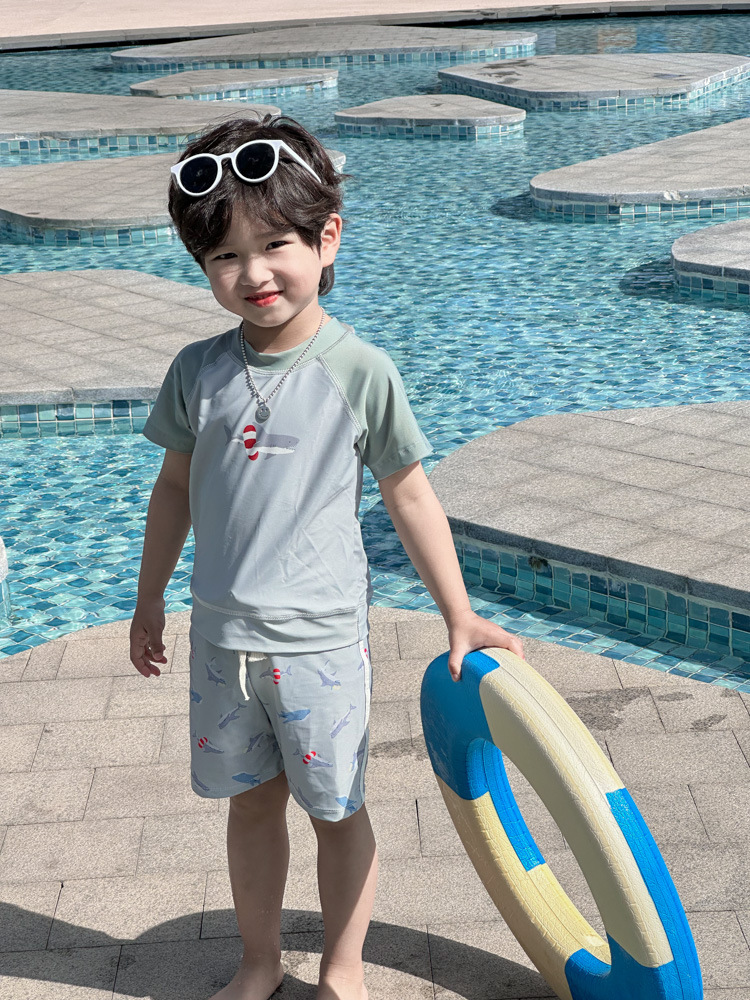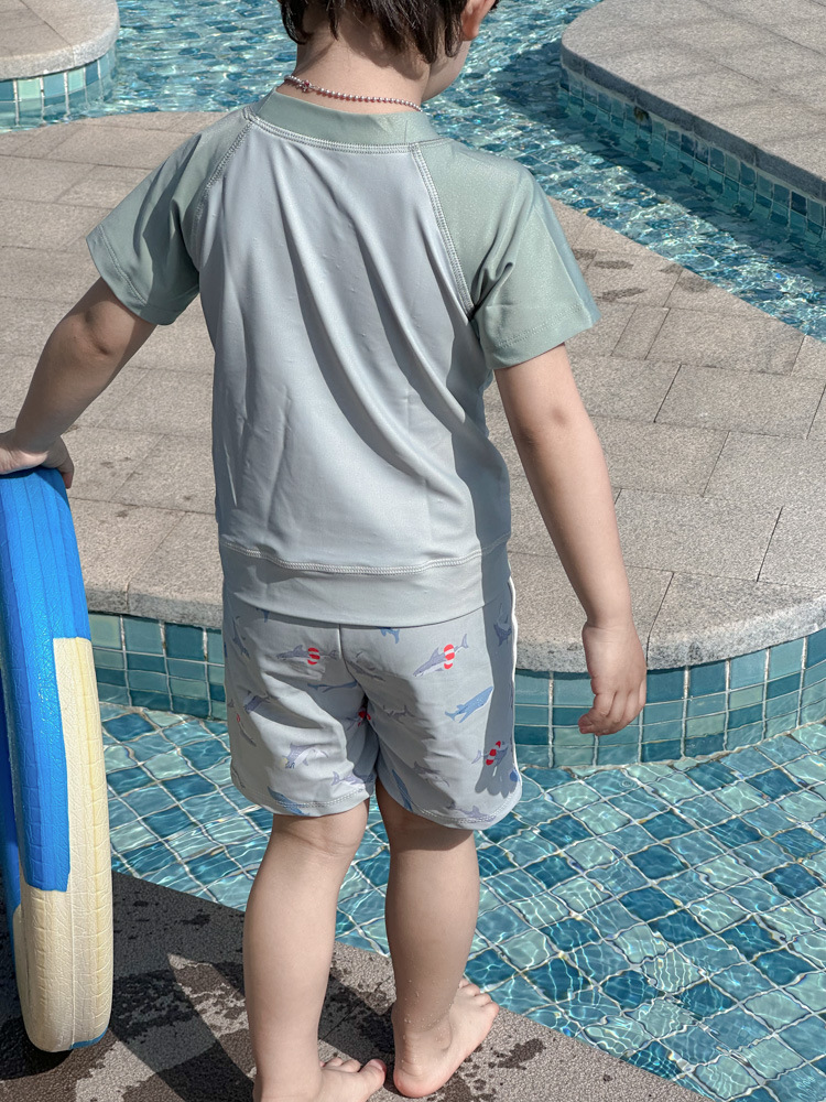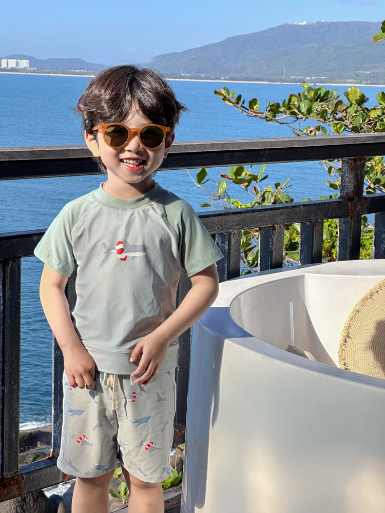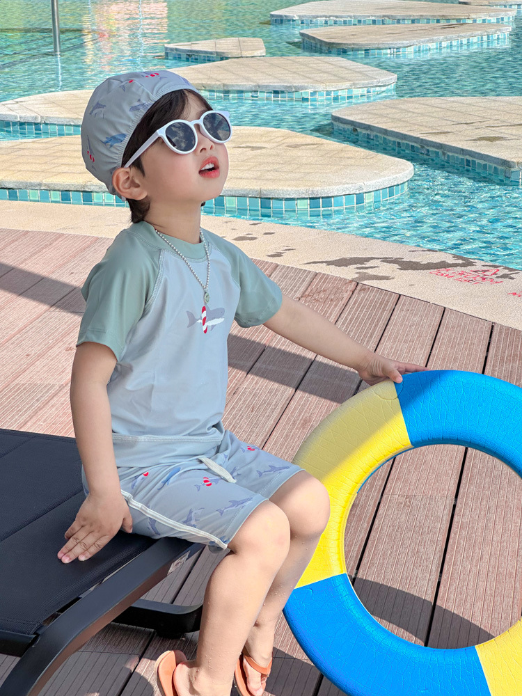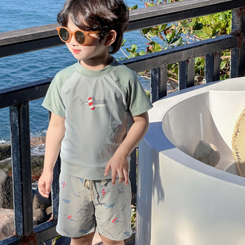 새로운 어린이 아기 여름 수영복 반팔 수영복 바지 세트 빠른 건조 귀여운 상어 온천 해변 옷