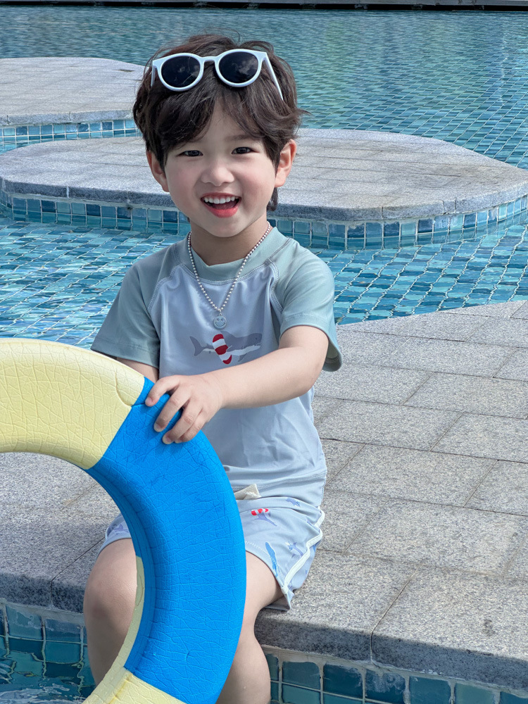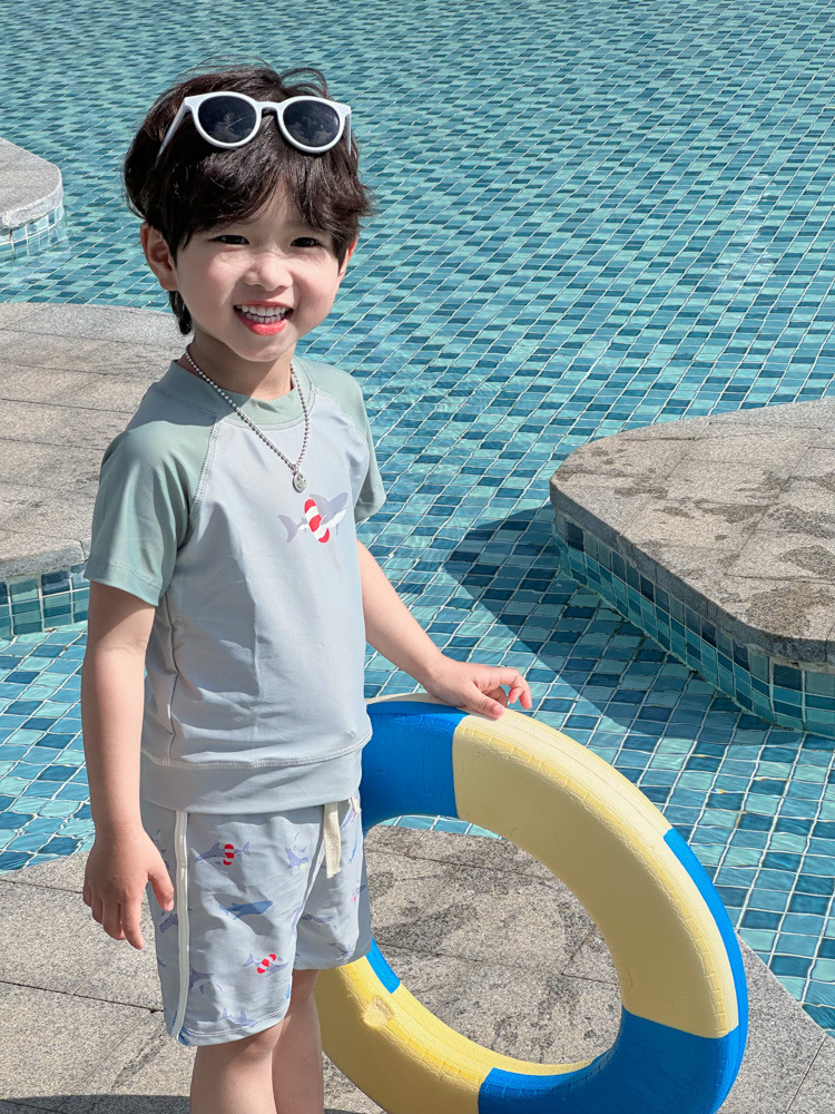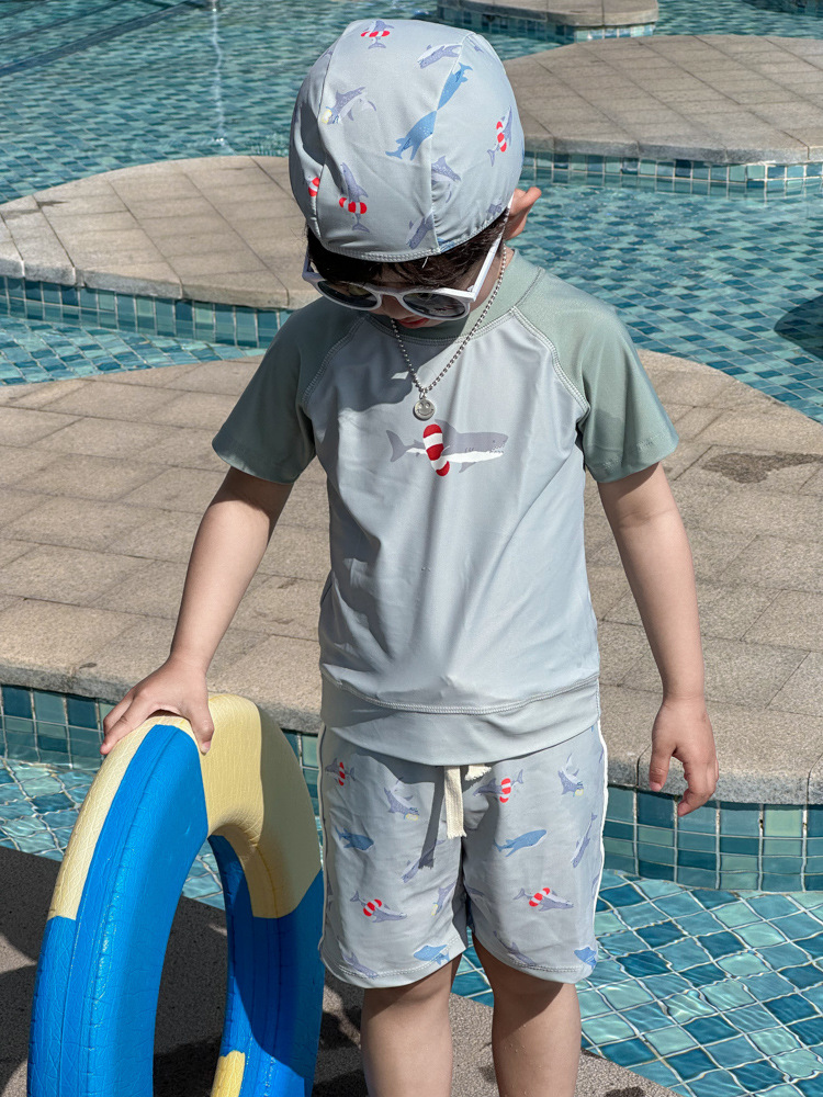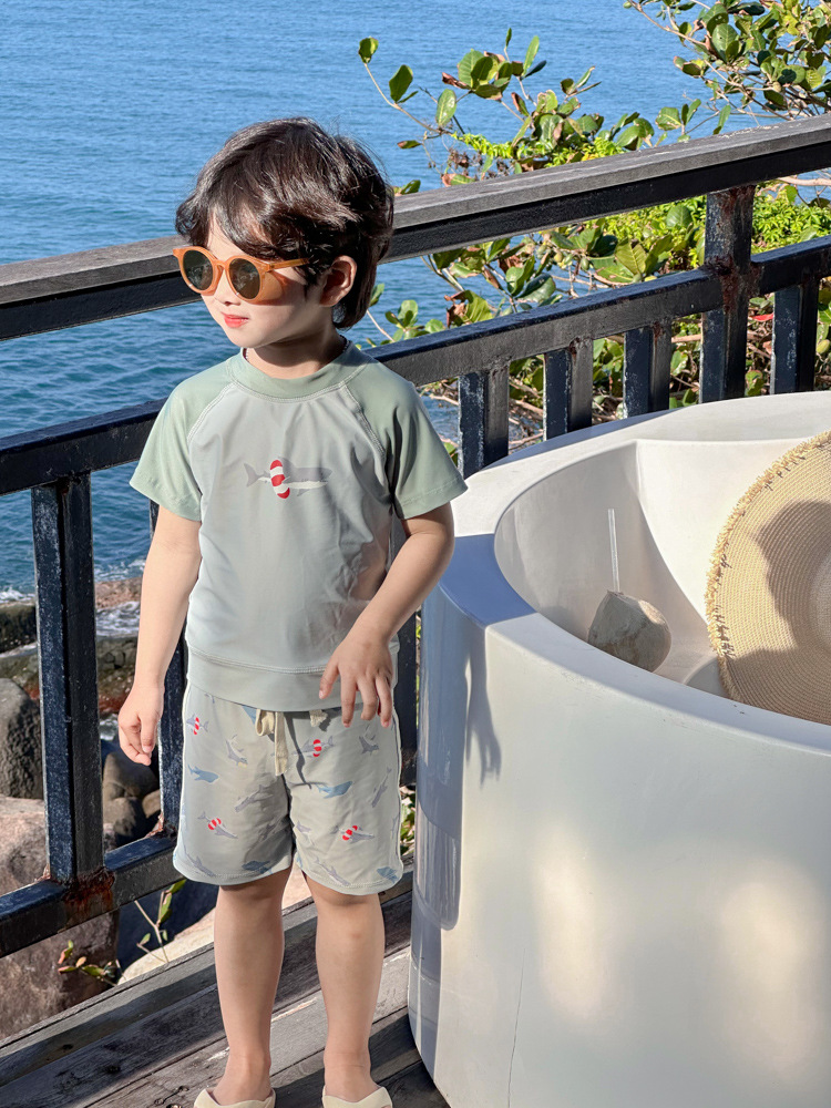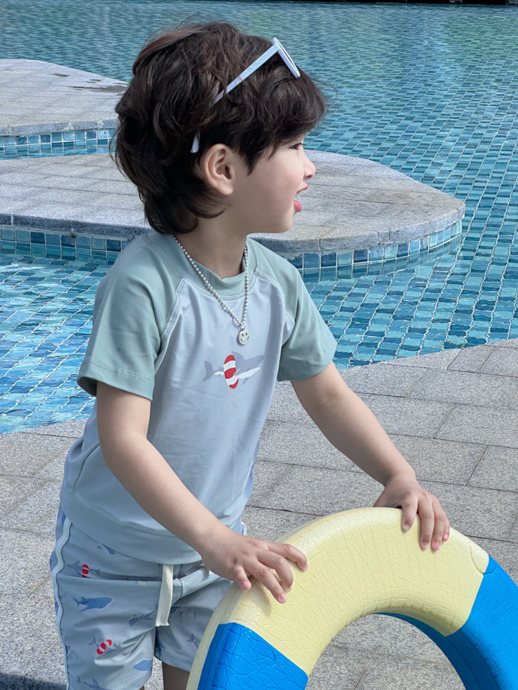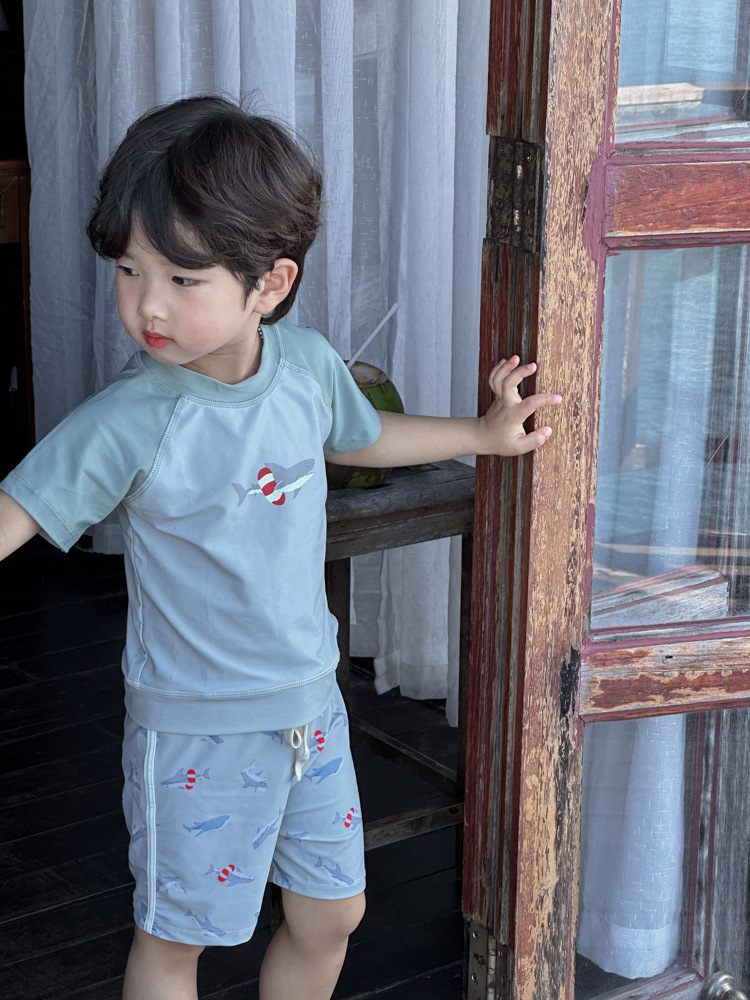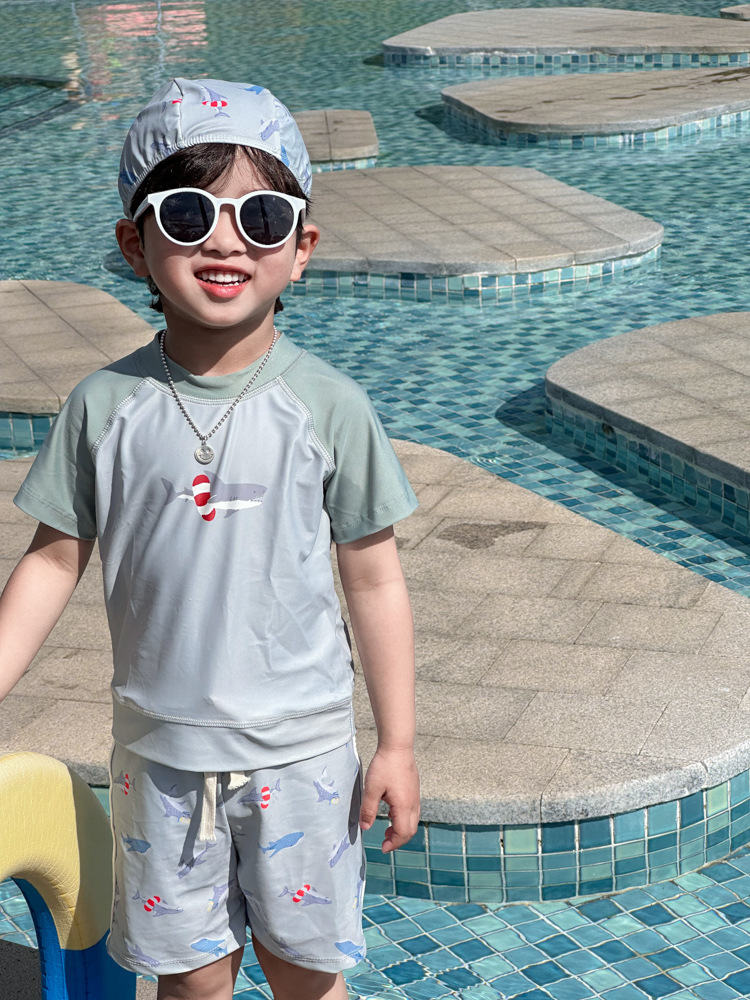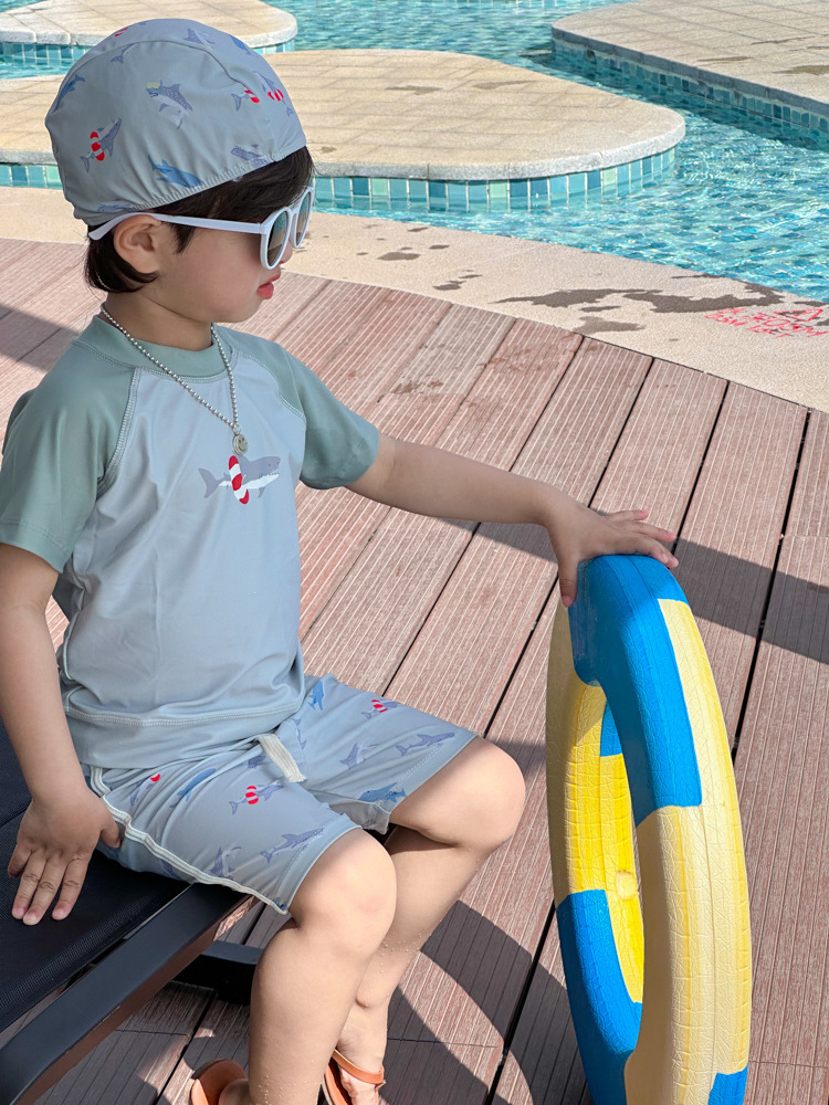 새로운 어린이 아기 여름 수영복 반팔 수영복 바지 세트 빠른 건조 귀여운 상어 온천 해변 옷스토어 가기