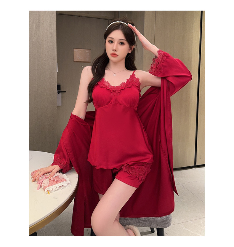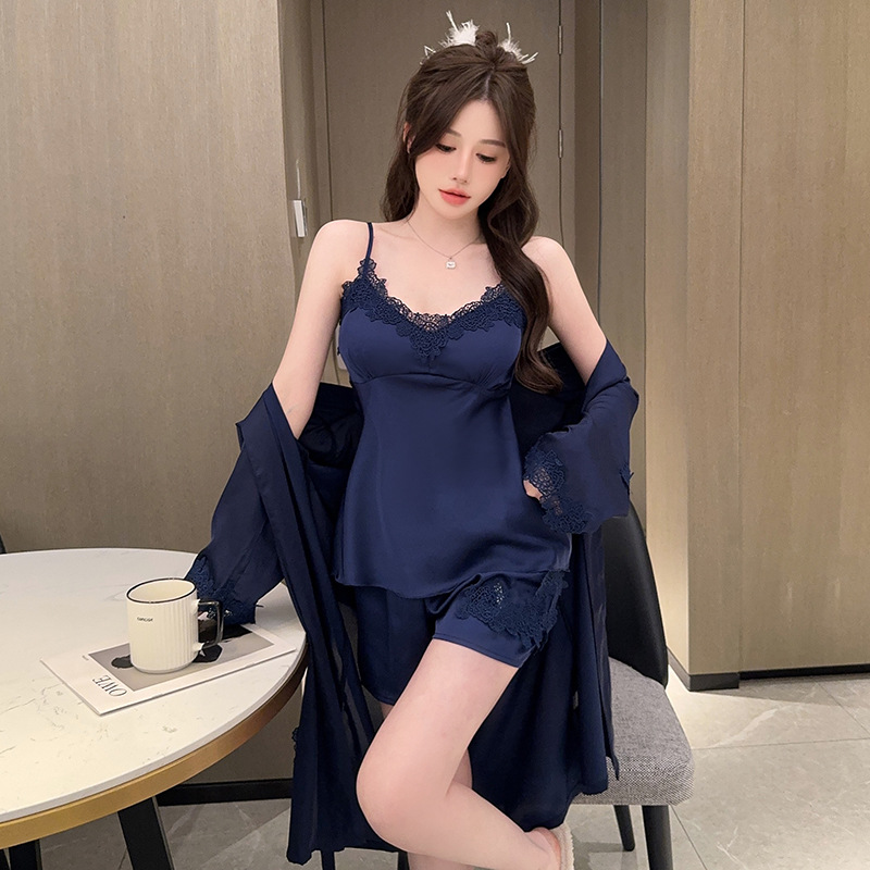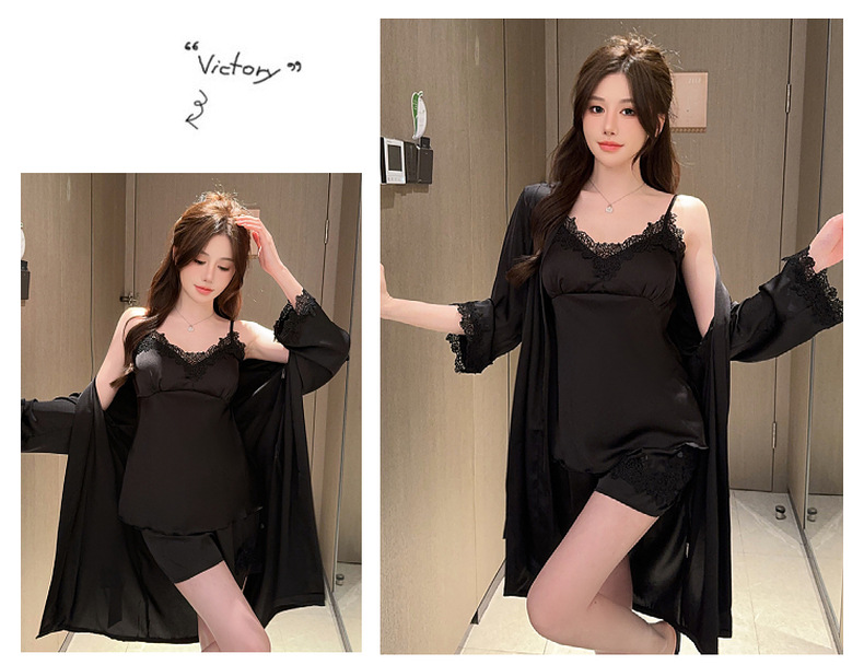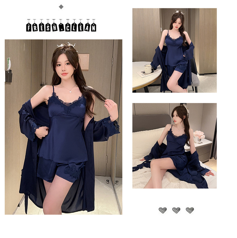 잠옷 여성용 여름 아이스 실크 섹시한 뜨거운 성인 봄과 가을 긴 소매 얇은 여성용 잠옷 3 피스 세트스토어 가기