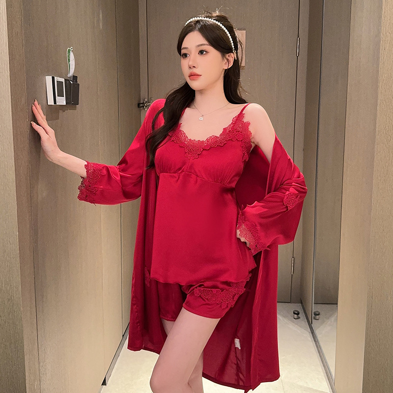 잠옷 여성용 여름 아이스 실크 섹시한 뜨거운 성인 봄과 가을 긴 소매 얇은 여성용 잠옷 3 피스 세트