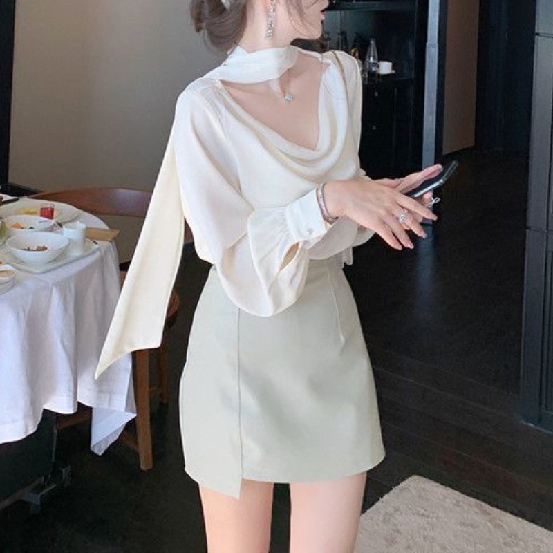 우아한 리본 퍼프 소매 새틴 화이트 셔츠 여성 2026 봄 신상 디자인 감각적인 틈새 긴팔 독특한 상의스토어 가기