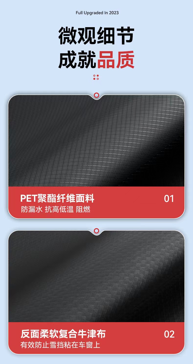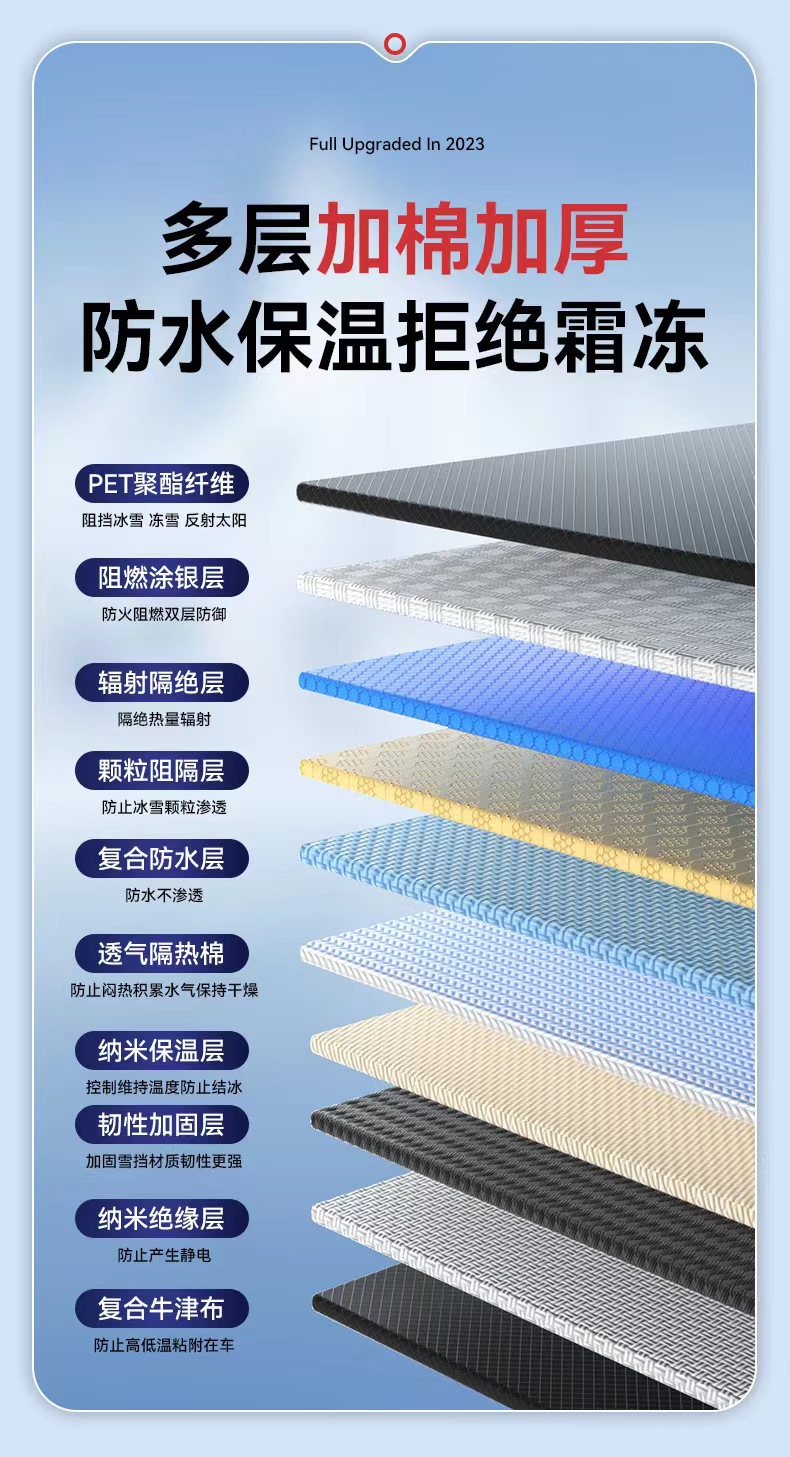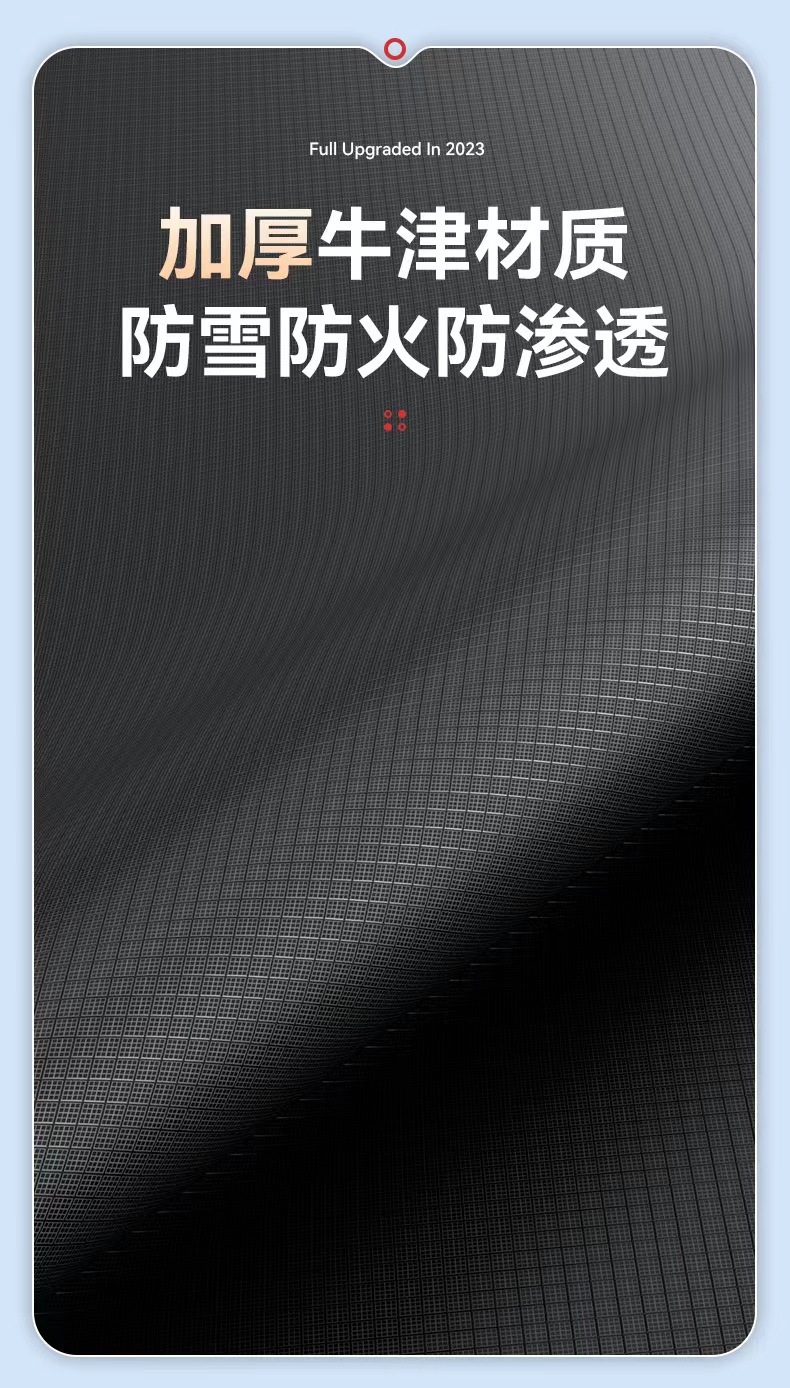 1、牛津布材质,不伤车漆,防晒、隔热、防雨雪、防风尘、防划痕、抗拉力强。
